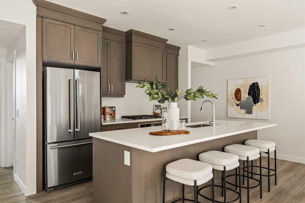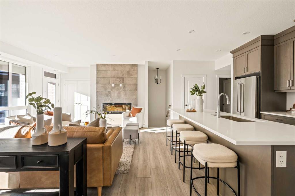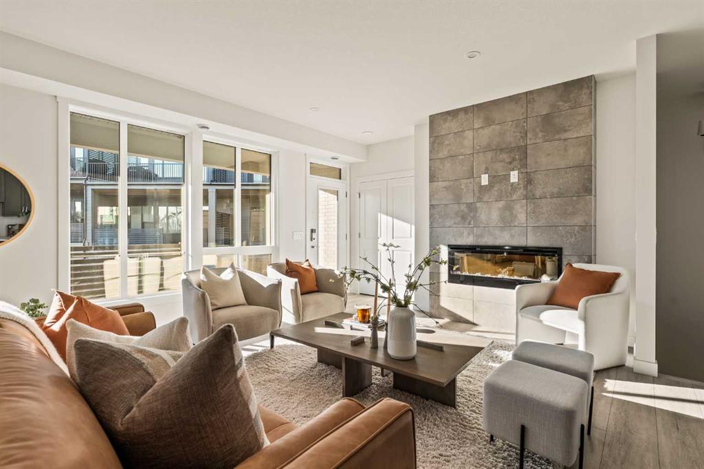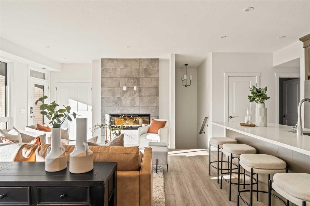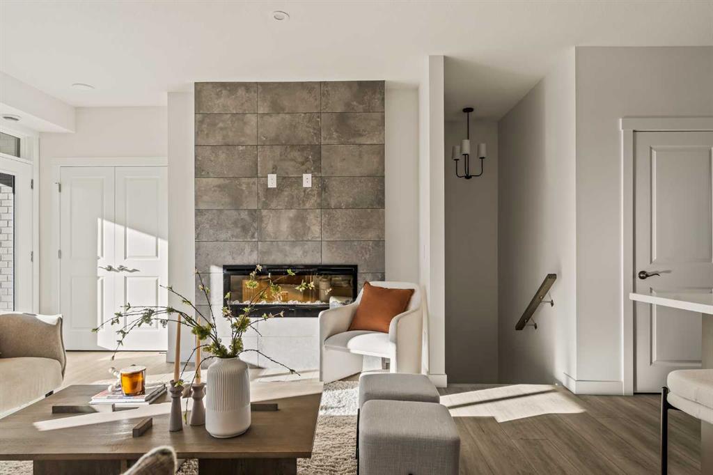 Welcome to the Regent at Crown Park, a beautifully crafted bungalow-style townhome offering true single-level living without compromise! This unique design combines the benefits of a bungalow lifestyle without compromising on storage or garage space, all while moving into a brand new beautiful home with full warranty! Thoughtfully designed with down-sizers in mind, this maintenance-free residence is perfect for those who travel or simply prefer a lock-and-leave lifestyle free from exterior upkeep, landscaping, or snow removal. This brand-new 3-bedroom, 2-bathroom home offers nearly 1,300 sq.ft. of well-planned living space on one level, plus a lower level featuring extensive storage and access to the oversized double garage. At the heart of the home, a stunning open-concept living area was created for effortless entertaining. The central kitchen seamlessly connects the living and dining spaces while a full wall of south-west facing windows floods the interior with natural light all year long. Timeless finishes include warm-tone natural wood shaker maple cabinetry, light quartz countertops, and a premium built-in appliance package featuring a gas cooktop, built-in oven, and chimney hood fan - ensuring the chef is always part of the conversation. A striking floor-to-ceiling tile fireplace anchors the great room, offering a warm focal point and comfortable seating for gatherings. The spacious dining area easily accommodates a full table and buffet, providing exceptional furnishing flexibility. Privately positioned at the rear of the home, the primary retreat features a generous walk-in closet and spa-inspired ensuite with dual vanities and a tiled walk-in shower with 10mm glass. A centrally located laundry room with upper cabinetry and folding counter enhances everyday convenience while naturally separating the primary suite from the secondary bedrooms. Two additional bedrooms and a full bathroom provide versatility for guests, a home office, media room, or creative space - while maintaining excellent resale appeal. The lower level offers a large storage room and an oversized utility room (approx. 17' x 7') ideal for hobbies or seasonal storage. A double closet and oversized double attached garage completes the interior features on the lower level. Step outside to your private covered southwest-facing patio spanning over 26 feet that overlooks the park and includes a gas line, hose bib, and A/C rough-in - the perfect setting for relaxed outdoor living and future upgrades in mind. Bungalow-style townhomes with double attached garages are exceptionally rare. Enjoy added peace of mind with comprehensive builder warranty coverage plus Alberta New Home Warranty. Located minutes from downtown and surrounded by established amenities, Crown Park offers the confidence of a mature community paired with the comfort of a brand-new home. This is one of the very last brand new opportunities remaining - a truly rare opportunity you won’t want to miss!