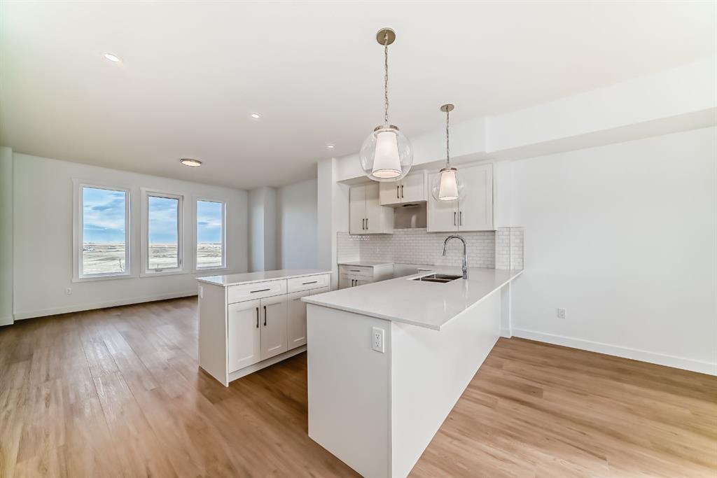 Welcome to your brand new, never-lived-in townhome in the heart of Chestermere! This fully upgraded home offers 3 spacious bedrooms, 2.5 bathrooms, a versatile main-floor den, and a double car garage — perfect for families, professionals, or anyone who values flexible living space. Tucked away in a quiet, family-friendly neighbourhood, you’ll love the sense of peace and comfort this home provides. The main level features a bright den — ideal for a home office, guest suite, or even a personal gym. Head upstairs to the open-concept second floor, where sunlight fills the living area with its high ceilings and modern design. The gourmet kitchen boasts quartz countertops, stainless steel appliances, full-height cabinetry, and a spacious dining area that flows seamlessly into the living room — complete with access to your private balcony, perfect for morning coffee or evening relaxation. On the upper level, the primary suite includes a large walk-in closet and a luxurious 5-piece ensuite. Two additional bedrooms share an upgraded 4-piece bath, and convenient upper-floor laundry makes daily life a breeze. With luxury vinyl plank flooring, modern finishes, and designer selections throughout, this move-in-ready home delivers incredible value. Located just minutes from Stoney Trail, Costco, golf courses, schools, parks, and Lake Chestermere, this townhome combines comfort, style, and unbeatable convenience. Don’t wait — book your showing today and experience Chestermere living at its best!