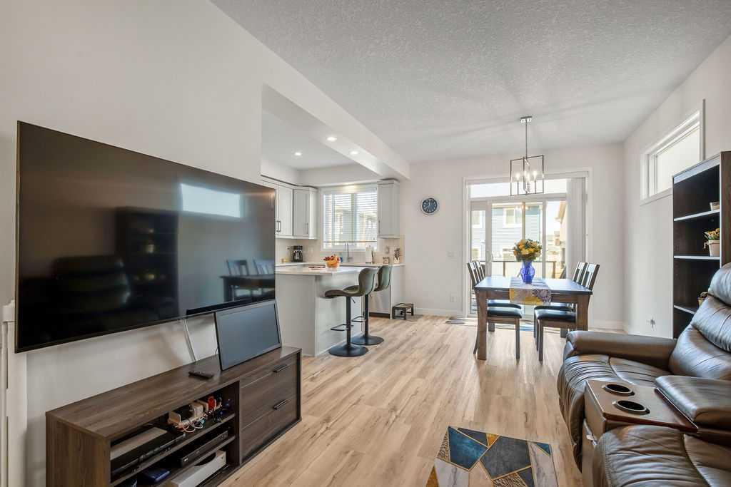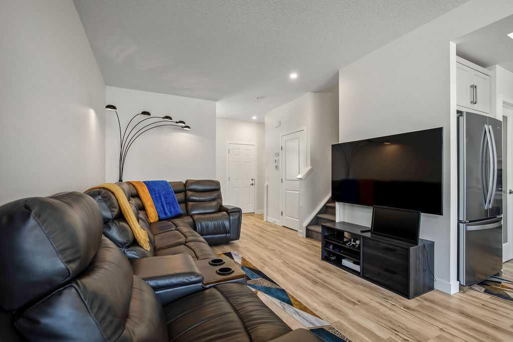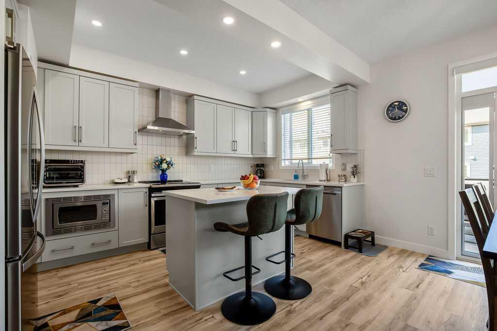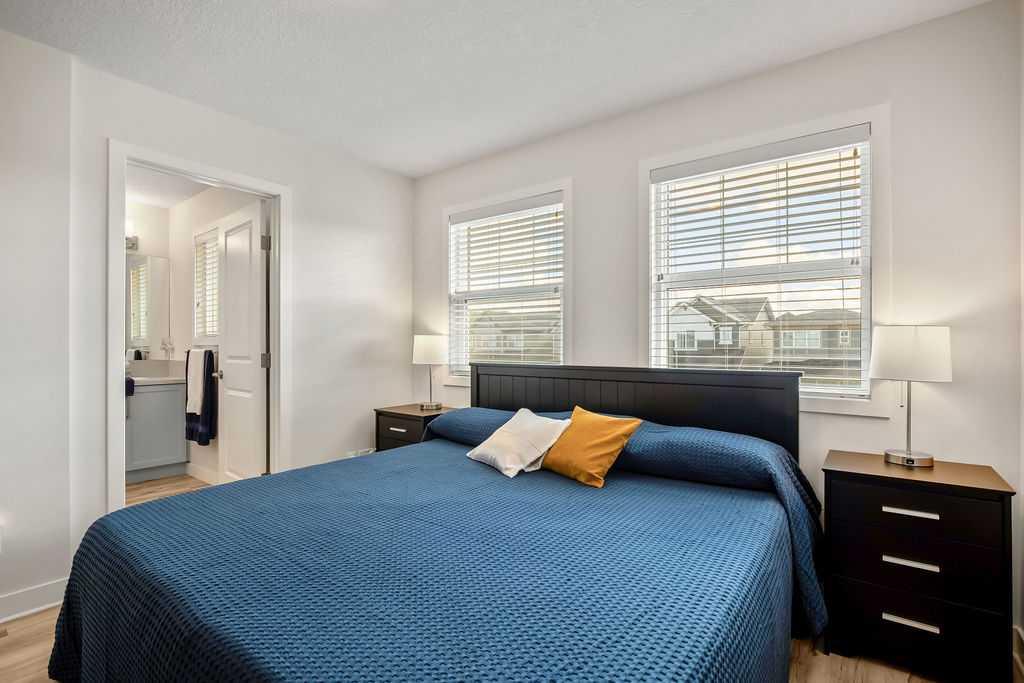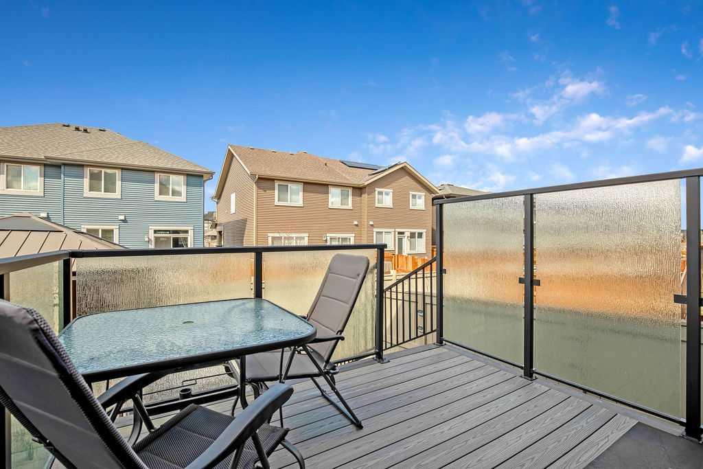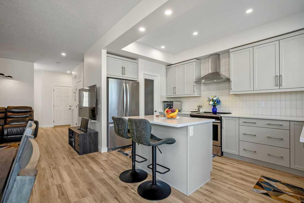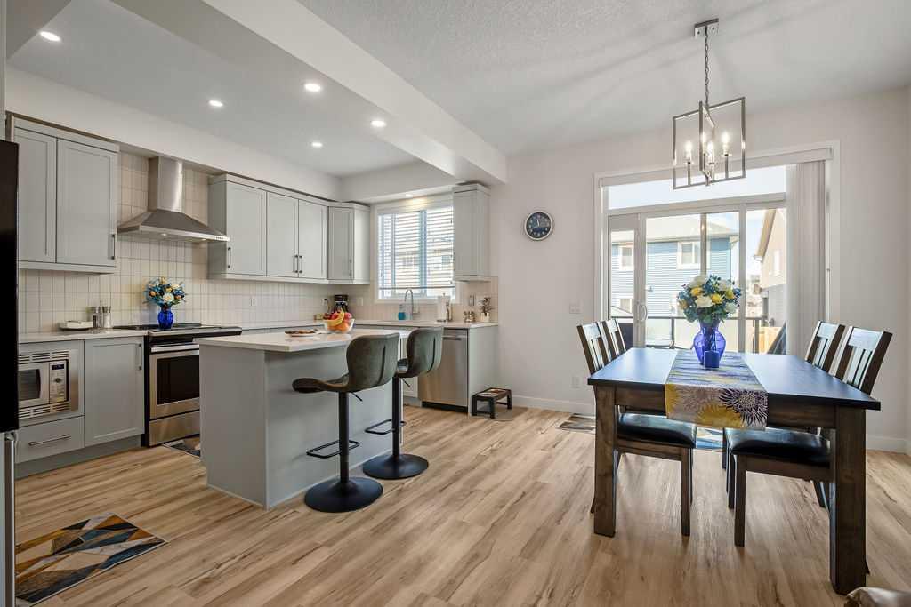 Stylish, upgraded, and truly move-in ready, this Jayman-built Aurora half duplex in the sought-after community of King’s Heights offers over 2,000 sq ft of beautifully developed living space designed for modern living. Step inside to a bright, open-concept main floor featuring durable luxury vinyl plank flooring and a spacious living area that seamlessly connects to the dining space and contemporary kitchen—perfect for both everyday living and entertaining. The kitchen is a standout with quartz countertops, a central island with flush eating bar, upgraded lighting, and a full stainless steel appliance package including a French door fridge with icemaker, glass-top stove, built-in dishwasher, designer hood fan, and built-in microwave. Upstairs, you’ll find three generously sized bedrooms, including a comfortable primary retreat complete with a large walk-in closet and private 4-piece ensuite with dual vanities. Convenient upper-level laundry adds to the home’s functional design. The fully finished basement expands your living space with a large family room, a versatile flex area, and a 2-piece bathroom. The flex space offers excellent potential to be converted into a fourth bedroom with the simple addition of a door—ideal for guests or a growing family. Outside, enjoy your own low-maintenance backyard oasis, thoughtfully designed for relaxation and entertaining. Features include a composite deck, BBQ gas line, fully fenced yard, gazebo, storage shed, and a premium hot tub (Master Spa Twilight Series 8.25, seating up to 7). Designed with efficiency in mind, the home includes 8 builder-installed solar panels to help offset energy consumption and reduce utility costs. Additional highlights include central air conditioning, a single attached garage, and a welcoming front foyer. Perfectly located close to parks, schools, shopping, and pathways, this home delivers exceptional value in one of Airdrie’s most family-friendly communities. With upgrades already complete, all that’s left to do is move in and enjoy. This is one you don’t want to miss!