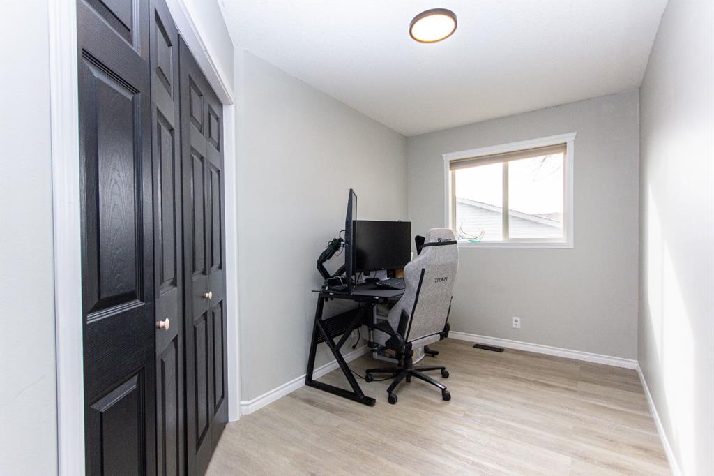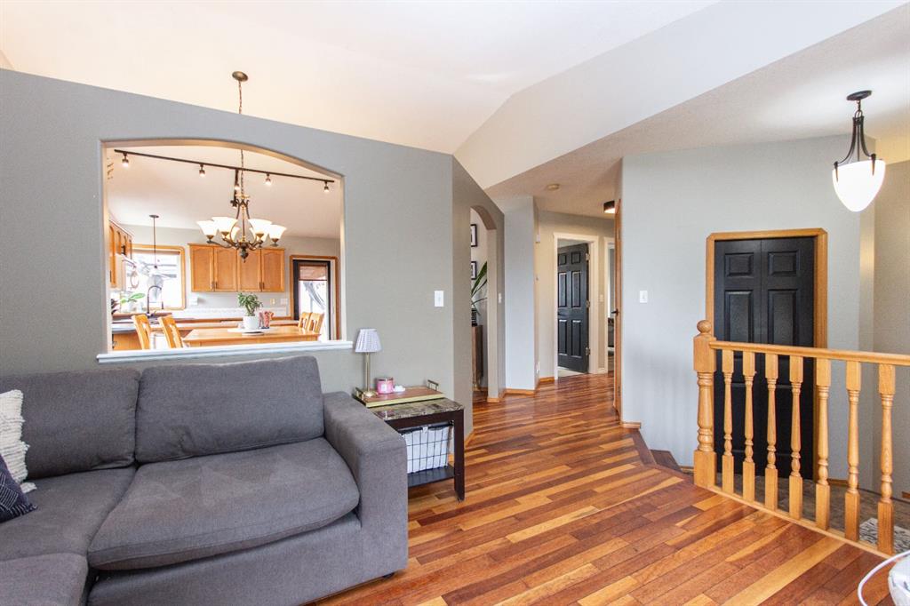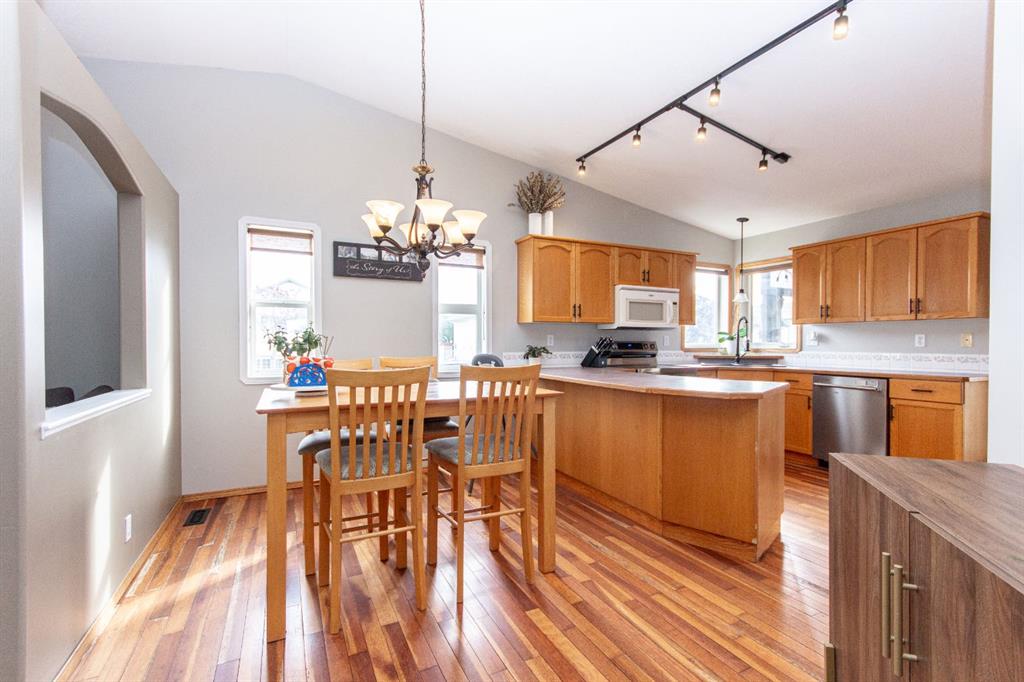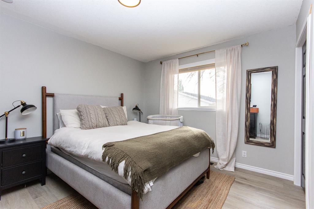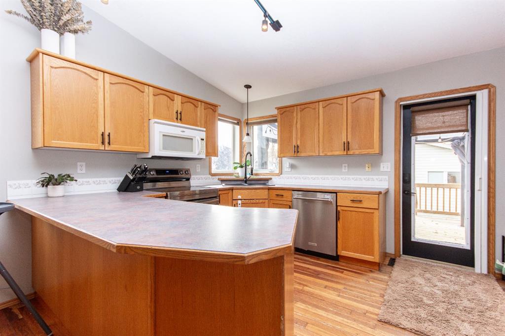 Welcome to this fully finished bungalow with a double detached garage. Step into the front entry that opens to a welcoming living room with hardwood floors and views of the front yard. The floor plan flows into the dining area and kitchen, where you’ll find an eating bar, pantry, plenty of cabinet space, and easy access to the large back deck for summer BBQs. Down the hall, the primary bedroom offers dual closets, alongside two additional bedrooms, one with washer/dryer hookups in the closet and a 4-piece bathroom. The fully finished basement expands your living space with a spacious family room featuring a cozy gas fireplace, a fourth bedroom, a second 4-piece bathroom, and a large laundry/storage room. Enjoy your private, fully fenced backyard featuring a double detached garage, a convenient rear gate for RV parking, and even a removable dog run off the deck, perfect for pets or flexible yard use. This 4-bed, 2-bath bungalow is move-in ready and offers everything your family needs in a great location.