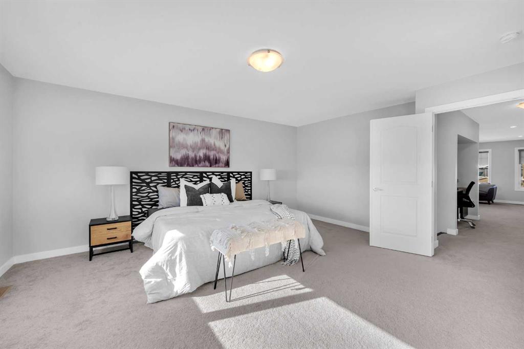 Welcome to this exceptional executive residence located in the prestigious, award-winning community of Coopers Crossing in Airdrie. Perfectly positioned on a massive 7,000+ sq ft pie-shaped lot, this fully developed walk-out home offers over 3,700 sq ft of refined living space, combining luxury finishes, thoughtful upgrades, and outstanding everyday convenience. One of the standout advantages of this property is its exceptional connectivity—providing quick and easy access to Calgary, making it ideal for commuters and professionals. Families will appreciate the three nearby schools and the convenience of a shopping center just minutes away, offering a grocery store, daycare, Shoppers Drug Mart, medical and dental clinics, and more—everything you need within close reach. The main floor is designed for both elegance and functionality, featuring a rare main-level bedroom and full bathroom, ideal for guests, extended family, or multigenerational living. At the heart of the home is the chef-inspired gourmet kitchen, showcasing high-end appliances, upgraded cabinetry, quartz countertops, and a striking waterfall island—perfect for entertaining or daily family life. A built-in workstation on first floor provides a dedicated space for working or studying from home, while custom roller shades add style and privacy throughout. Upstairs, you’ll find a generous bonus room, perfect for family movie nights or a kids’ retreat, along with well-appointed bedrooms and a spacious primary suite designed as a true sanctuary. The primary suite is a luxurious escape, offering expansive space, serene views, and a well-appointed walk-in closet. The ensuite bath feels like a private spa, complete with upscale finishes and a thoughtfully designed layout for ultimate relaxation. The fully finished walk-out basement offers impressive 9-foot ceilings and flexible living space with excellent future suite potential, making it ideal for extended family or additional income opportunities. This home is loaded with over $100,000 in premium upgrades, including central air conditioning, water softener, reverse osmosis water system, and 15 solar panels, delivering enhanced comfort, efficiency, and long-term savings Offering luxury, space, sustainability, and unbeatable convenience, this remarkable home delivers a lifestyle that truly stands out in today’s market. A rare opportunity in Coopers Crossing—book your private showing today.