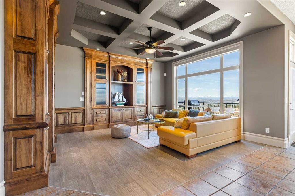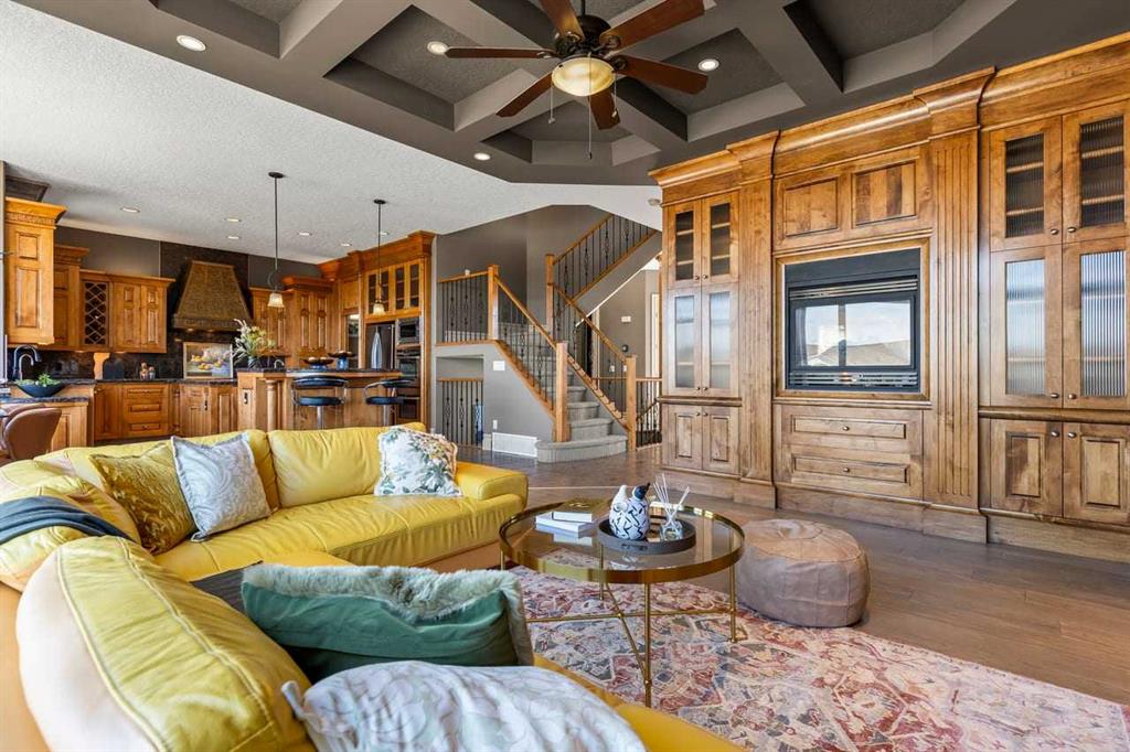 Panoramic Rocky Mountain views take center stage in this exceptional former show home, creating a sense of space and calm that is immediately felt the moment you enter. Offering over 4,000 sq. ft. of total living space, the spacious main floor is enhanced by 10 ft ceilings and an open-concept layout designed to maximize light and sightlines. Expansive windows frame the landscape like artwork, with open skies, rolling horizon, and distant peaks visible throughout the main living areas. The living room is both inviting and refined, anchored by a coffered ceiling and a substantial custom wood built-in that speaks to the level of craftsmanship throughout. Engineered hardwood flooring and the seamless connection to the dining area create a space equally suited for everyday living and entertaining. A separate main floor sitting area provides additional flexibility for gatherings or quiet retreat. Originally built by Ashton Luxury Living, the home reflects an exceptional level of detail and finish throughout. The kitchen is thoughtfully designed with ceiling-height solid wood cabinetry, a generous granite island, high-end stainless steel appliances, a custom range hood, full-height backsplash, durable tile flooring, and a walk-in pantry for exceptional storage. The main floor balcony, accessed from the dining area, offers a seamless indoor-outdoor transition, perfect for enjoying the mountain views. A functional main floor laundry room with sink adds everyday convenience. Upstairs, the primary suite serves as a private retreat, featuring a cathedral ceiling, with views of the Rocky Mountains, a spacious 5-piece ensuite, and a walk-in closet with custom cabinetry. The ensuite is beautifully finished with furniture-style vanities, detailed millwork, and a deep soaker tub within a fully tiled surround. The bonus room is a standout feature, enhanced by extensive built-in cabinetry that adds both character and highly functional storage, ideal for a media room or family space. The fully developed walk-out basement offers a bright and functional extension of the home, with large windows creating an inviting atmosphere. A spacious living area is complemented by a wet bar with granite countertops, ideal for entertaining. Featuring durable flooring, a full bathroom, and direct outdoor access, this level provides excellent flexibility for guests or extended family. Additional features include an oversized double garage, a new hot water tank (2023), recently updated second-floor windows, and a premium drinking water filtration system professionally installed by Star Industries Calgary, conveniently accessed via a dedicated nozzle at the kitchen sink. Ideally located within walking distance to schools and with access to nearby walking and biking pathways, convenient access to the Shane Homes YMCA, C-Train station, Stoney Trail, and Crowchild Trail. A rare combination of enduring quality, thoughtful design, and truly exceptional views - explore the 3D tour for a complete experience.