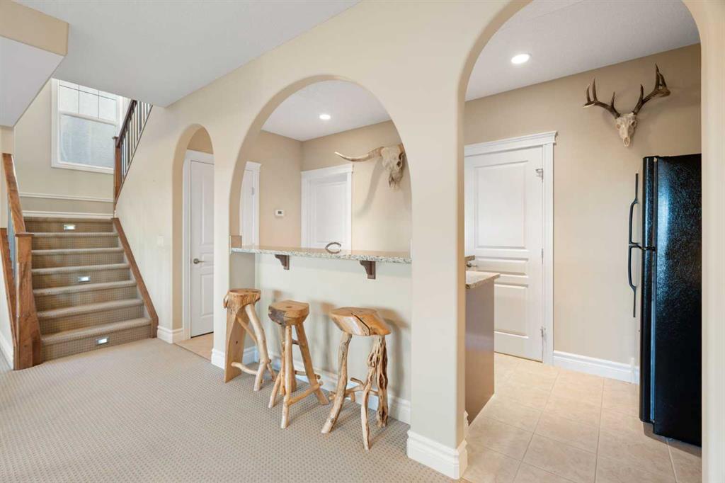 Welcome to this beautifully landscaped 3-bedroom bungalow perfectly situated on a premium lot in the community of Lakes of Muirfield. Located across from the golf course and backing onto a canal with mature trees, this property offers exceptional privacy and natural beauty. Bright open-concept layout with vaulted ceilings, large windows, and seamless flow between living, dining, and kitchen areas — ideal for everyday living and entertaining. The spacious kitchen boasts modern finishes, plenty of cabinetry, and a large island ideal for gathering. Step onto a large, raised deck for convenient barbecuing or outdoor relaxing with a view. The primary suite offers a relaxing retreat with a walk-in closet and a private ensuite. Two additional bedrooms provide ample space for family. With a den that is ideal for a home office. The laundry room is conveniently located on the main floor. The fully finished walk-out basement expands your living space with a large recreation area, wet bar, and easy access to the backyard oasis. Step out onto the lower patio and take in the peaceful canal view surrounded by mature trees and meticulous landscaping. This move-in-ready home combines comfort, style, and nature — offering the best of small-community living just minutes from city conveniences.