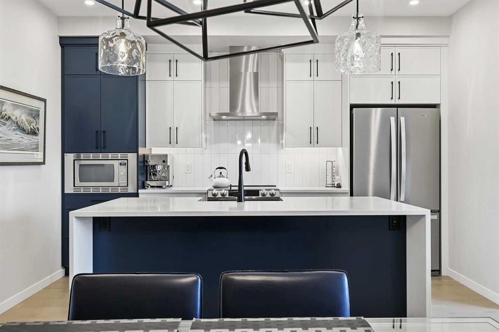 *** OPEN HOUSE Saturday, November 29, 2025 2-4pm *** Welcome to 709 Marine Drive SE: a builder-rebuilt villa townhome offering nearly 1,900 sqft of professionally finished living space and premium upgrades throughout. Originally one of the Mahogany model showhomes, this unit was entirely rebuilt in 2021 and has barely been lived in since. The open main floor features engineered hardwood, a chef-inspired kitchen with upgraded stainless steel appliances, quartz counters, and a large island. The spacious primary suite includes a walk-in closet and private ensuite. A bright living room, generous dining space, powder room, and main-level laundry complete the layout. The lower level is professionally finished with two large bedrooms, a full bathroom, and a rec room. Comfort upgrades include air conditioning, dual-zone control furnace, water softener, and WiFi thermostats. Enhanced soundproofing construction (double wall with air gap, insulation, and drywall layers) offers quiet living. Enjoy a private, builder-fenced backyard with lane access and a detached double garage. Bins are collected at the rear. Best of all, you're steps from Mahogany’s lake entrance, beach club, parks, shopping, and restaurants. Move-in ready with optional furnishings available. No condo fees, just lock-and-leave ease in one of Calgary’s most sought-after lake communities.