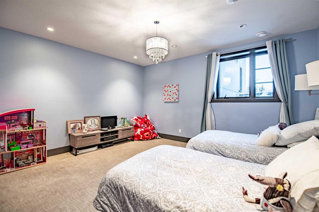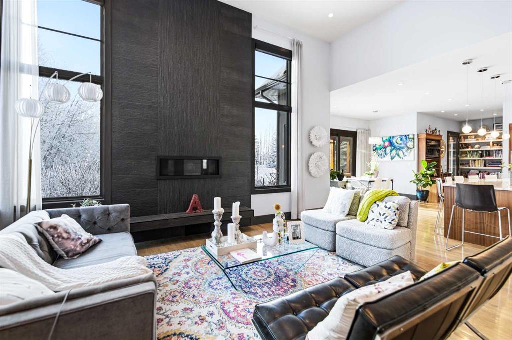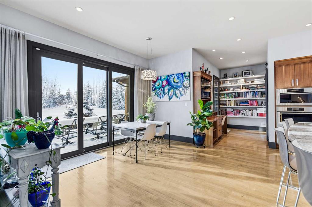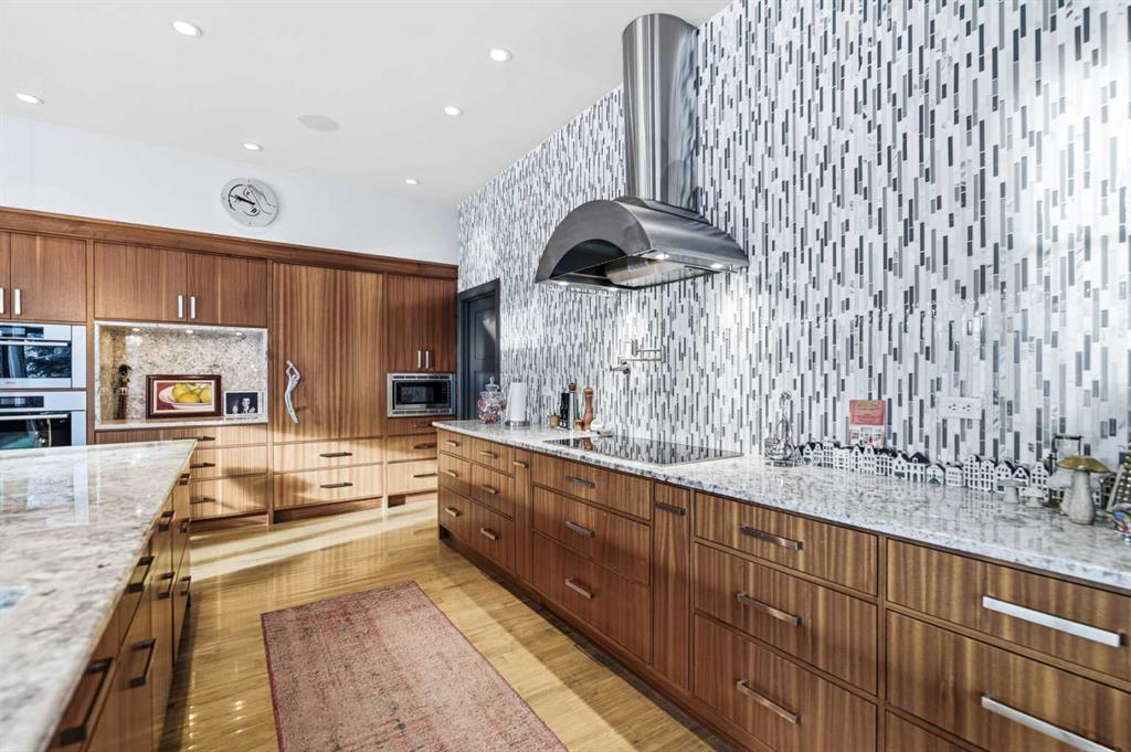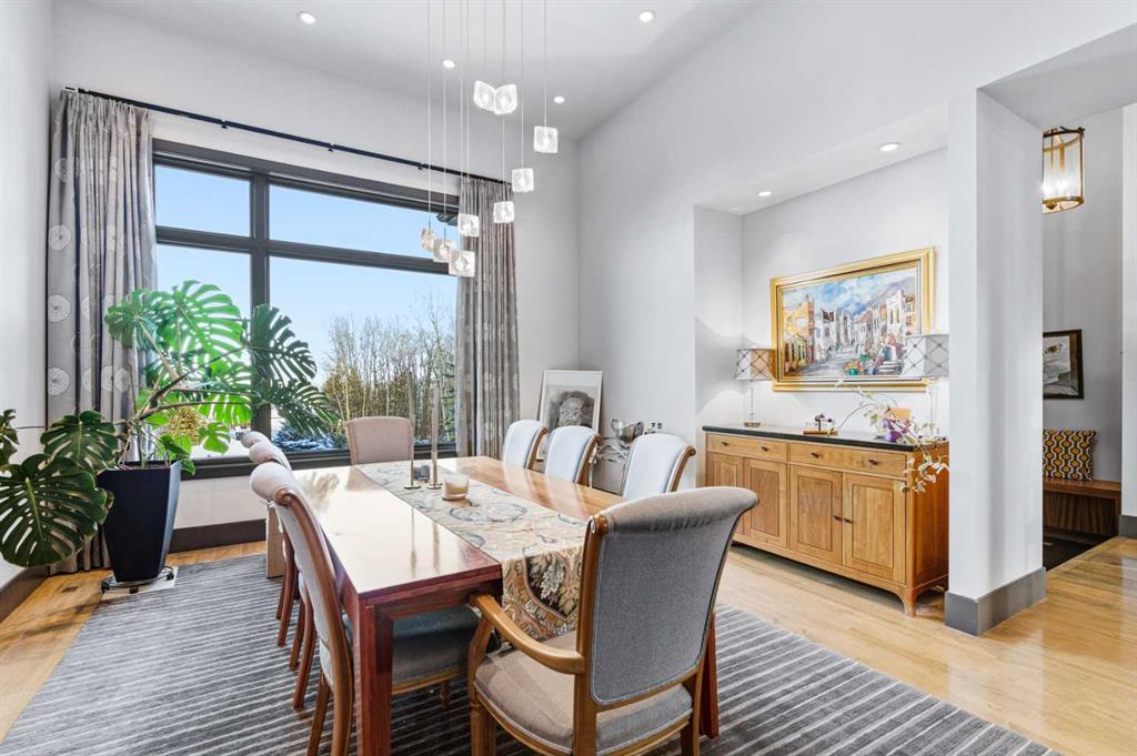 A sophisticated contemporary estate nestled on 1.93 acres, just minutes from the City. Built by Bowood, this exceptional bungalow offers approximately 6,000 sq. ft. of refined luxury living, thoughtfully designed with extraordinary attention to detail throughout. A grand entrance welcomes you into the stunning great room, highlighted by a floor-to-ceiling gas fireplace framed by expansive corner windows, creating a bright and inviting space that sets the tone for this four-bedroom, five-bathroom residence. The open-concept layout seamlessly connects to a chef’s kitchen designed for the most discerning culinary enthusiast. Anchored by an impressive 11-foot granite island with prep sink and built-in dishwasher, the kitchen also features custom cherry wood cabinetry, a built-in refrigerator with designer hardware, induction cooktop, wall oven, steam oven, and a striking glass tile feature wall complemented by a sleek stainless-steel hood fan. A spacious butler’s pantry with a second dishwasher provides abundant storage and functionality. Off the great room, a walk-through coffee and tea bar leads into the elegant dining room, complete with floor-to-ceiling built-in cabinetry and a large picture window that floods the space with natural light. This bright and airy ambiance extends into the expansive three-season room featuring vaulted wood-clad ceilings, west-facing windows, a wood-burning fireplace, and a built-in BBQ with hood fan—perfect for entertaining while overlooking the fully landscaped grounds. The luxurious primary suite is conveniently located on the main level and offers a spa-inspired ensuite with a deep soaker tub, fully tiled shower, double vanity, and a generous walk-in dressing room with built-in features. Completing the main floor is a private office or additional bedroom, an oversized mudroom and laundry area, and a rare three-car attached garage with additional space for motorcycles or yard equipment. The lower level is designed for entertainment and relaxation, featuring a large TV and games room, wet bar, wine cellar, and dedicated home gym. This level also includes a bedroom with private ensuite, two additional spacious bedrooms, and a full bathroom. Additional highlights include a multi-zone Sonos sound system, whole-home water filtration, main-floor air conditioning, multi-zone in-floor heating, outdoor water feature, pizza oven, and RV parking. This architectural masterpiece is designed to impress, offering an exceptional lifestyle that will captivate guests and inspire everyday living.