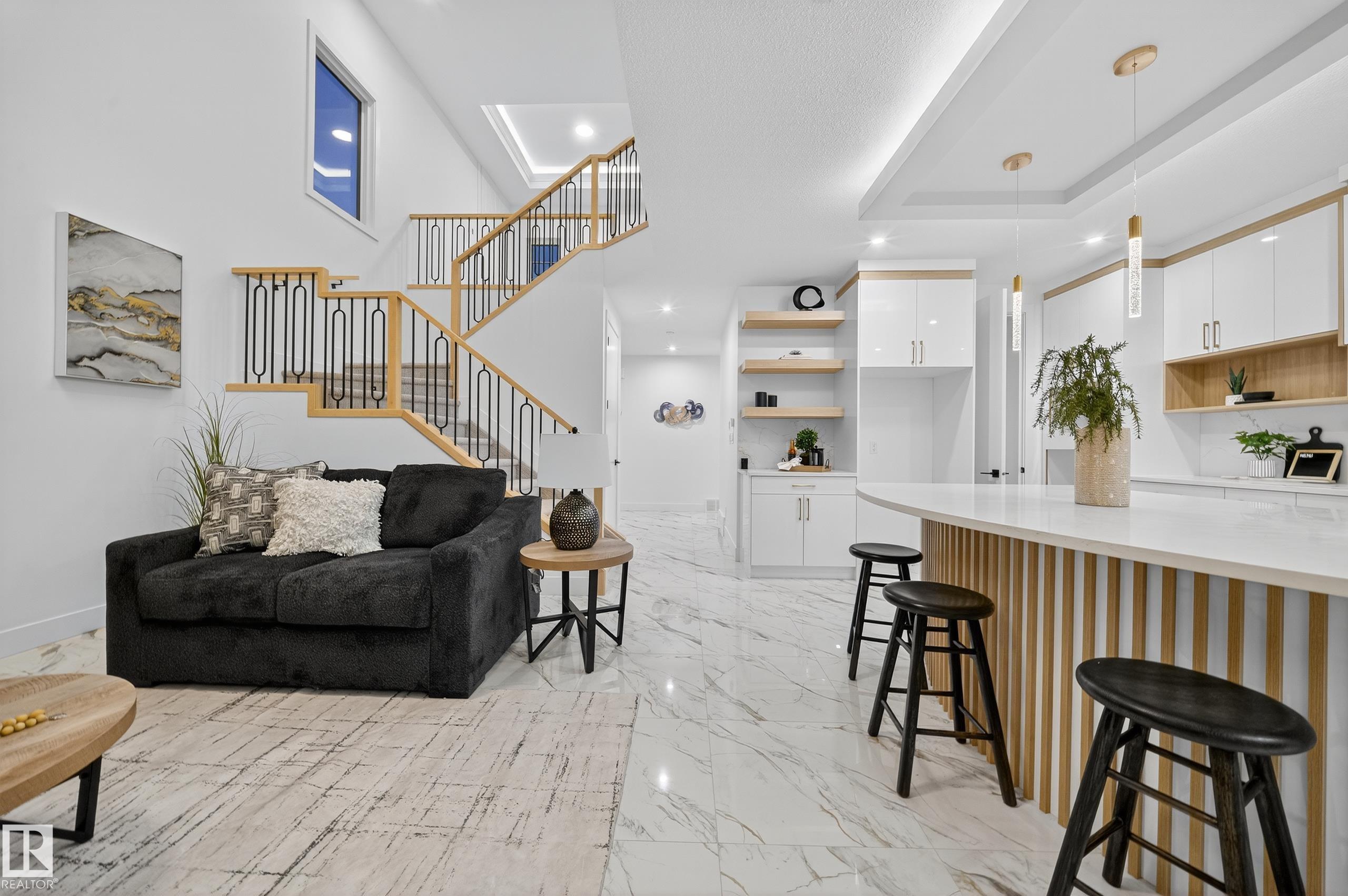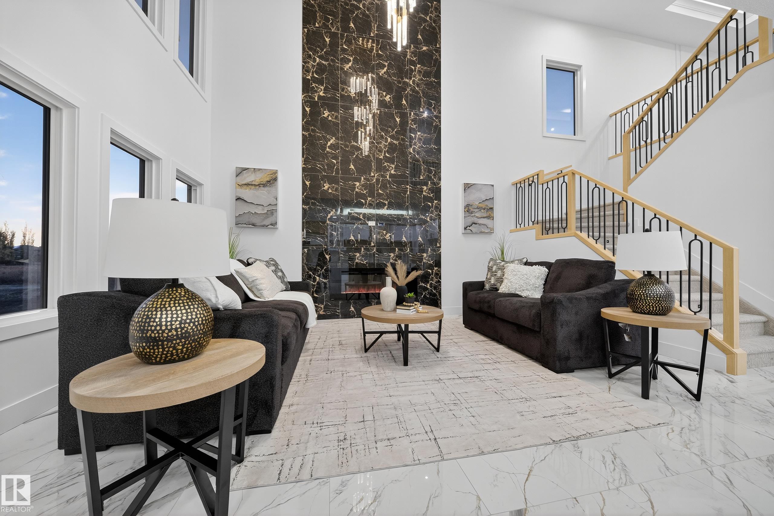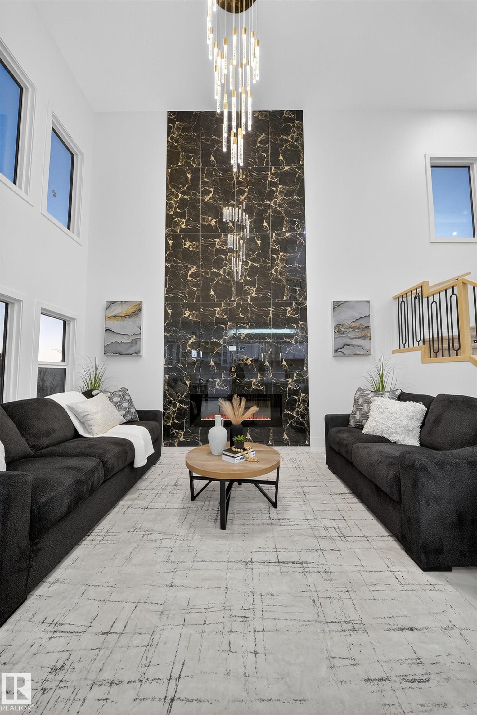 Welcome to this brand new 5-Bedroom, 4-Bathroom home in Quarry Landing, designed with modern living in mind. The main floor features a full bedroom and bathroom, perfect for guests or family, along with an extended modern kitchen showcasing Luxury Quartz countertops and a Quartz backsplash, plus a convenient spice kitchen. The open-to-above living room with its sleek electric fireplace adds a touch of elegance, while ceramic tile flooring brings durability and style throughout the main level. Upstairs, you’ll find spacious bedrooms and a layout built for comfort, enhanced by 9-ft ceilings on every floor and 8-ft doors that add an upscale touch. Vinyl plank flooring covers the upper level, with cozy carpet in the bedrooms and on the stairs. A deck is already built, landscaping is complete, and the oversized double garage offers plenty of space. With a separate side entrance to the unfinished basement, this fully upgraded home is move-in ready and waiting for its first family.