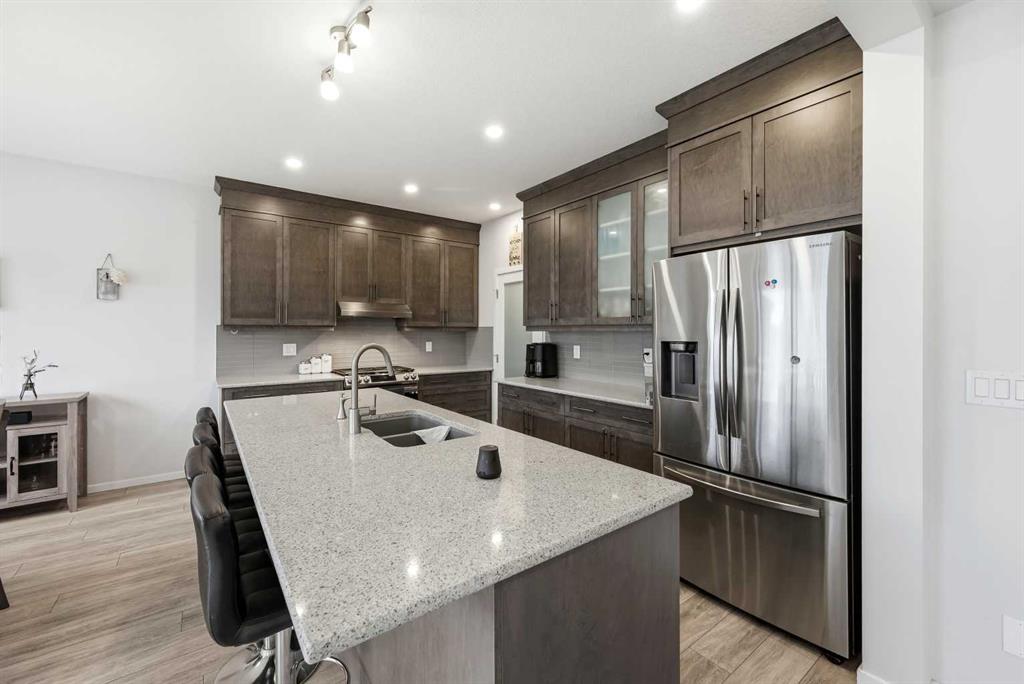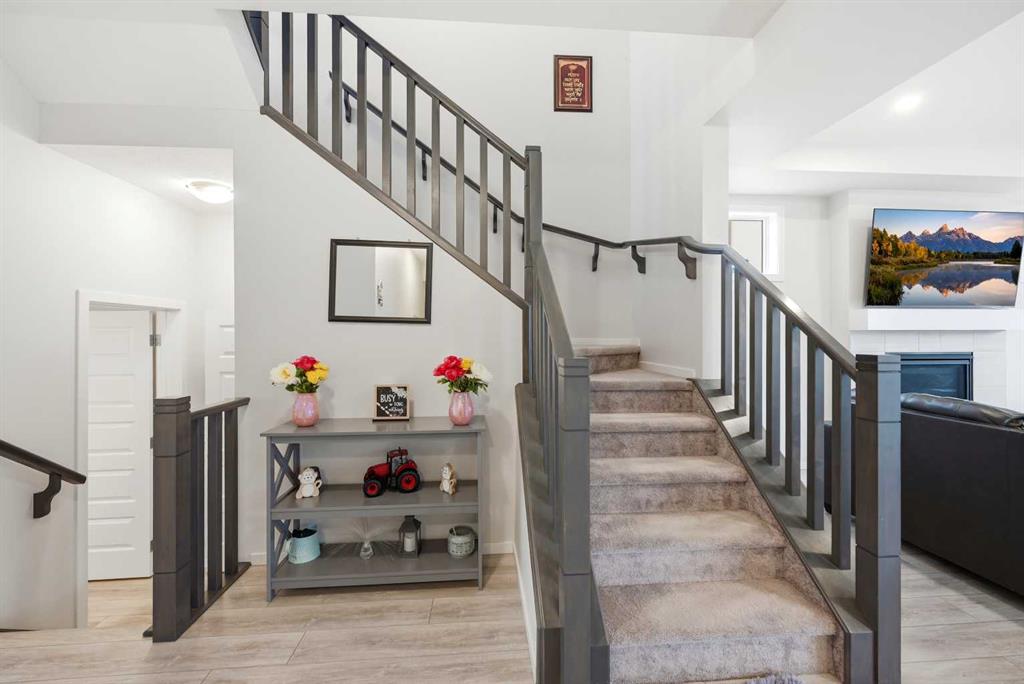 Imagine living on a premium 6,100+ sq. ft. lot with over 3,100 sq. ft. of developed living space (including basement) in this stunning 2021-built home, perfectly designed for modern family living and smart investment potential. Meticulously maintained and loaded with upgrades, this 4-bedroom, 3.5-bathroom residence offers an exceptional blend of comfort, functionality, and income opportunity. Upstaits is 2199.87 sqft and basement brings additional sqft. The main floor welcomes you with a bright open-concept layout featuring a spacious living room with a gas fireplace and feature wall, a chef-inspired kitchen complete with quartz countertops, fully upgraded stainless steel appliances, gas stove, and a convenient walk-through pantry. A large dining area overlooks the expansive backyard, and the oversized deck provides the perfect setting for outdoor entertaining. A stylish half bath completes the main level. Upstairs, you’ll find a generous bonus room with an electric fireplace, ideal for family gatherings or a cozy retreat. The luxurious primary bedroom features a 5-piece ensuite with double sinks, a custom standing shower, and elegant finishes. Additional highlights include upper-floor laundry, upgraded oak railings, and well-sized secondary bedrooms. The fully developed walkout basement offers a one-bedroom illegal suite with its own kitchen, full bathroom, separate laundry, and spacious living area— providing excellent financial flexibility options. Located in one of Airdrie’s most desirable communities, you’re within close proximity to multiple schools, shopping plazas, playgrounds, and everyday conveniences. Osborne Park is just 500 meters away, Windsong Boulevard Park only 600 meters, Save-On-Foods is 1.7 km (approx. 5 minutes), and CrossIron Mills is just less than 10 minute drive. Enjoy easy access to Calgary while living in a peaceful, family-friendly setting. With its oversized lot, upgraded finishes, walkout income potential, and unbeatable location, this move-in-ready home is a rare opportunity for growing families and savvy buyers alike.