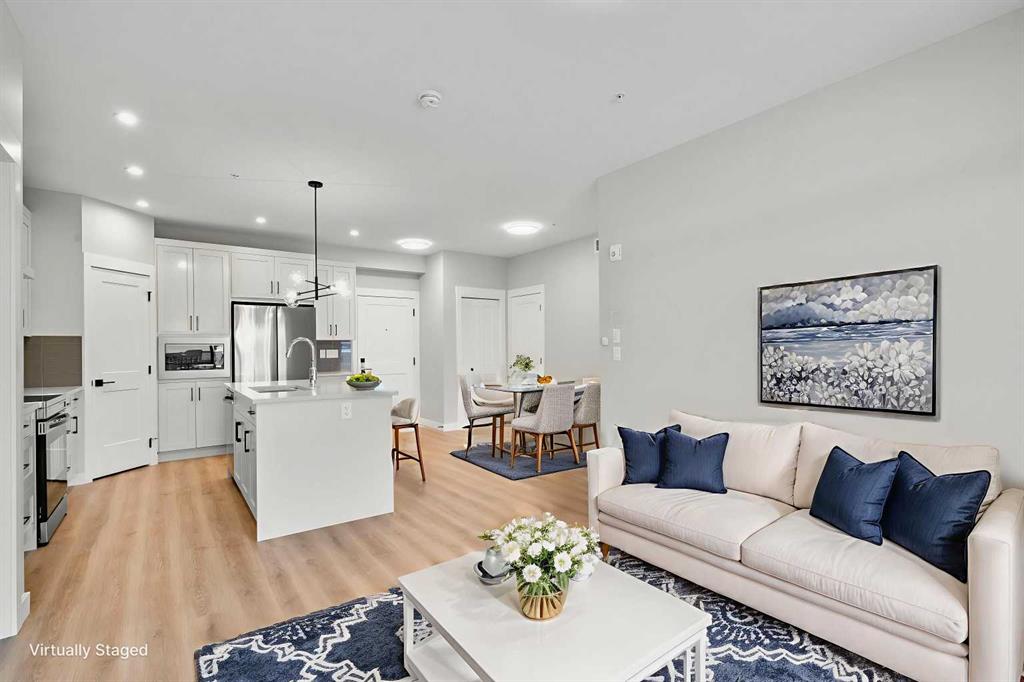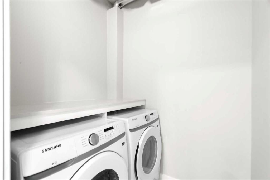 Experience the perfect blend of comfort, luxury, and lifestyle in this brand-new 2-bedroom, 2-bathroom condo by Logel Homes, located in the award-winning lake community of Mahogany. Perched on the 3rd floor of the new Parkside building, this 858 sq. ft. “Jackson 2” floor plan features an expansive 152 sq. ft. patio offering breathtaking city and mountain views — the perfect backdrop for morning coffee or evening sunsets. Inside, the open-concept layout showcases high ceilings and elegant design touches throughout. The kitchen is a true showpiece, featuring 3cm quartz countertops, a 36" upgraded stainless steel fridge, and additional upper cabinets for extra storage. The extended island has 15" drawers and doors, with a 12-inch quartz countertop overhang on both sides for added seating and workspace. A sleek stainless steel range hood with high-efficiency micro filters complements the modern matte black hardware, while the Blanco Quatrus sink provides both style and function. The living room is thoughtfully designed for modern living, featuring a wall-mounted TV package complete with a raised power outlet, hidden cable conduit, fire-rated drywall, and reinforced backing for a TV bracket. The home also includes a 12,000 BTU air conditioning system to keep you comfortable year-round. Both bathrooms are elegantly appointed with tile flooring and quartz countertops. The ensuite feels like a private retreat, offering dual undermount sinks, a 10mm Sydney Barn-style sliding glass shower door with a chrome top rail and 8-inch D-handle, and a bright shower pot light. A built-in linen tower adds practical storage, and additional GFI power outlets enhance functionality. The second bathroom mirrors the same high-end finishes, ensuring a cohesive design throughout. Convenience continues with a dedicated laundry space featuring Luxury Vinyl Plank flooring, a 2cm quartz countertop above the washer and dryer for folding and organization, and added GFI outlets above the laundry table. Closet organizers maximize storage throughout the home, while plush carpet in the bedrooms creates warmth and comfort. Located in Mahogany, one of Calgary’s most sought-after communities, residents enjoy exclusive access to the city’s largest freshwater lake, complete with sandy beaches, swimming, paddleboarding, and skating in the winter months. The community also offers scenic walking trails, parks, playgrounds, and a vibrant village centre filled with restaurants, cafés, and boutique shops — all designed to create a true four-season lifestyle. This exceptional home at Waterside by Logel Homes is the perfect combination of modern design, thoughtful upgrades, and an unbeatable location. Whether you’re a first-time buyer, downsizer, or investor, you’ll love the quality craftsmanship and the lake lifestyle that only Mahogany can offer.