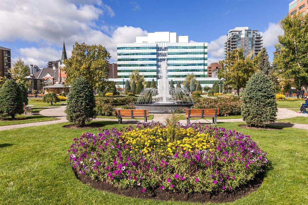 Location, location, location! Welcome to this modern 2-bedroom + den, 2-bathroom condo in the heart of Calgary’s vibrant Beltline, perfectly positioned between Central Memorial Park and Haultain Park, aptly named The Park. Situated on the 8th floor, this unit showcases stunning views of Central Memorial Park and the downtown skyline. Upon entry, you’re greeted by sleek tile flooring, a versatile den, a 3-piece bathroom, and in-suite laundry, leading seamlessly into the open-concept living space. The functional, stylish kitchen features stainless steel appliances, quartz countertops, and a large island overlooking the spacious living and dining areas—ideal for both everyday living and entertaining. Floor-to-ceiling windows flood the home with natural light while framing spectacular city and park views. The primary suite offers a walk-through closet and a 4-piece ensuite, while the second bedroom is perfect for a roommate, guest room, or home office. Enjoy the convenience of TITLED underground parking (#68), additional storage, secure entry, daily concierge, bike storage, a fitness centre, third-floor patio and social room, community gardens, and a guest suite, all within a warm, welcoming community of neighbours that makes this building truly special. Condo fees include all the above and all utilities with the exception of electricity and wifi. Steps from the cafés, shops, and restaurants of 1st Street, 10th Ave, 17th Ave and the Mission District, and minutes to downtown, this property offers convenient and comfortable inner-city living!