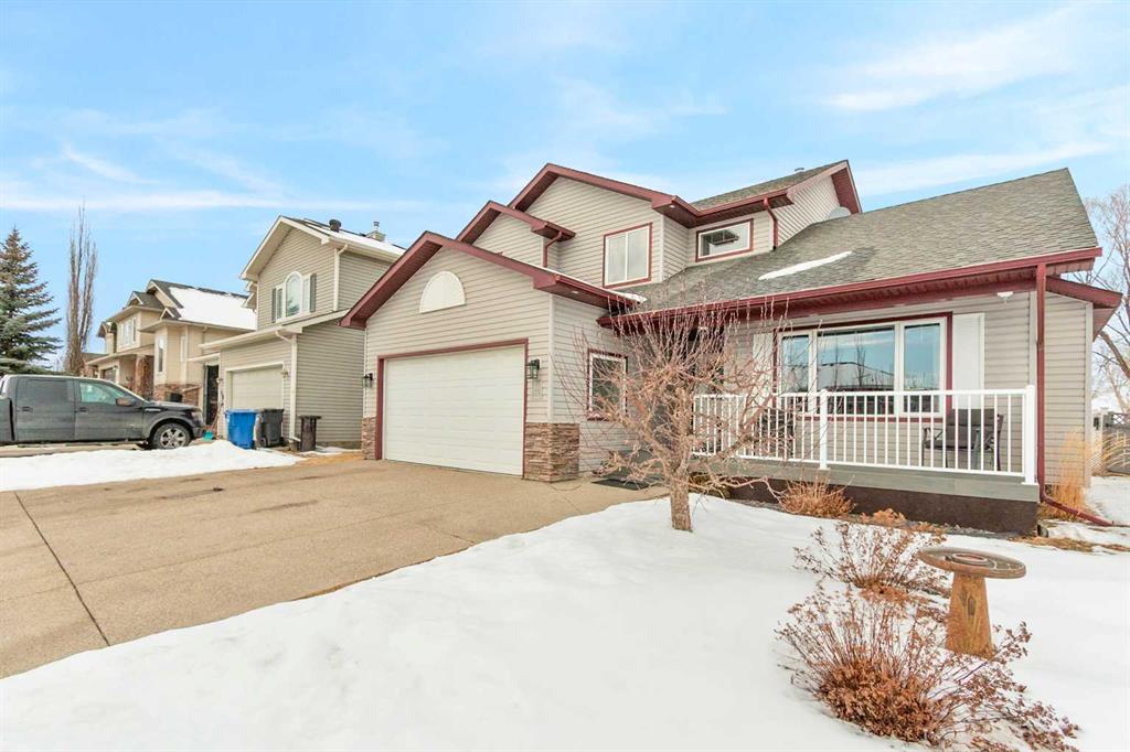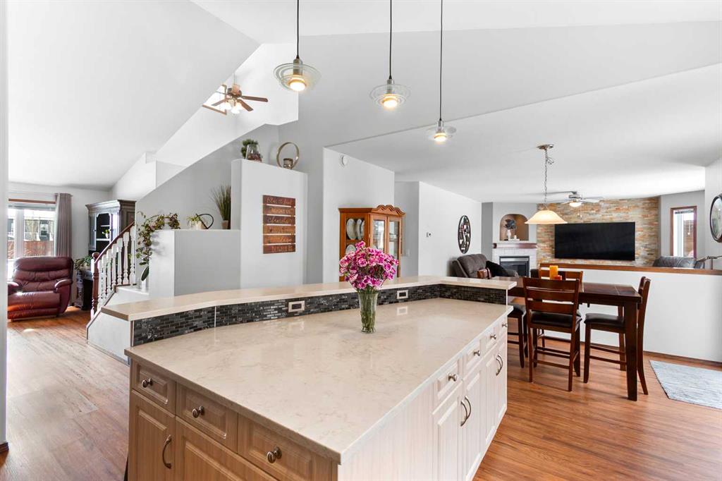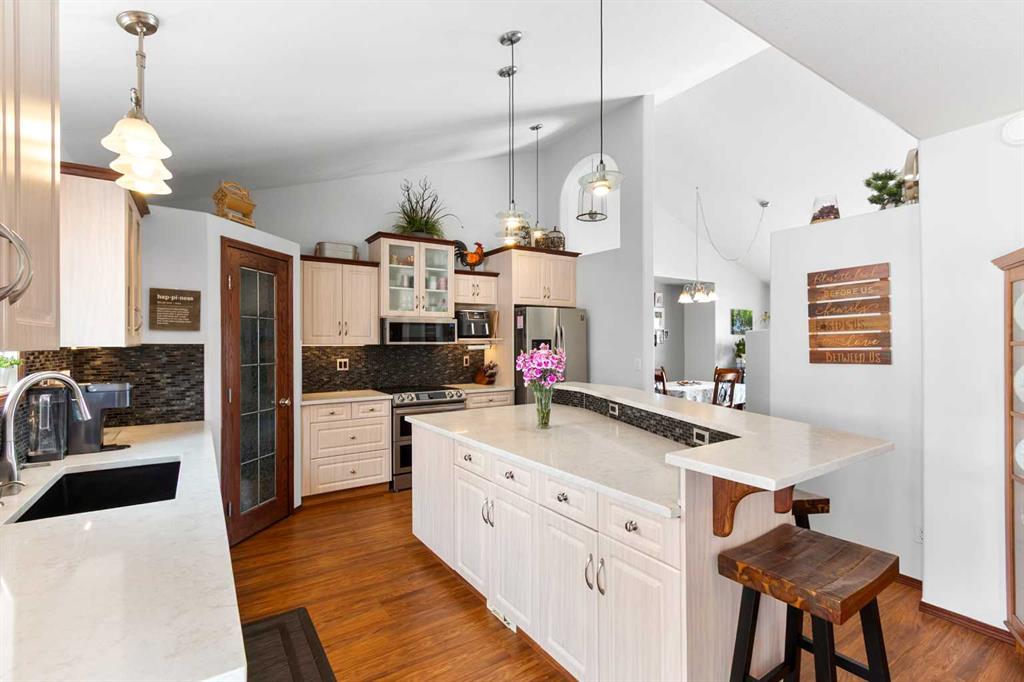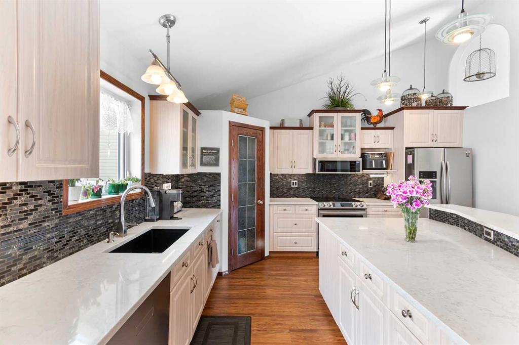 Wonderful family home on a spacious 53 x 150 ft. lot backing directly onto the CARSTAIRS GOLF COURSE. This immaculately maintained 2-owner BUNGALOW/ SPLIT HOME offers exceptional living space with a formal living and dining room, a bright great room, and a stunning COUNTRY KITCHEN featuring vaulted ceilings, a massive ISLAND quartz countertops, corner PANTRY, and a generous dining nook. The inviting family room showcases a striking feature wall & a GAS FIREPLACE, while MAIN FLOOR LAUNDRY adds convenience. A beautiful curved staircase leads to the upper level where you’ll find a large primary retreat with a 5-piece ENSUITE + WALK IN CLOSET, plus two additional spacious bedrooms and a 4-piece bathroom. The massive undeveloped basement provides endless potential for future development. As an added bonus, the property includes a separate heated 20 x 32 ft. DETACHED WORKSHOP/GARAGE + DOUBLE ATTACHED GARAGE with 8 ft. side access from the street, along with RV parking. The fully fenced yard features mature LANDSCAPING, fruit trees, garden boxes, a patio, and backs onto peaceful golf course views. Ideally located just 20 minutes to Airdrie and 30 minutes to CrossIron Mills, this property offers small-town charm with convenient access to major amenities — a wonderful place to call home.