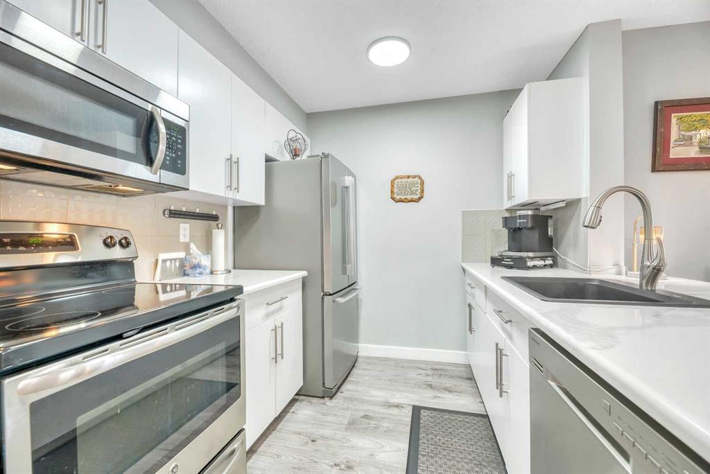 Ground floor unit! Easy access to this well and updated maintained bedroom condo. Open floor plan. Gleaming white kitchen with stainless steel appliances and breakfast bar open to bright and open living room with access to ground floor patio. 2 spacious sized bedrooms. The primary has a walkthrough closet and 3 piece ensuite. Additional space ideal for small office. Insuite laundry. Very functional unit. Condo fees incude heat and water. Great location near all amenities. amazing walkability!