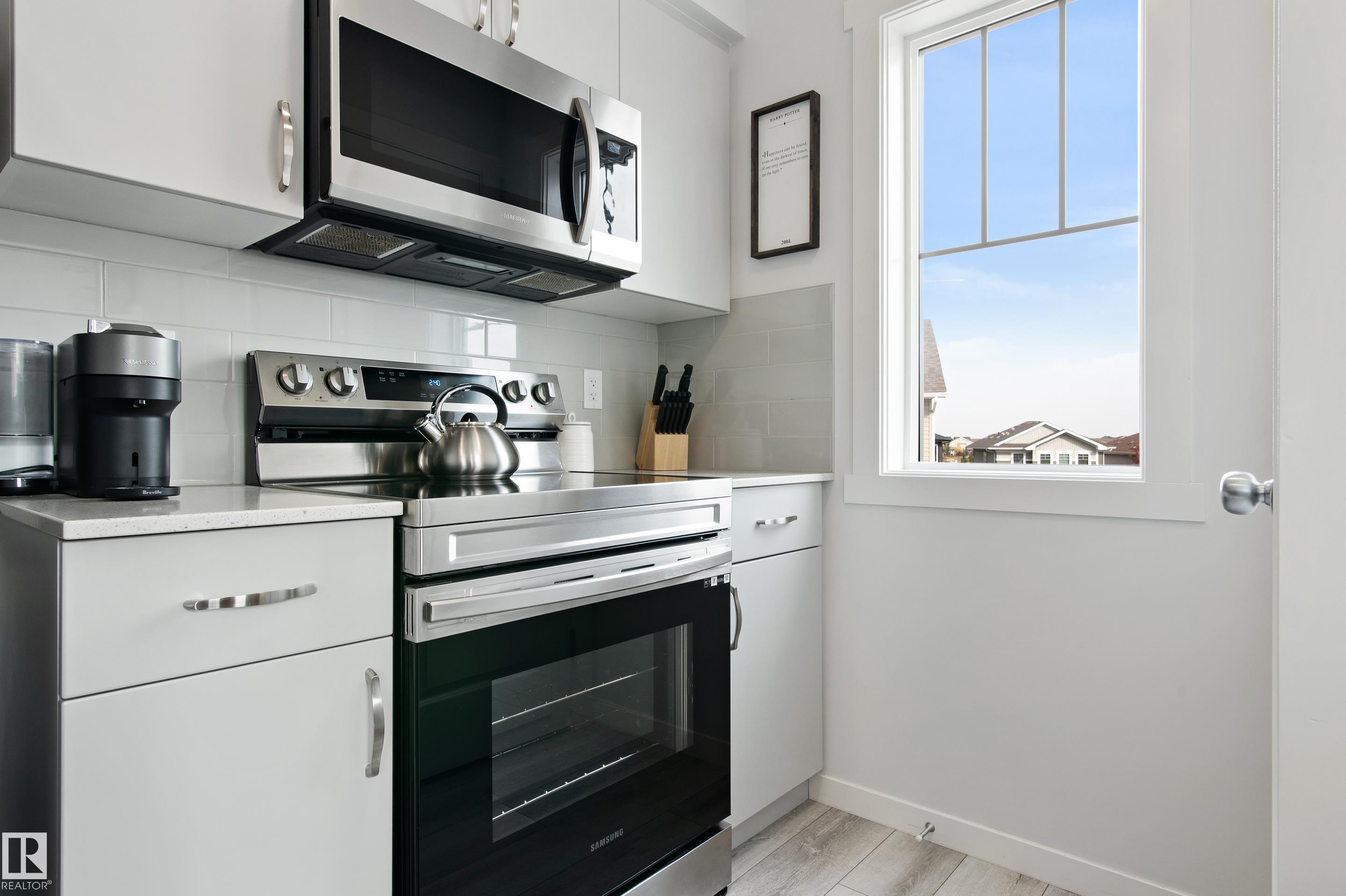Extremely well maintained, 2 bedroom and 1 bathroom top floor end unit townhouse in the community of Crystallin Nera. Featuring an open concept layout, the kitchen which has quartz countertops, stainless steel appliances and a pantry for extra storage looks onto the good sized living area which has direct access to the balcony with a slight view of the lake. The 4 piece main bathroom has quartz countertops as well and down the hall, is the primary bedroom which has a walk in closet and across from it is the second bedroom which can also be used as an office space. Don't worry about brushing snow off your vehicle this winter as there is a single attached garage and on the lower level there is a good sized storage room too. Another bonus is the visitor parking just outside your door. Close to shopping, transit, CFB Edmonton as well as Henday access, this home is in a fantastic location!