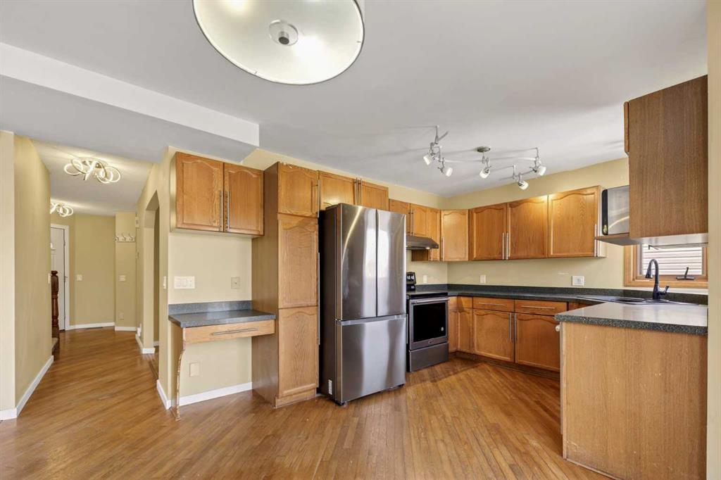 Ready to step into Calgary's serene neighbourhood of Riverbend? Look no further than this stunning home, nestled by green spaces, upgraded for peace of mind, and prepared for your unique touch. Stepping into the home from the upgraded front porch you are greeted by a large entry foyer, living room, and hallway access to your storage closets + laundry room, half bathroom, and side entrance/exit. Passing the separate dining space you enter the heart if the home, with a modern equipped kitchen and family room bolstered with a real wood burning fireplace for those cozy winter evenings! Several large NE facing windows allow natural light to brighten the space further while also inviting you to step out onto your elevated balcony and soak in nature. Moving to the upper level this home is equipped with 2 full bedrooms their corresponding 4 piece bathroom, as well as your primary bedroom and attached walk-in closet + 4 piece ensuite bathroom. All of that combined with a finished walkout basement that includes a storage/utility room, oversized rec room + wet bar, and another 4 piece bathroom... you have access to over 2536 sq/ft of useable living space! Outside the sliding basement doors you have a large backyard plus a fully built separate patio for all your summer hosting needs. The private fence gate allows you to freely walk the green space and walking/bike paths adjacent to your backyard, and connects your property to open parks + playgrounds! Additional features in this home include the large double garage, fenced in dog-run by your side entrance/exit, and of course... NO POLY B PIPING! Not only does this home include modern touches, but it also provides peace of mind through its numerous upgrades that include: new washer/dryer in 2021, an upgraded porch/balcony/patio in 2022, new roof and gutters in 2023, FULL Poly B replacement in 2024, new fridge in 2025, and a brand new boiler for 2026. Need further peace of mind? The upgrades are logged with receipts and big ticket items include a transferable warranty!! Don't miss out on this amazing home! Schedule a showing today to see it for yourself!