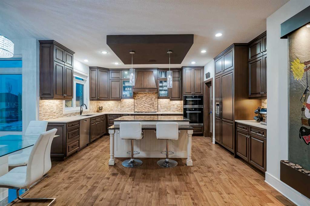 **OPEN HOUSE SUN MARCH 8th 2PM - 4PM** Welcome to Silverado Ranch - an exclusive estate enclave in SW Calgary. This exceptional custom residence by Augusta Homes is offered by the original owner and showcases 3,900 sqft of meticulously developed living space on a rare 13,745 sqft (0.31 acre) lot, backing directly onto a walking path and surrounded by mature trees for added privacy. Designed with flexibility for generational living, this home features 4 beds and 4 full baths, including a main-floor office that can easily function as a 5th bedroom, plus space to reintroduce a 6th bedroom in the fully developed sunshine basement. From the moment you enter, the craftsmanship is unmistakable. A striking slate-pattern tile entry transitions into hand-scraped hardwood flooring, setting the tone for the refined finishes throughout. The living room is a true showpiece - soaring open-to-above ceilings frame a dramatic stone fireplace, anchored by a spectacular two-storey chandelier that commands attention. The open-concept layout seamlessly connects the living, dining, and chef-inspired kitchen. The kitchen is outfitted with over $75K in premium appliances, incl a built-in Miele refrigerator/freezer, Wolf Sub Zero gas cooktop, Miele steamer/oven combo, built-in microwave, and dishwasher. A massive central island creates an ideal gathering space, complemented by a walk-through pantry and custom mudroom built-ins for everyday functionality. Outdoor living is equally impressive. A screened-in sunroom (196 sqft) off the main deck is equipped with a ceiling fan for summer comfort and a heater for cooler nights. A floating staircase with glass railings leads to the upper level, where natural light pours in through dual skylights. The primary suite is a private sanctuary featuring vaulted ceilings, a luxurious 5pc ensuite with steam shower and soaker tub, and a walk-through closet connecting directly to the upper laundry room with built-in sink. Two additional bedrooms, a second 5pc main bathroom and a spacious bonus room complete this level. The bright Sunshine Basement was thoughtfully designed for both relaxation and entertaining. Highlights include a dedicated theatre room , expansive games area and a stylish wet bar with wine fridge. The final spacious bedroom plus a beautifully finished 4pc bath, create an ideal private retreat for guests or extended family, with the option to easily add yet another bedroom if desired. The triple attached garage with side man door and drive-through rear door to an additional parking pad, has been completed with Epoxy garage flooring, and a Tesla EV charger. Additional upgrades include newer roof and garage doors, on-demand hot water tank, dual furnaces, central A/C, water softener, central vac, trimlight exterior lighting, irrigation system, feature walls, and a waterfall feature on the front lawn. A truly elevated offering for the discerning buyer seeking custom craftsman, estate-scale living, and uncompromising quality right in the city!