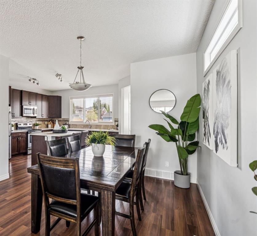 Welcome to this charming two-storey detached home in the desirable community of River Heights Green! Thoughtfully designed with modern finishes and a functional layout, this property is perfect for today’s lifestyle. The main floor showcases an OPEN-CONCEPT design with HIGH CEILINGS, creating a bright and airy atmosphere. The stylish kitchen features QUARTZ COUNTERTOPS, a central ISLAND with BREAKFAST BAR, STAINLESS STEEL APPLIANCES, and rich DARK CABINETRY—a perfect setting for cooking, entertaining, or family gatherings. The dining area flows effortlessly into the living room, where a GAS FIREPLACE with STONE SURROUND and MANTLE serves as a warm and inviting focal point. Upstairs, you’ll find three bedrooms, including the spacious primary suite with a FEATURE WALL, LARGE WINDOWS, WALK-IN CLOSET, and a 4-piece ENSUITE. A versatile BONUS ROOM, convenient LAUNDRY ROOM, and an additional 4-piece main bath complete this level. The UNFINISHED SUNSHINE BASEMENT with 9-ft ceilings and a bathroom rough-in offers endless potential—perfect for creating a future rec room, gym, or additional bedrooms. Step outside to your EAST-FACING backyard, featuring a DECK, FIRE PIT AREA, and GARDEN BOXES—ideal for relaxing, entertaining, or enjoying your outdoor hobbies. The property also includes an OVERSIZED DETACHED GARAGE, providing ample parking and storage space. Situated close to parks, pathways, schools, and shopping, with easy access to major routes, this stylish and comfortable home is move-in ready and waiting for you!