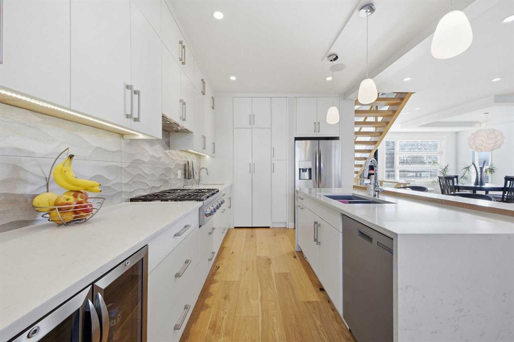 OPEN HOUSE SATURDAY, FEBRUARY 28TH FROM 1-4 PM. PANORAMIC CITY AND DOWNTOWN VIEWS define this contemporary 4 bedroom residence in historic Bridgeland, offering over 4,600 sq ft of beautifully designed living space, including a fully developed walk out basement. Thoughtfully crafted for both everyday comfort and elevated entertaining, the home blends modern finishes with exceptional functionality. The open, airy main level features hardwood floors and soaring ceilings. A spacious dining area easily accommodates large gatherings, while the living room—anchored by a remote controlled feature fireplace—creates a warm, inviting focal point. The kitchen is tastefully appointed with quartz countertops, an island with eating bar, abundant cabinetry including a walk in pantry, stainless steel appliances, and a bright breakfast nook. A mudroom and 2 piece powder room complete this level. The second floor hosts three well proportioned bedrooms, a 5 piece bath, and a laundry room equipped with a sink and storage. The private primary retreat enjoys its own balcony, a generous walk in closet, and a secluded 5 piece ensuite featuring in-floor heat, dual sinks, a relaxing soaker tub, and an oversized shower. The third level is an exceptional entertaining space, offering a large loft with in-floor heat, wet bar and access to a spectacular rooftop patio showcasing sweeping skyline views. A fourth bedroom and a 3 piece bath with rejuvenating steam shower complete this upper level. The fully developed walk out basement, warmed with in floor heat, includes a spacious recreation/media room with wet bar, a dedicated office, and a 3 piece bath. Additional highlights include new hardwood flooring in the loft and bedrooms, built in speakers, a south facing front patio, and a private backyard with deck, swim spa, and access to the heated triple detached garage. This exceptional property enjoys an enviable location close to Bridgeland’s charming shops, cafés, and restaurants, the Calgary Zoo, Bow River pathways, schools, public transit, and offers effortless access to the downtown core.