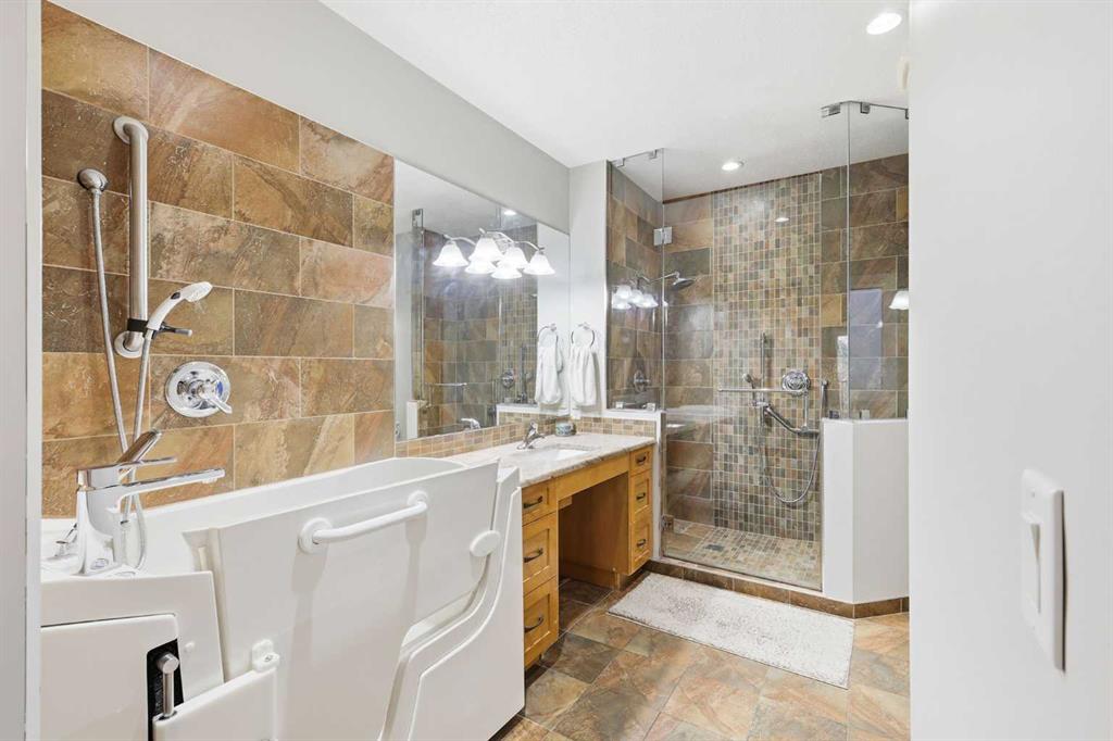 Welcome to this beautifully maintained and thoughtfully designed home offering over 2,600 developed square feet of comfortable, accessible living space. Designed with convenience and ease of mobility in mind, this home is perfect for buyers who value quality, functionality and independence. The best part - landscaping and snow removal is taken care of for $130 per month ($1560 paid yearly) as part of the Legacy Ridge HOA and the home is situated just steps to the scenic pathway system overlooking the Bow River. Step inside to find refinished hardwood floors and a warm, open atmosphere. The main floor features an office (formerly a bedroom), a convenient half bath and a large primary bedroom with an customized ensuite as well as a private patio offering a peaceful retreat. The bright kitchen is equipped with granite countertops, a dual fuel gas/electric stove, and a built-in pantry with pullout drawers for easy organization. The cozy living area offers a gas fireplace, creating an inviting space to relax or entertain guests. Accessibility and comfort are at the heart of this home. Thoughtful details such as swing-clear hinges for wider doorways, a walk-in tub, and built-in storage make daily living effortless. Enjoy full mobility throughout the property with the mobility elevator in the garage providing access to the main floor, and a second mobility elevator leading to the backyard, allowing you to enjoy every part of your home with ease both indoors and out. The lower level adds additional versatility with two additional bedrooms, a three-piece bathroom, another large family room with a second gas fireplace ideal for guests or visiting family. Additional features include: a tankless hot water system, high-efficiency furnace, air conditioning, aluminum roof installed in 2017, recently replaced doors and windows, and a water softener. The oversized double garage with an elevator, built-in speakers, and a charming gazebo in the backyard add both practicality and enjoyment. This exceptional property combines thoughtful design and true accessibility — offering the perfect balance of comfort and independence for those ready to simplify without compromise. Situated within the sought-after community of McKenzie Lake, you’ll enjoy access to an exceptional lifestyle with amenities that go beyond the home itself. Residents here benefit from the private 43-acre lake and 18-acre park, offering summer activities like swimming, boating, paddle-boarding and fishing, and in colder months transformed into a winter wonderland with illuminated skating rinks and ice trails. The community association provides tennis and pickleball courts, beach volleyball, playgrounds and pathways. Don't miss this rare opportunity to live in Legacy Ridge of McKenzie Lake.
