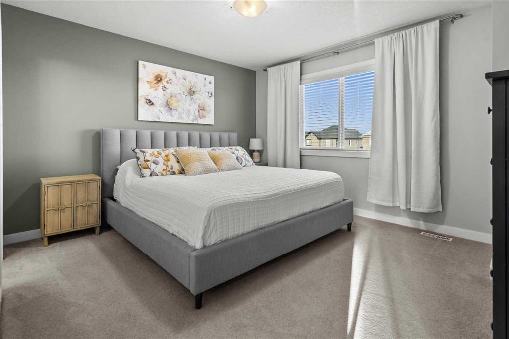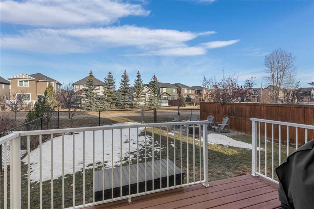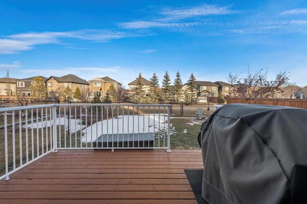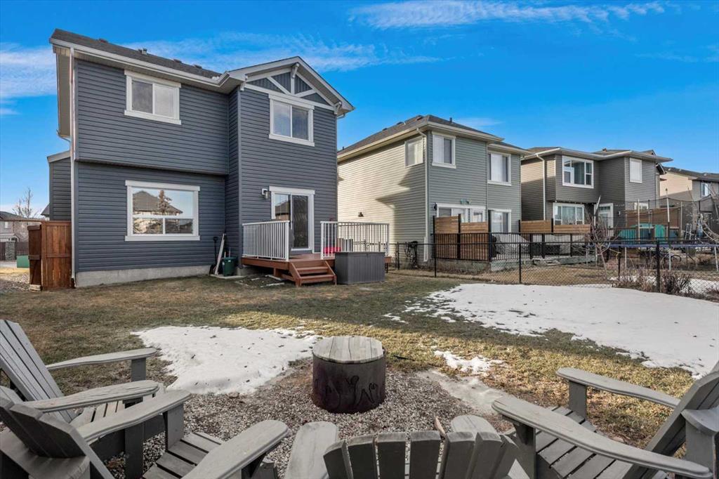 Meticulous, designer-inspired two-story home in the Airdrie community of Ravenswood. The welcoming foyer leads into a bright, open-concept main living area. The kitchen is beautifully appointed with a central island and breakfast bar, new stainless-steel appliances (including an exceptional gas range), and a walk-in pantry. Open to the kitchen, the family room features a cozy gas fireplace and outdoor views of the adjoining green space with its convenient walkway. Step outside to a private, fully fenced backyard with a fire pit—perfect for summer evenings with friends. Upstairs discover a bright, spacious bonus room, three bedrooms, and a 4-piece main bath. The primary retreat offers a customized walk-in closet and a 4-piece ensuite complete with a soaker tub and skylight. The unfinished lower level awaits a finishing design to suit your lifestyle. Ideally located close to Heloise Lorimer School and École des Haute-Plaines (K–12), with easy access to Highway 2 for easy commuting north and south, including YYC airport and downtown Calgary.