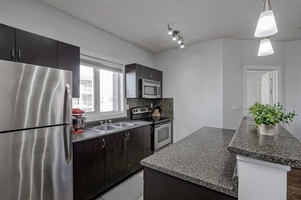Open House Saturday November 15th noon-2pm. Welcome to this well-maintained, spacious corner unit condo with 9 foot ceilings offering over 900 sq. ft. of comfortable living space. Located in a highly desirable, family-friendly community, this home is perfect for small families, first-time buyers, or those looking to downsize without compromising on quality or space. Step inside to find an airy, open-concept layout centered around kitchen island, perfect for gathering with loved ones or cooking a family meal. The layout flows seamlessly onto an oversized balcony, ideal for morning coffee or evening unwinding. This unit boasts two generously sized bedrooms, including a primary suite with a large walk-in closet and a private ensuite bathroom. A second full bathroom adds extra convenience for guests or family. Additional highlights include 2 underground parking stalls (rare tandem parking), a Pet-friendly building and reasonable condo fees. You also have easy access to nearby Genesis Place, a premier community facility featuring a fitness center, pool, arenas, gymnasium, and more. Don't miss your chance to own this bright, spacious condo in a vibrant, amenity-rich community. Book your viewing today!
