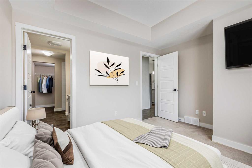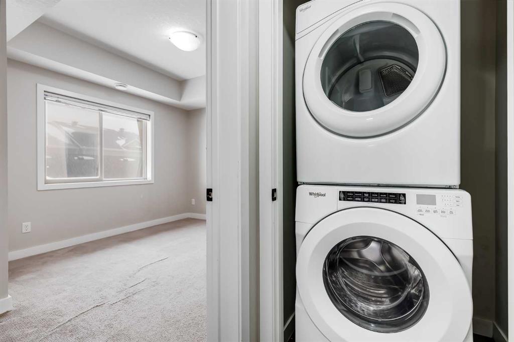 Welcome to this AIR CONDITIONED 2 Bedroom, 2 Bathroom END UNIT, offering 882 sq. ft. of bright, open-concept living space, and TWO PARKING STALLS. With 9' ceilings and large windows throughout, this home is filled with natural light and designed for both comfort and functionality. The kitchen features a large island, stainless steel appliances, quartz countertops, and a pantry with lots of shelving, perfect for cooking and entertaining. The primary bedroom is a great size, offering a walk-through 3-piece ensuite and a large walk-in closet. The second bedroom comfortably fits a queen bed or works perfectly as a home office, with a bright window providing great natural light. The main bathroom is well appointed and provides excellent storage. Additional highlights include recently upgraded in-suite laundry and central air conditioning for year-round comfort. Step outside to your private, spacious deck ideal for a BBQ and patio seating to enjoy the outdoors from the comfort of home. The well-managed complex features beautifully maintained green spaces and easy access to the local pathway system, Yankee Valley Boulevard, and 24 Street. Low condo fees include heat, water/sewer, insurance, and contributions to the reserve fund.