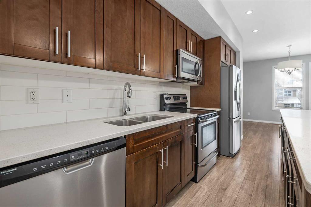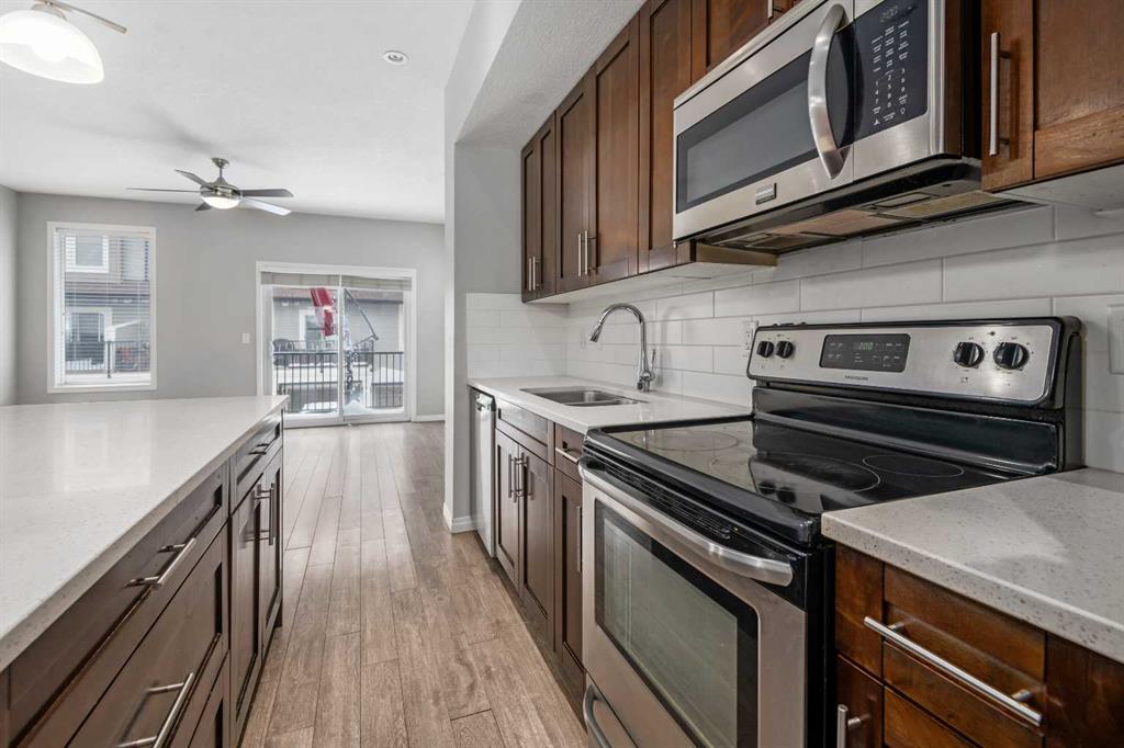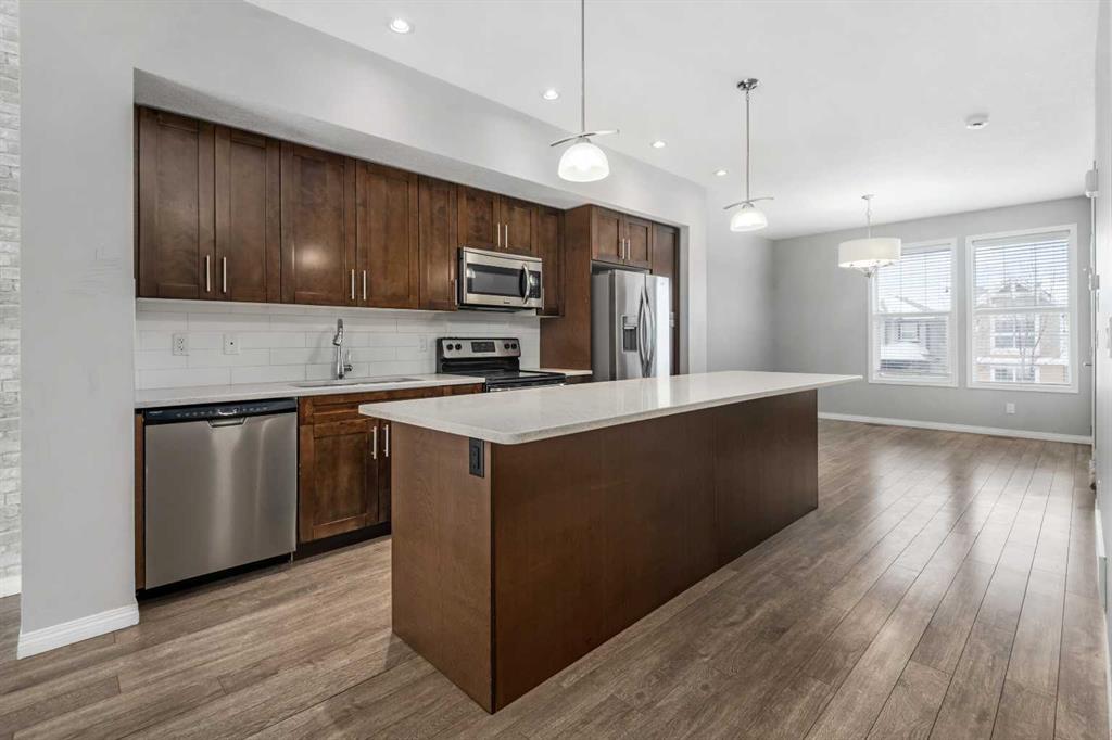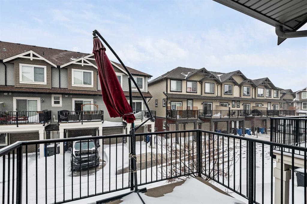 END UNIT - 3+1 BED / 4BATH - FULL UPGRADE PACKAGE - DOUBBLE ATTACHED GARAGE - A/C. Stunning End Unit Townhome in the Gateway at Williamstown, located in the sought-after Williamstown Community close to schools, parks, and playgrounds, this amazing unit offers modern living with ample parking, featuring a double attached garage and additional covered parking pad for two more cars, with a premium street-facing location for additional street parking! Upon entering, you'll discover a versatile flex room that can easily be used as a 4th bedroom, perfect for guests or family, with a full 3-piece bathroom, with a stand-up glass shower, conveniently located on this level, along with ample storage and access to the double attached garage. The second level boasts a chef's kitchen with an oversized quartz center island that comfortably seats four, complemented by top-tier stainless steel appliances. The bright living room features an electric fireplace and sliding glass doors that open to a private deck with a natural gas hookup—ideal for outdoor dining and relaxation, and a spacious eating area with large windows allowing an abundance of natural light. A 2pce powder room adds convenience on this level. On the upper level, sits an expansive primary suite, offering a luxurious ensuite with stylish quartz countertops, double sinks, a large glass shower, and a walk-in closet. This level also includes two additional spacious bedrooms, sharing another full bathroom, plus a convenient laundry area, making everyday living easier and more efficient. This move-in-ready townhome is ideal for comfortable family living and easy access to all amenities. Don’t miss the opportunity to make this gorgeous home yours!