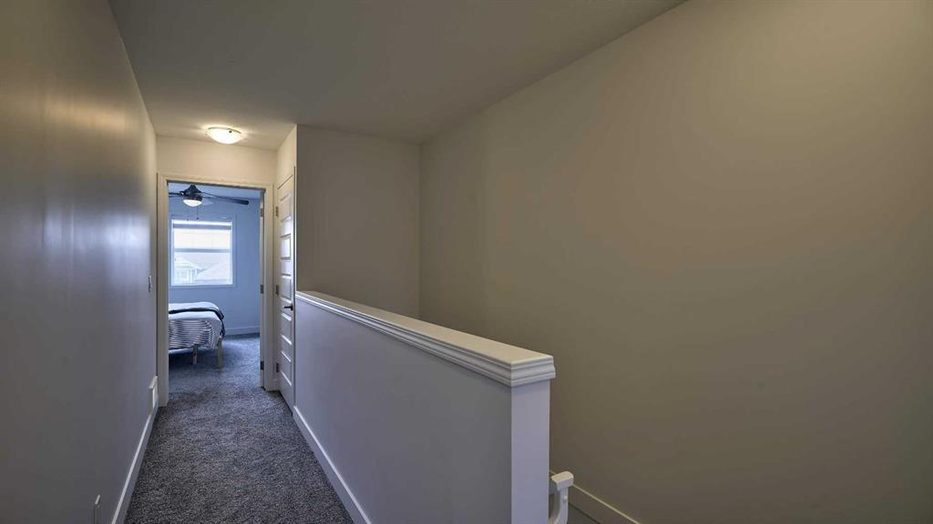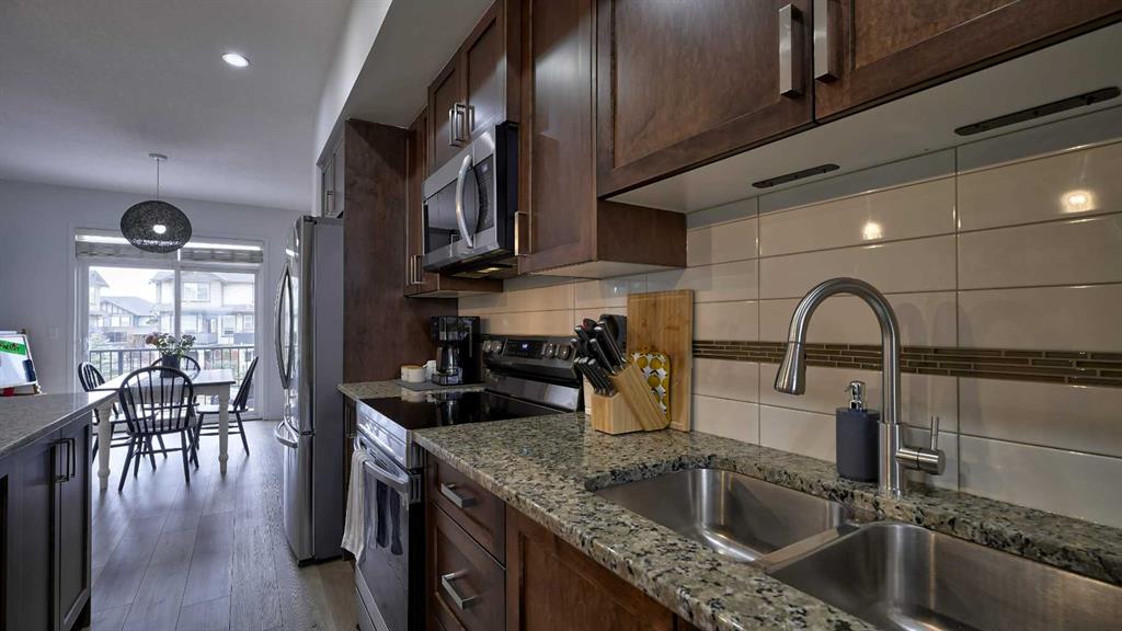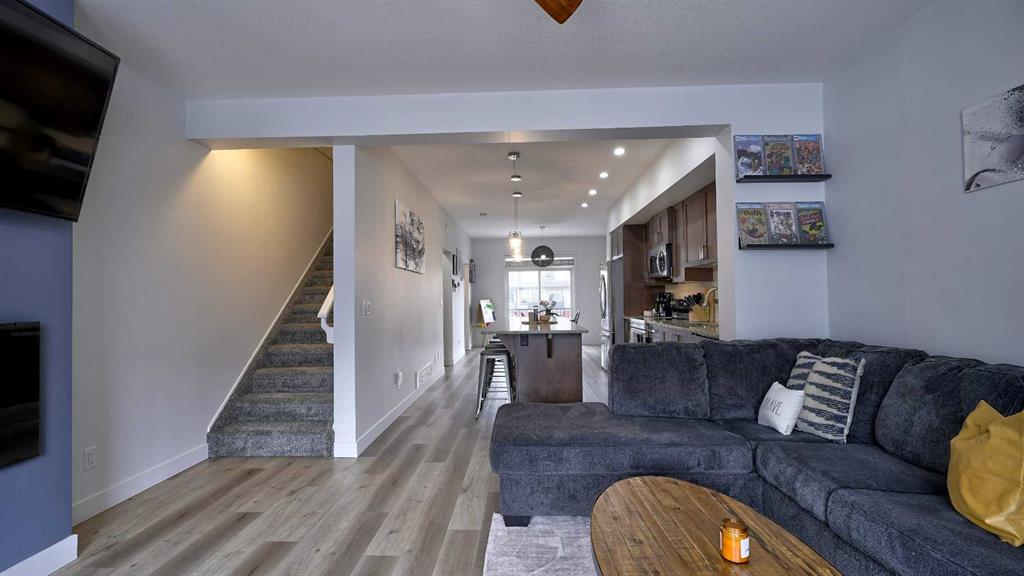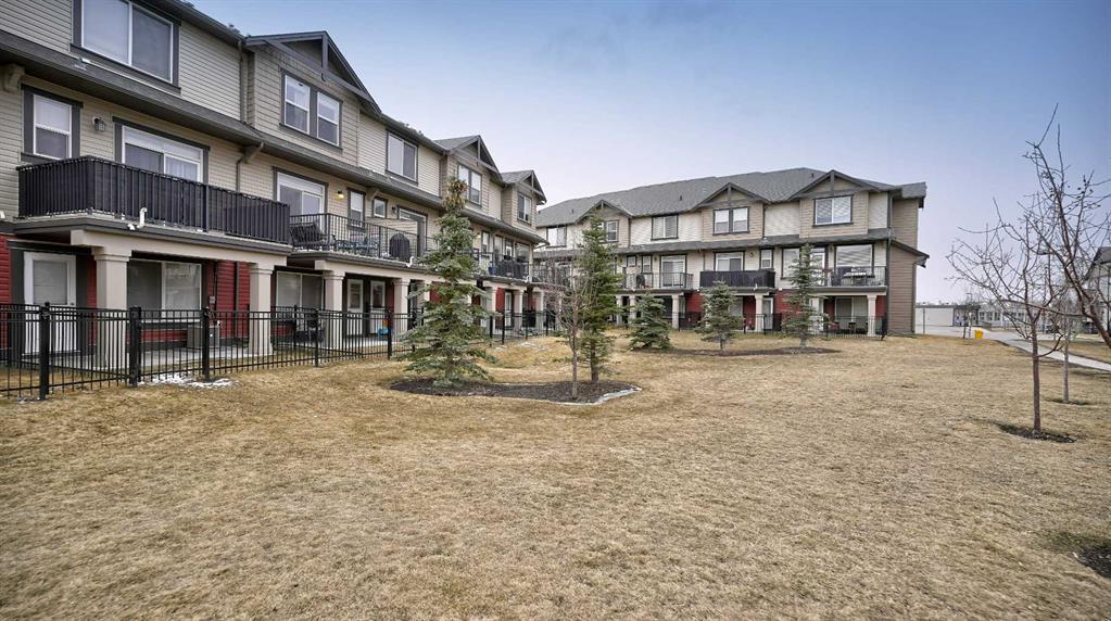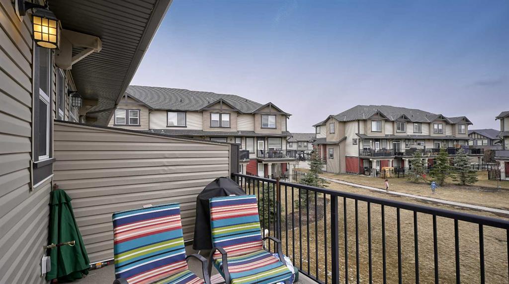 Low maintenance lifestyle living here, w/ quick access to outdoor active living. Entrance way spacious and plus amazing thick newer carpet starting on the stairs. Main floor is perfect for entertaining, being open concept, w/ an abundance of natural lighting. Cozy living room w/ large windows and electric fireplace plus brand new ceiling fan. Massive eat up island, space for all to gather around, w/ granite countertops. Modern pendulum lighting & newer luxury vinyl planking throughout this level. Convenient powder room. Dining room has plenty of space for entertaining, & an unobstructed view of the courtyard. Deck is good sized for enjoying those summer evenings. Laundry facilities are favorably located on the upper level. Master ensuite has double sinks, oversized walk in shower & walk in closet. Carpeting that is throughout is newer, lush and feels amazing on your feet. Tandem parking in this garage, plenty of storage space, plus parking on the driveway. Access to the small fenced yard from the garage. Heron's Crossing Elementary School is just a walk across the street. 60 acres of protected environmental reserve, parks, ponds, playground, bridge, plus miles of trails along Nose Creek are a stones throw away.