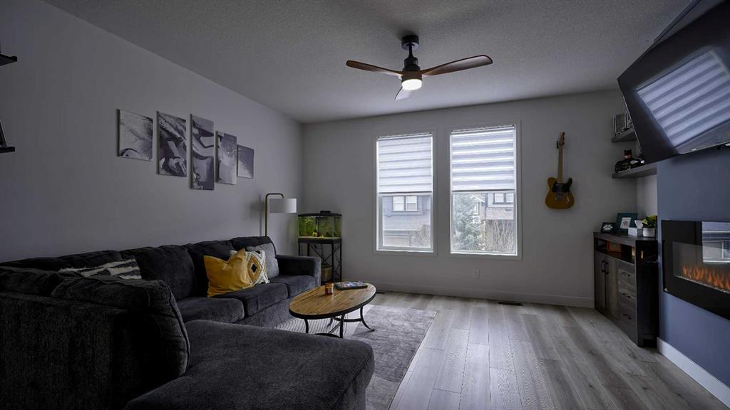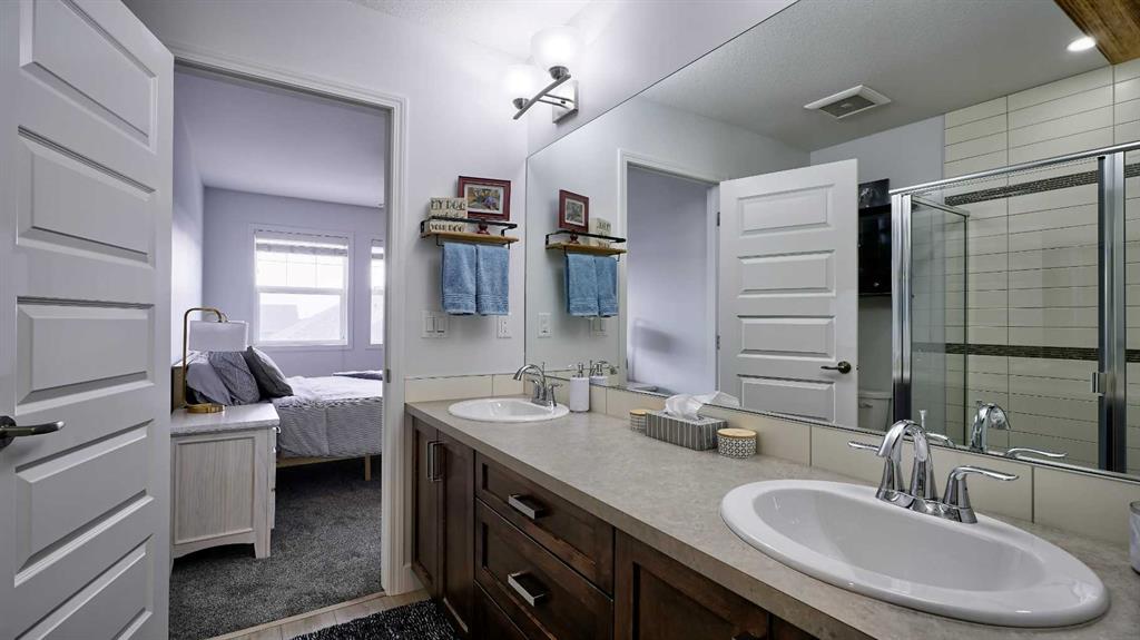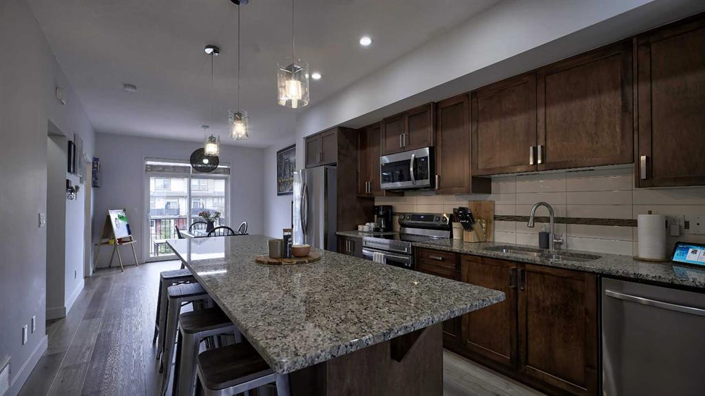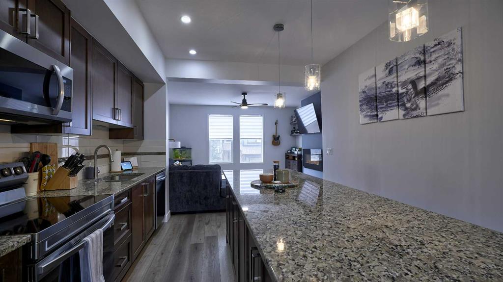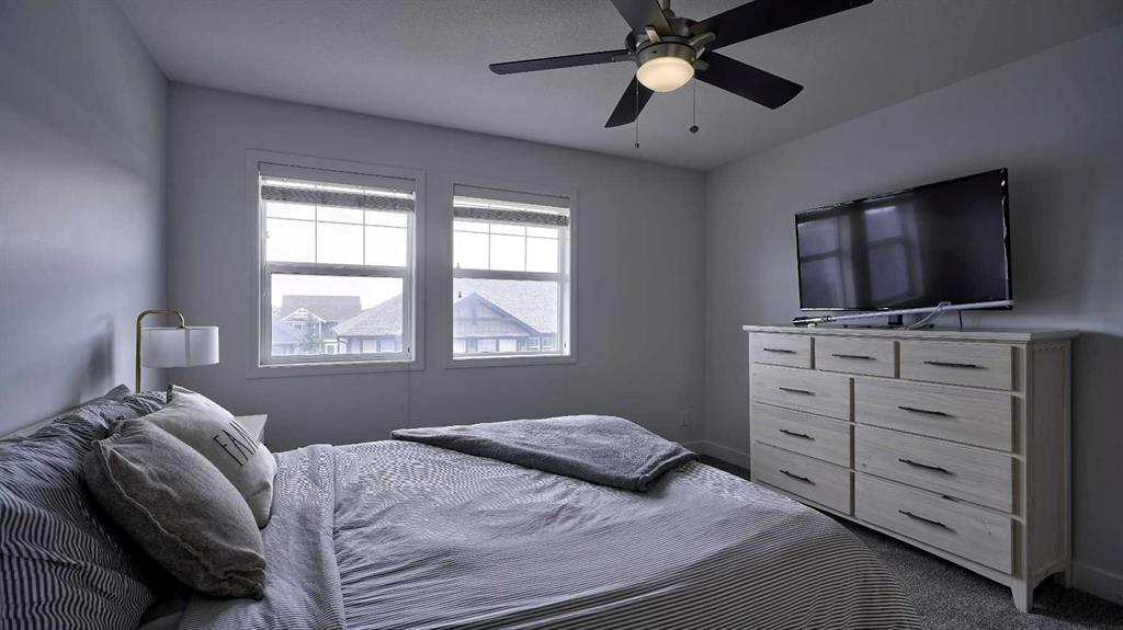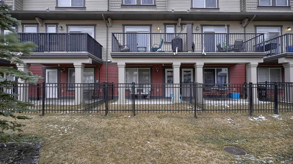 Low maintenance lifestyle living here, w/ quick access to outdoor active living. Entrance way spacious and plus amazing thick newer carpet starting on the stairs. Main floor is perfect for entertaining, being open concept, w/ an abundance of natural lighting. Cozy living room w/ large windows and electric fireplace plus brand new ceiling fan. Massive eat up island, space for all to gather around, w/ granite countertops. Modern pendulum lighting & newer luxury vinyl planking throughout this level. Convenient powder room. Dining room has plenty of space for entertaining, & an unobstructed view of the courtyard. Deck is good sized for enjoying those summer evenings. Laundry facilities are favorably located on the upper level. Master ensuite has double sinks, oversized walk in shower & walk in closet. Carpeting that is throughout is newer, lush and feels amazing on your feet. Tandem parking in this garage, plenty of storage space, plus parking on the driveway. Access to the small fenced yard from the garage. Heron's Crossing Elementary School is just a walk across the street. 60 acres of protected environmental reserve, parks, ponds, playground, bridge, plus miles of trails along Nose Creek are a stones throw away.