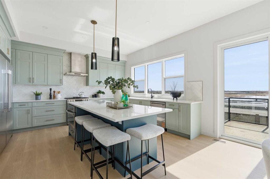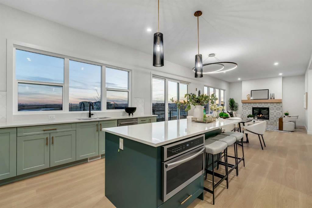 Open House April 19th (Sunday), 12PM-3PM * Dreams come true! *Watch the Video * A fully finished designer estate home offering over 4,200 SQFT of functional living space, this residence is designed to impress at every turn. A luxury estate home that truly checks every box. This stunning showpiece by Aspen Creek Designer Homes, Alberta's one of Alberta's premier luxury builder showcases exceptional craftsmanship & stellar elevated finishings. Located in the growing estate community of Goldwyn, this home offers the charm of prairie estate living with breathtaking pond, downtown, & mountain views - Perfectly situated on a quiet cul-de-sac & no neighbours behind. OVERSIZED TRIPLE GARAGE | L-SHAPED LOT | 5 BEDROOMS + MAIN FLOOR DEN | 5 FULL BATHROOMS | SOUTH BACKYARD | POND VIEWS | EXCELLENT FINISHINGS | STUNNING CHEF'S KITCHEN | SPICE KITCHEN | SPACIOUS BACKYARD | 3 SPACIOUS BEDROOMS UP WITH ENSUITES | BONUS ROOM WITH PRIVATE BALCONY | FINISHED WALKUP 2 BEDROOMS BASEMENT | HARDIE BOARD SIDING The expansive triple garage along with aggregate driveway create a striking first impression. Step through the grand double-door entrance into a soaring open-to-below foyer filled with natural light. The main floor features 10-foot ceilings, 9 Ft doors, oversized windows, & a spacious living room with an elegant tiled fireplace detailing. A magazine-worthy, state-of-the-art chef’s kitchen offering that aura your guests are going to love - timeless cabinetry with gold hardware, glossy backsplash, top-of-the-line appliances including an oversized refrigerator, gas cooktop, chimney hood fan, & built-in microwave. A massive centre island with blue cabinetry provides the perfect gathering space, while the fully equipped spice kitchen adds both style & function. A versatile main floor den with a French glass door sits beside an upgraded full bathroom— ideal for guests, multigenerational living, or a private home office. A generous mudroom offering ample space for a secondary home office. Walking upstairs along the grand wide staircase with designer railing, you'll notice the 9 FT ceilings & 8ft doors followed by a sun-filled central bonus room opens onto a private balcony overlooking the pond. Three spacious upstairs bedrooms each feature their own private ensuites - no compromises whatsoever. The primary suite is a true retreat, enhanced by extra windows, a huge walk-in closet, & a luxurious spa-like ensuite complete with a soaker tub, glass shower with upgraded tile surround, dual sinks, & a private toilet. The two additional south-facing bedrooms enjoy stunning pond views & upgraded attached bathrooms, offering comfort & privacy for family or guests. A massive laundry room with cabinets and tiles Step outside to a huge south-facing backyard that feels like a private summer retreat - ideal for entertaining & relaxing with your family. Dual Furnace Zoning & 72 Gal HWT adding to the efficiency. A fully upgraded over 4200 SQFT luxury home in an estate location.