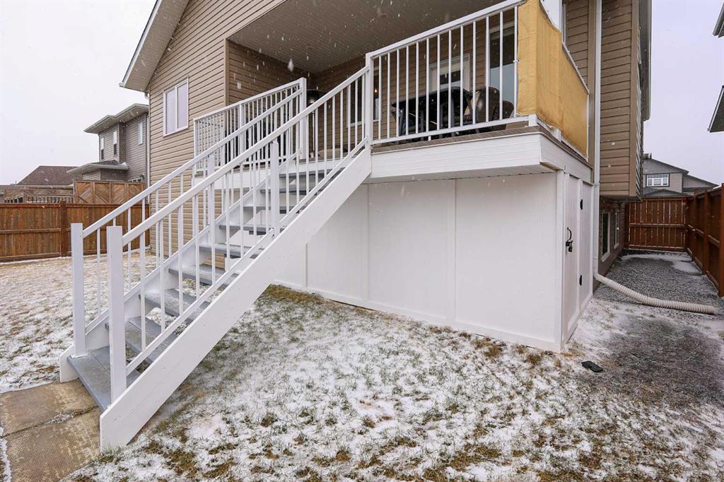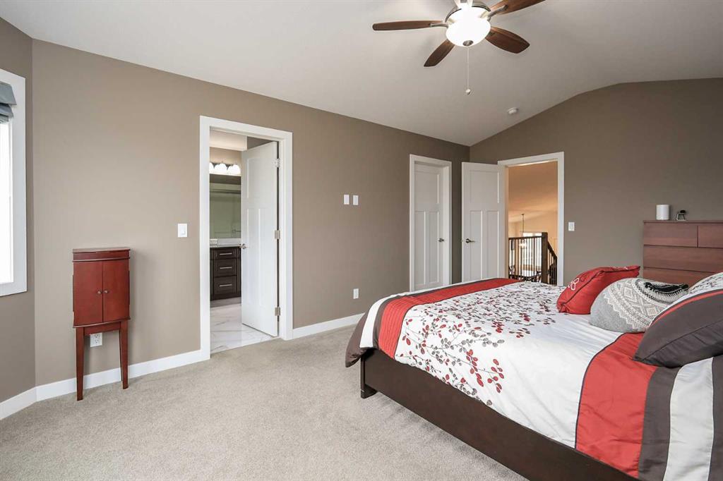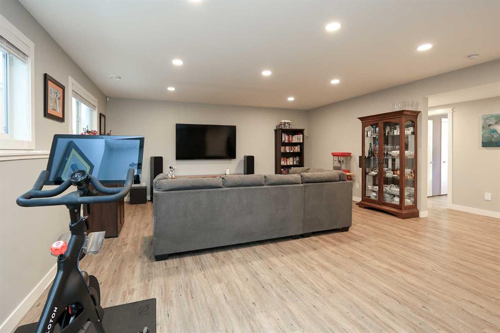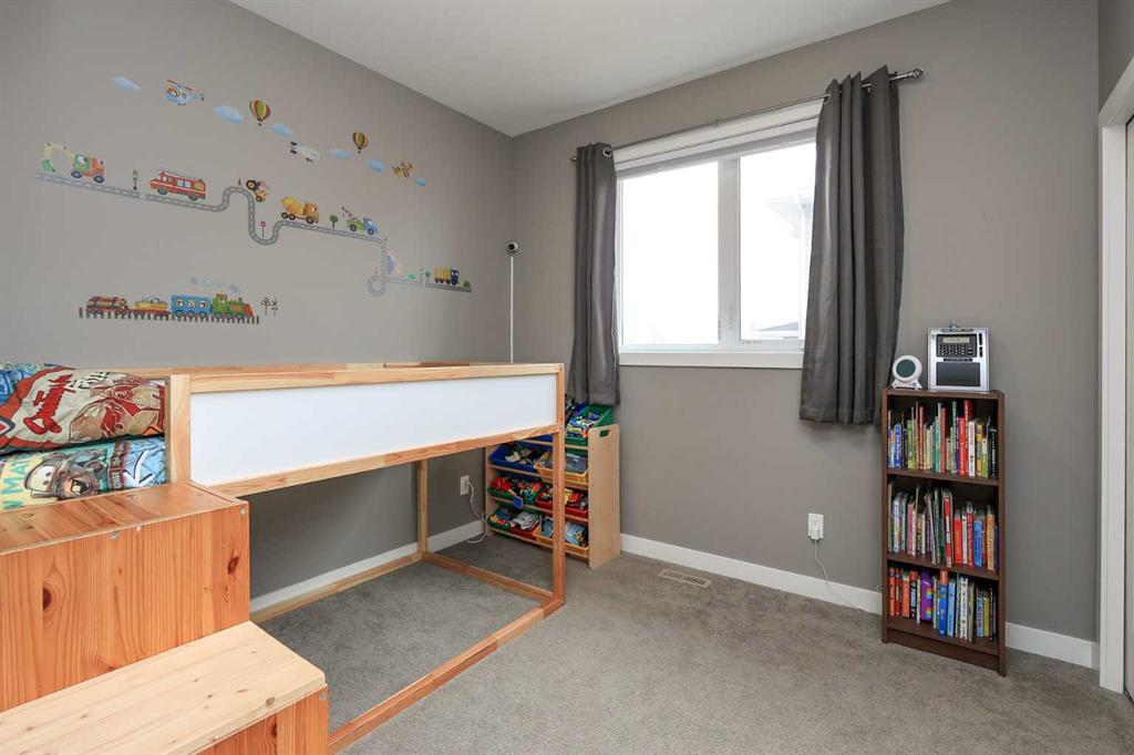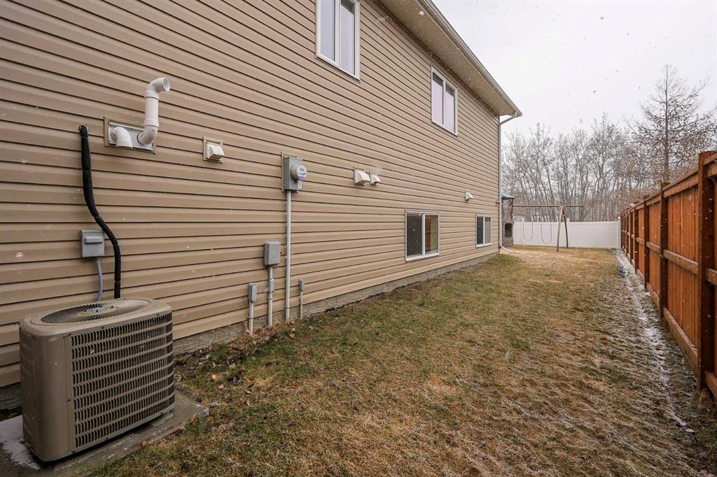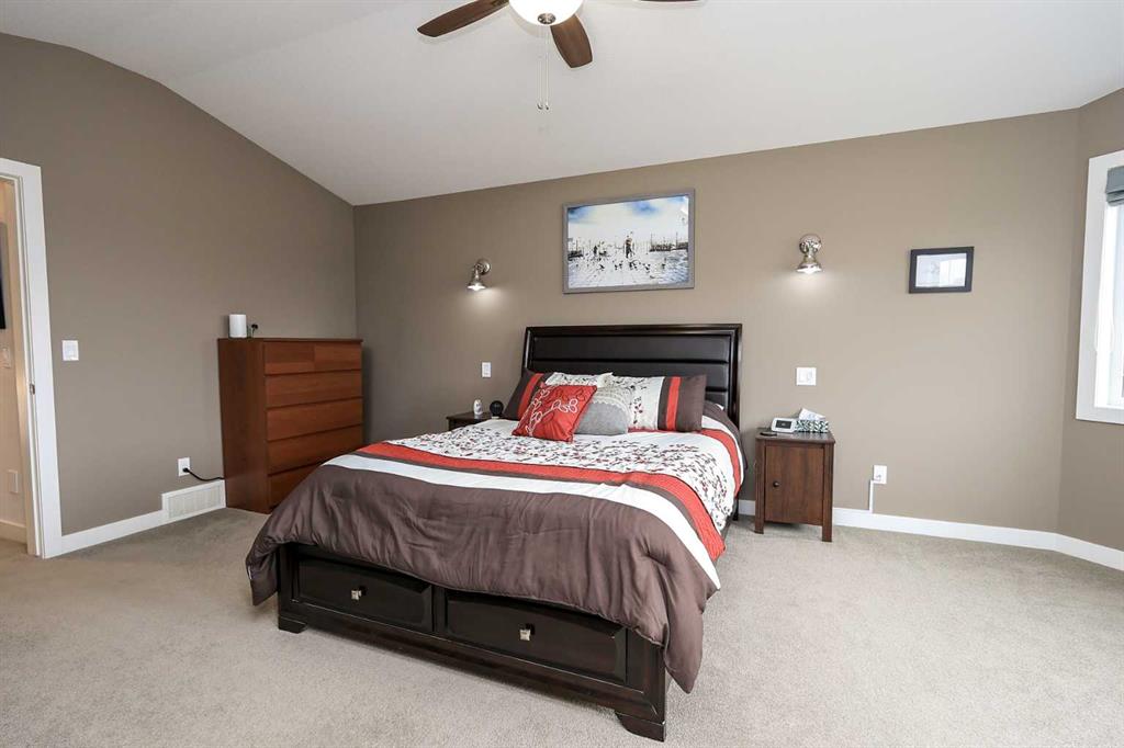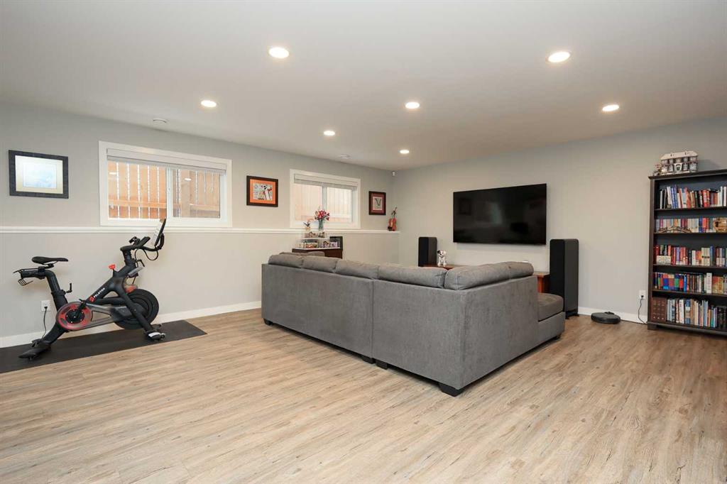 FULLY DEVELOPED 5 BEDROOM (4 up, 1 down), 3 BATH MODIFIED BI-LEVEL ~ HEATED TRIPLE ATTACHED GARAGE ~ NO NEIGHBOURS BEHIND ~ Some upgrades include; Central air conditioning, central vacuum, 2 sets of laundry hook-ups ~ Covered front entry leads to a spacious tile foyer with a mirrored closet and high ceilings that open to the upper level ~ Open concept main floor layout is complemented by soaring vaulted ceilings and hardwood flooring ~ The living room is centred by a cozy gas fireplace with a mantle above ~ Host large gatherings with ease in the spacious dining room with built in cabinets plus garden door access to the covered deck with a BBQ gas line, duradek finish and enclosed storage space below ~ The kitchen offers an abundance of two toned cabinets with crown moulding and pull out drawers, endless quartz counter tops including an island with an eating bar, full tile backsplash, window above the sink, and a wall pantry ~ 3 main floor bedrooms are all a generous size with ample closet space ~ 5 piece main bathroom has tile floors and dual sinks with quartz countertops ~ Main floor laundry hook-ups just off the bedrooms doubles as an oversized linen closet ~ Open staircase overlooks the main floor below and leads to the private primary bedroom with plenty of space for a king size bed and sitting area, a huge walk-in closet and a spa-like 5 piece ensuite with a 6' soaker tub, walk-in shower, and dual sinks with quartz countertops ~ The fully finished basement has high ceilings, large above grade windows and operational in-floor heating ~ The spacious family room with rows of recessed lighting has tons of space ~ Sliding barn door leads to a flex space (currently being used as a home gym) ~ 5th bedroom can easily accommodate a king size bed plus multiple pieces of furniture ~ 3 piece bathroom has a walk-in shower with extensive tile ~ Laundry located in it's own room has built in cabinets, a sink, folding counter and storage closet ~ HEATED triple attached garage is insulated, finished with drywall, has two overhead doors and a convenient man door to the backyard ~ The backyard is fully fenced, with no neighbours behind, has tons of yard space and secure storage below the deck ~ Excellent location; tucked in a family friendly cul-de-sac with easy access to schools, parks, playgrounds, walking trails, and all other amenities close by ~ Pride of ownership is evident in this well cared for home!