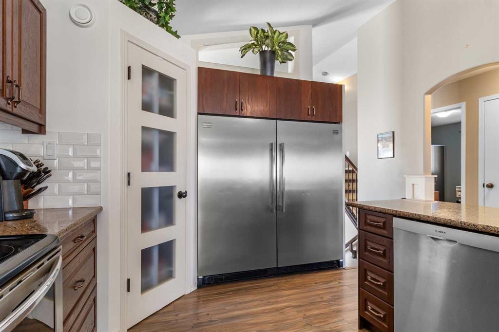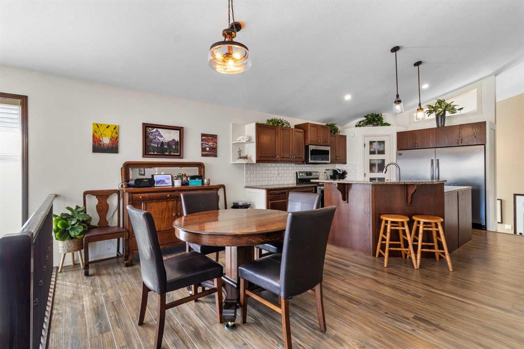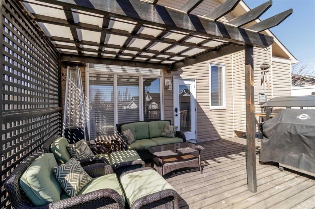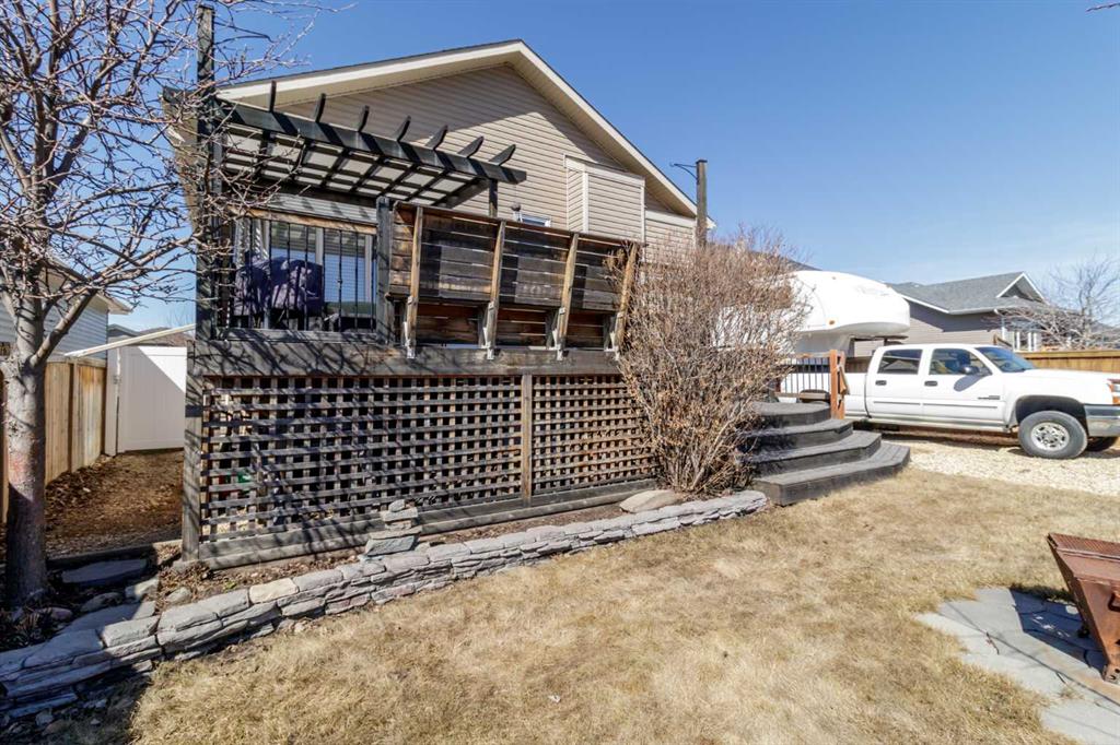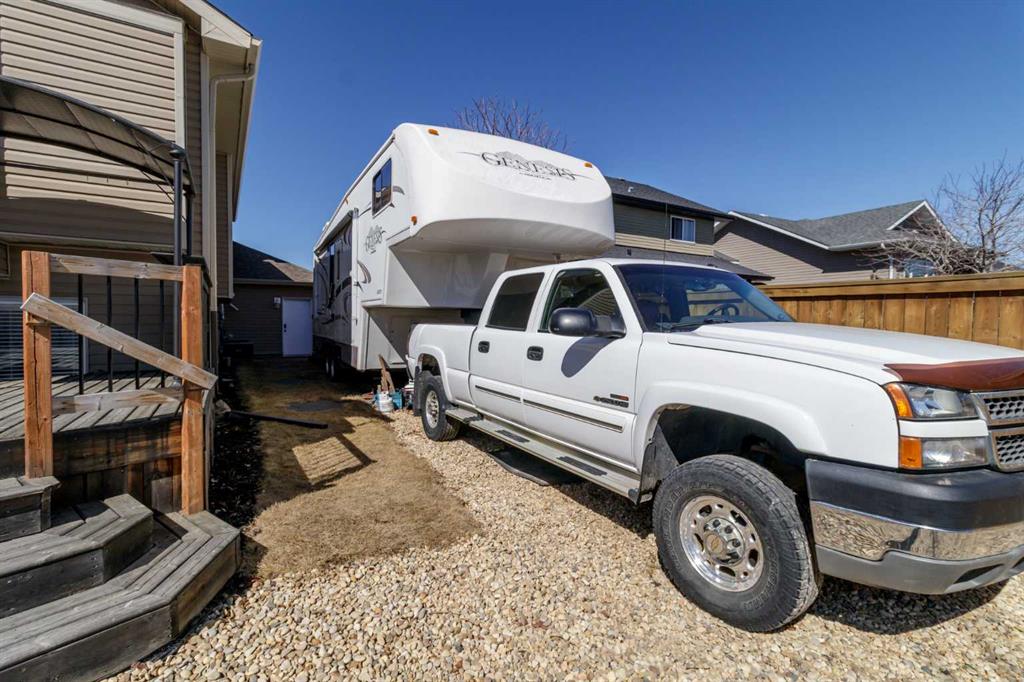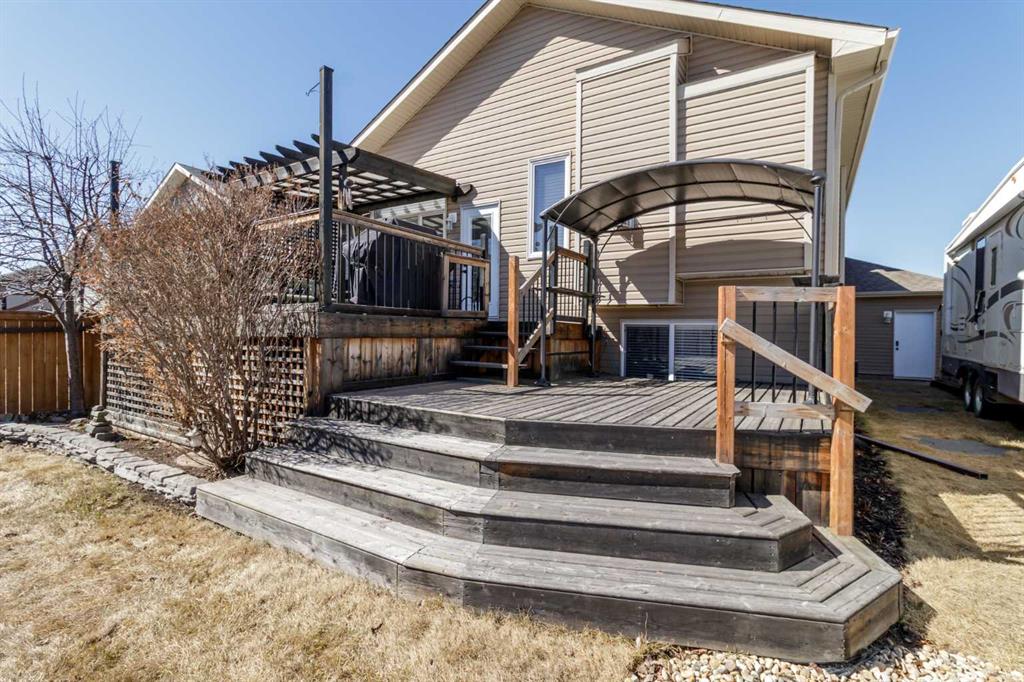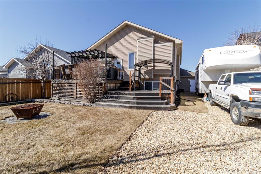 Welcome home to this stunning 5-bedroom, 3-bathroom residence with Triple car heated garage that perfectly blends elegant style with everyday comfort. The open-concept main floor is ideal for entertaining, while dual staircases provide convenient access throughout the home and thoughtful storage solutions. The gorgeous kitchen features granite countertops, soft-close cabinetry, and a massive oversized fridge—all bathed in neutral tones that feel both bright and cozy. Year-round comfort is ensured with in-floor heating and central air conditioning. The real showstopper? Your private backyard oasis. Relax under the covered patio with ambient wired-in lighting, then harvest fresh fruit from your mature plum tree, and two apple trees. This is the entertainers' dream home you've been waiting for. RV/Boat parking in front and back yard **Upgrades include: New garage heater in 2024, Central A/C in 2020, 220v in garage, Newer microwave and dishwasher, new heat exchanger in furnace, new hotwater on demand with separate glycol side for the infloor heat in 2025 & new vinyl fence in the backyard. * Furnace is 2010, roof is 2010