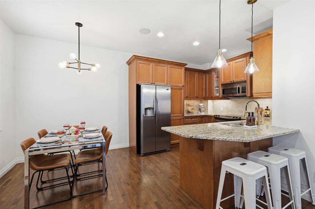 Welcome to this stunning south facing townhome in a well maintained 4 plex offering an abundance of natural light and an inviting open layout. The main floor features hardwood floors, a cozy living room with a gas fireplace, a spacious dining area, and a beautifully finished kitchen with modern cabinetry and stainless steel appliances perfect for entertaining. Upstairs, you’ll find a primary suite with a 4 piece ensuite and walk-in closet, along with an additional bedroom also complete with its own 4 piece ensuite and convenient upper level laundry. The brand new finished basement adds valuable living space with a large recreation area, a bedroom with 3 piece ensuite and plenty of storage. Step outside to enjoy your sun soaked south facing deck and large private patio, ideal for relaxing or summer gatherings. Additional highlights include a detached garage, low condo fees, a built in sound system, new hot water tank (2024), and added roof insulation (2024) for extra efficiency. Located close to Chinook Mall, transit, and just a short drive to downtown Calgary, this home perfectly combines comfort, convenience, and truly a must-see!