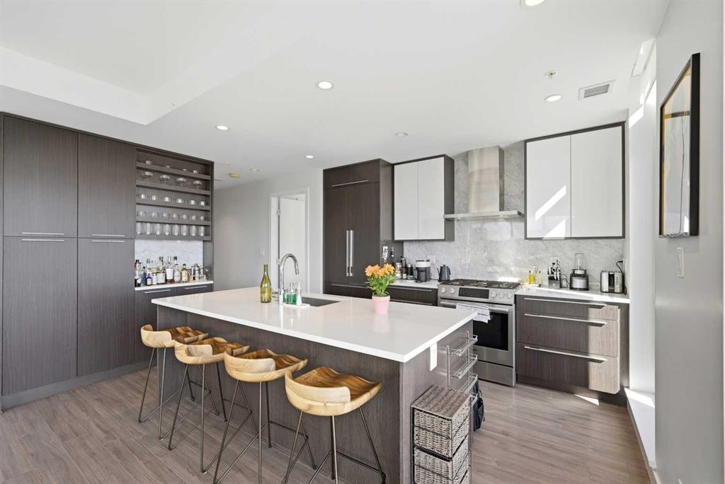 Welcome to The Royal! This stunning 2-bedroom, 2-bathroom southwest corner suite is filled with beautiful afternoon and evening sunshine. The well-designed floor plan and wall-to-wall, floor-to-ceiling windows create a bright, spacious feel throughout. The home features new wide vinyl plank flooring and modern flat ceilings, along with a stylish and functional kitchen complete with quartz countertops, a large central island with breakfast bar, premium appliances including a gas range, integrated fridge and dishwasher, plus a pantry and coffee station. Step outside to the massive double-sized balcony featuring lighting, electrical outlets, and gas BBQ hookups at both ends, perfect for relaxing or entertaining. The spacious primary bedroom includes a walk-in closet and a beautiful ensuite with a large glass shower and double vanity. A second bedroom and full bathroom offer flexibility for guests, a home office, or shared living, while in-suite laundry adds everyday convenience. Residents enjoy outstanding amenities including a fitness center, steam room, sauna, squash court, 24-hour concierge and security, outdoor courtyard, social lounge with TV and billiards, and a spacious rooftop patio with BBQ areas. The building is pet-friendly (with approval) and surrounded by nearby parks and green spaces. This exceptional unit also includes secure heated underground parking, a storage locker, and bike storage, a beautifully maintained urban home in a prime location.