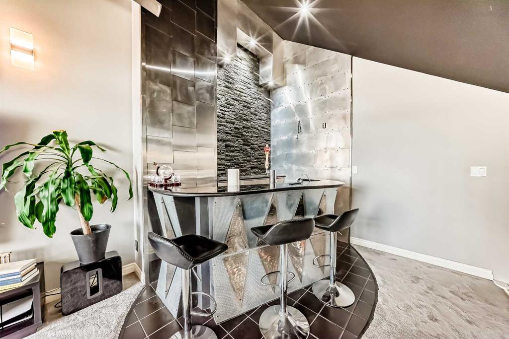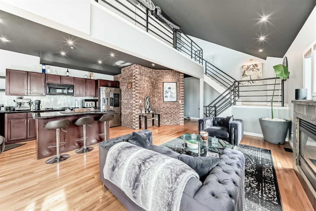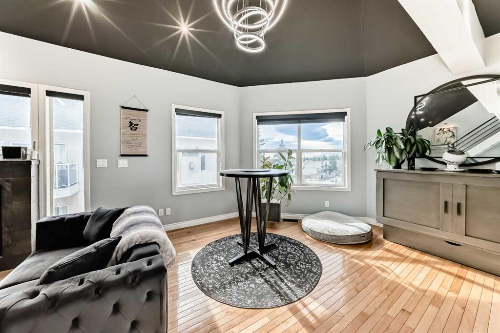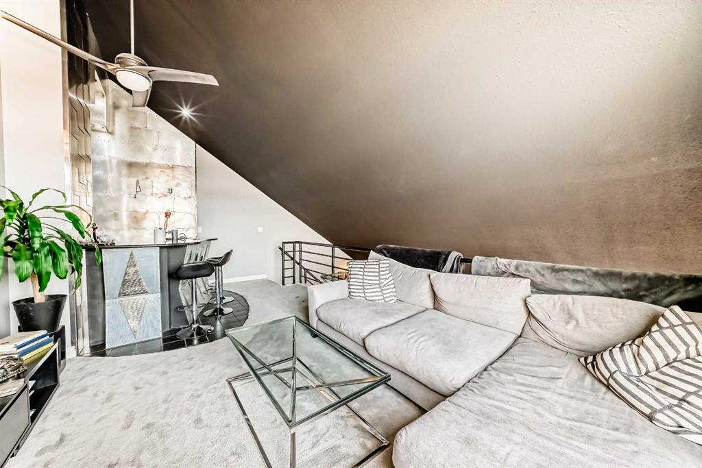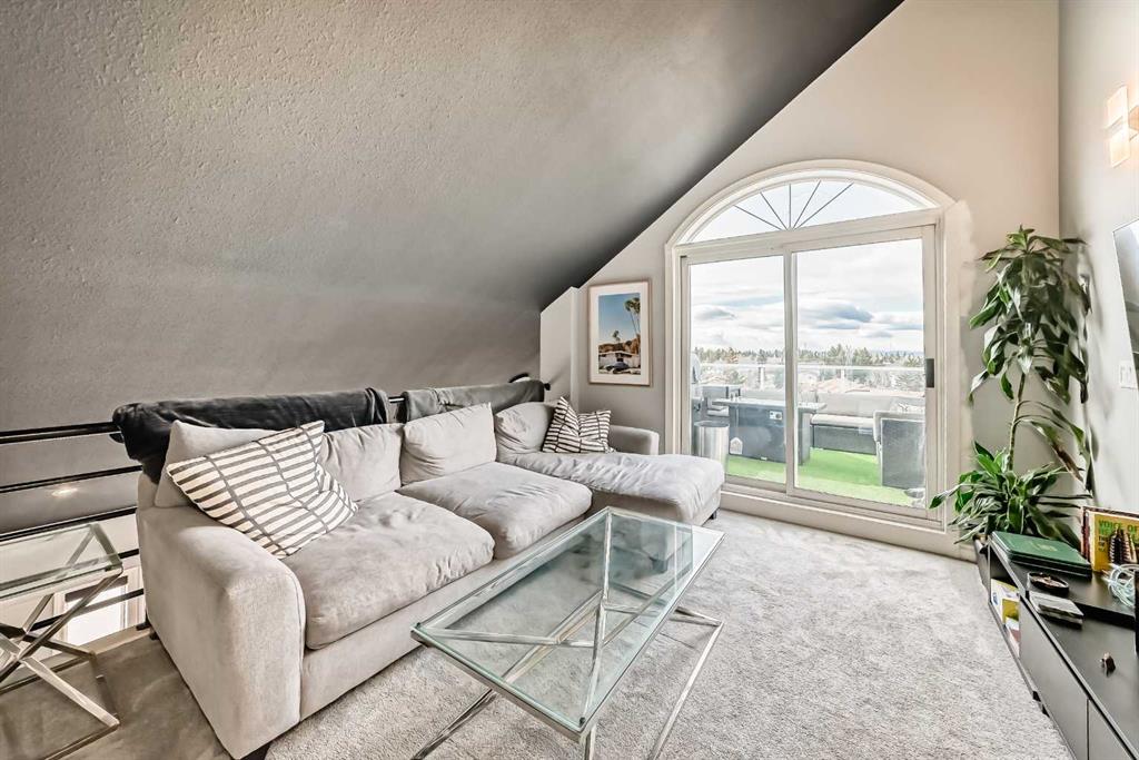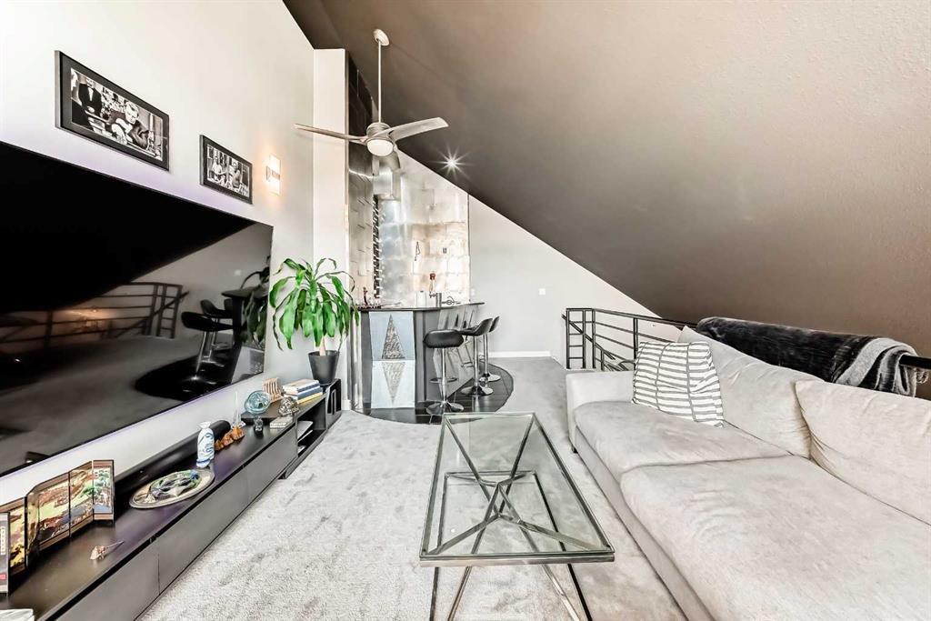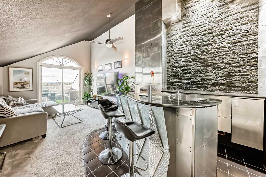 Welcome to this unique 3 level penthouse LOFT! This distinctive unit offers a rare blend of space, character, and city convenience. The main level welcomes you with rich hardwood flooring, soaring ceilings, a striking brick feature wall, and a gas fireplace that anchors the bright, open living area. The kitchen is designed for both everyday living and entertaining, featuring a central island, breakfast bar, generous cabinetry, and abundant prep space. Large windows with plantation shutters fill the home with natural light and frame beautiful west and south-facing views. Upstairs, the loft level creates a unique retreat or flex space which can be converted to another bedroom. Complete with a stylish wet bar and access to a private patio—ideal for hosting or unwinding in a quiet setting. The lower level features a spacious primary bedroom and a beautifully finished ensuite with marble and slate tile, plus a relaxing steam shower for a spa-like feel. This penthouse also includes two titled underground heated parking stalls and a large assigned storage locker. Located steps from shops, restaurants, parks, and pathways, with quick access to Signal Hill, Aspen, West Springs, downtown, and the mountains, this home offers the perfect balance of comfort, style, and location. A truly exceptional opportunity in one of Calgary’s most desirable west-side communities.