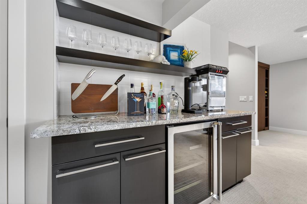 Rare opportunity to own a fully renovated townhouse in the coveted community of Currie Barracks. Flooded with natural light, the main floor showcases hardwood flooring, high ceilings, and a spacious dining area that flows seamlessly into a stunning custom kitchen featuring a quartz waterfall island, built-in stainless steel appliances, buffet with wine fridge, and extensive cabinetry. The oversized living room is anchored by a gas fireplace with a beautiful stone mantle and custom built-ins. Step outside to a thoughtfully designed backyard with a large Kayu hardwood deck and a beautifully landscaped lower garden. The insulated double detached garage is finished with epoxy flooring and custom storage. Upstairs, the primary retreat offers a massive walk-in California Closet and a spa-inspired ensuite with heated floors, soaker tub, separate shower, and dual vanities. A second bedroom with its own ensuite and walk-in closet, plus convenient upper-floor laundry, complete this level. The sprawling third level is ideal as a bedroom, home gym, or recreation room. The thoughtfully designed lower level is designed for entertaining, with a cozy media room, built-in speakers, Murphy bed with shelving, wet bar with wine fridge, and an additional full bathroom. Added highlights include a built-in sound system throughout and air conditioning for year-round comfort. Exceptionally well planned, Currie Barracks offers outstanding schools, scenic walkways, beautiful parks, and a growing collection of restaurants, cafés, and breweries, all just a short 10-minute drive to Downtown Calgary. Perfect for young professionals, this vibrant inner-city community delivers an unbeatable lifestyle.