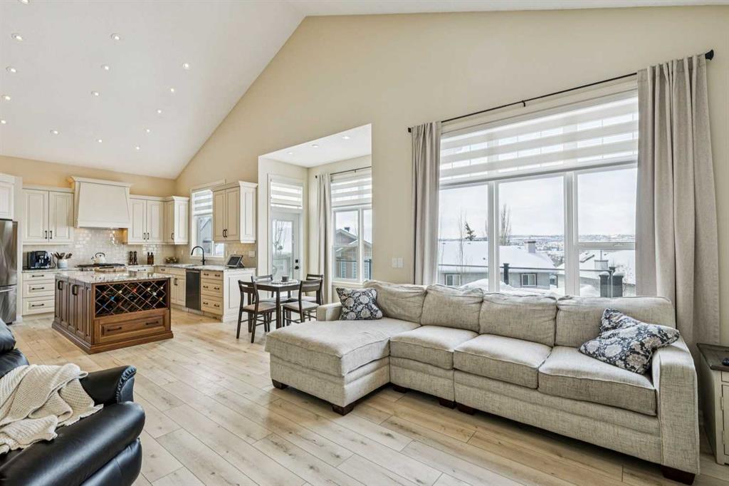 WOW. This stunning two-storey home in Hanson Ranch delivers a rare combination of breathtaking views, extensive upgrades, and a one-of-a-kind setting on a large pie-shaped lot. From the moment you arrive, the pride of ownership is unmistakable. The exterior has been completely refreshed with a rubber-coated driveway, new roof, air conditioning, freshly painted stucco, and a TimberTech composite deck featuring Kichler hardwired lighting and convenient gas hookups on both the upper and lower levels. Stairs lead down to a beautifully landscaped backyard complete with stone patios and retaining walls. Step inside and prepare to be impressed. The main floor showcases new vinyl plank flooring and fresh paint throughout, creating a bright and modern feel. A thoughtfully designed layout offers a spacious home office, formal dining area, and an incredible custom kitchen from Legacy that truly anchors the home. Featuring a large island, two-tone cabinetry with soft-close drawers and doors, gas range, custom hood fan, and a generous pantry, this kitchen is built for both everyday living and entertaining. A Kinetico water softener adds comfort and quality throughout the home. The adjacent living room impresses with soaring 18-foot vaulted ceilings and flows seamlessly to the back deck, where you can take in the incredible elevated views. Upstairs, the primary retreat offers both space and comfort, complete with a walk-in closet and a well-appointed 5-piece ensuite. Two additional bedrooms and a full 4-piece bathroom provide plenty of room for family or guests. The fully finished walkout basement expands your living space with a massive recreation area, wet bar with full sized refrigerator, fourth bedroom, and another full bathroom—perfect for entertaining or multi-generational living. Step directly outside to your private, beautifully landscaped yard, an ideal setting for relaxing or hosting. Extensively updated, ideally located, and truly unique—this is a rare opportunity to own a standout home in one of NW Calgary’s most desirable communities.