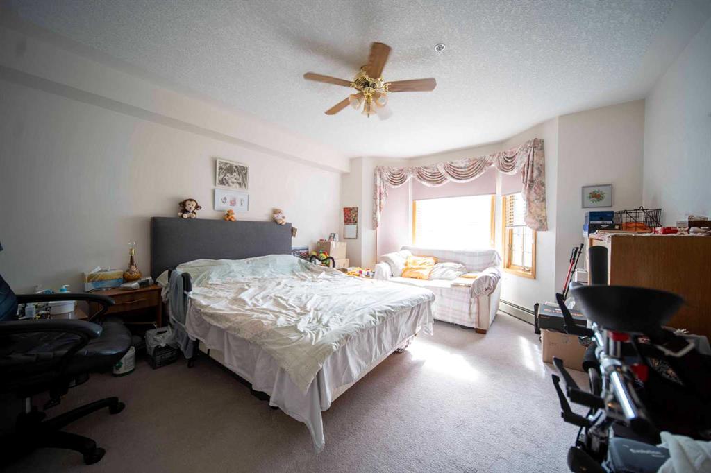 Welcome to this meticulously maintained and truly charming home. Mature Living: like living on a cruise ship without the seasickness and cramped space. You will not want to miss the opportunity to own this spacious unit in a beautifully kept, resort-style building. Offering over 1,400 square feet of living space, this expansive condo features two large bedrooms and a versatile den, giving you all the room you need for comfort, work, and relaxation. The bright and inviting primary bedroom showcases a lovely bay window and includes a four-piece ensuite with a shower/tub combo, a linen closet, and a generous walk-in closet. The secondary bedroom is ideal for guests or a home office. The open and airy kitchen flows seamlessly into a roomy formal dining area and a huge living room centered around a cozy fireplace, creating the perfect setting for unwinding or entertaining. Large windows throughout the living area fill the space with natural light, enhancing the warm and welcoming atmosphere. A three-piece main bathroom and a large in-suite laundry room with abundant storage add everyday convenience. Additional thoughtful touches include a spacious entry foyer, tile flooring, a wall-mounted A/C unit, a large kitchen pantry, built-in features, and linen closets in both bathrooms. The west-facing balcony has been recently upgraded and partially enclosed to block the wind, making it the perfect spot to enjoy long summer evenings. Pride of ownership is evident throughout this warm and cozy home. An assigned underground parking stall with a storage locker keeps your vehicle warm year-round. This 55+ community offers an impressive array of amenities, including an indoor pool and hot tub, a fitness room, a library, a craft room, a games room with pool tables and shuffleboard, a party room, and rentable guest suites. A fully equipped woodworking shop and two car wash bays in the parkade further elevate the lifestyle offered here. Condo fees include all utilities, and pets are welcome with board approval, subject to weight restrictions. The location is unbeatable, with easy access to major routes, shopping, transit, grocery stores, restaurants, and plenty of green space in the surrounding area. Don’t wait to book your showing. This beautiful space is ready to welcome you home.