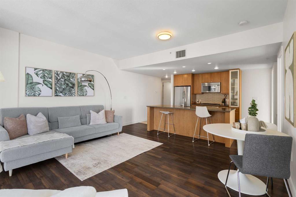 Imagine waking up to golden sunlight pouring through floor-to-ceiling windows, Rocky Mountain sunsets painting your evenings, and everything you love about Calgary just steps from your door. This is THE home. Nestled in the heart of Beltline/Downtown West neighbourhood, this meticulously maintained 2-bedroom, 2-bathroom corner home is move-in ready at the highly sought-after Nova building. Complimentary premium furnitures are included, making it perfect for families and young professionals alike. Offering 864 SF of thoughtfully-designed open-concept living space, this bright and sunny unit is bathed in natural light with stunning southwest-facing views. Concrete construction with excellent soundproofing and a peaceful school-facing orientation mean you'll truly feel at home with calm and quiet. The warm neutral colour tones, rich laminate wood flooring, tall 9-foot ceilings, and an abundance of natural light create a space that feels elegant and effortlessly livable. The year-round central heating and cooling keeps you perfectly comfortable in every season. The spacious living and dining areas flow seamlessly into a premium gourmet kitchen featuring a large quartz island, Bosch gas stove and oven, dishwasher, and Fisher & Paykel refrigerator—ideal for weeknight dinners or weekend entertaining. The master bedroom is a private retreat with a walk-through closet and spa-inspired bathroom, while a well-sized second bedroom offers the flexibility to grow—guest room, home office, or space for the people you love. Central air conditioning keeps the home cool and comfortable during Calgary’s summer days As a resident of the highly sought-after Nova building, you'll enjoy a fully equipped fitness centre, resident lounge, guest suites, and 24/7 concierge service. The location shows off city convenience with neighbourhood soul—just a 2-minute walk to Co-op, 7 minutes to C-Train, steps from the vibrant 17th Ave, and a short walk to the Bow River pathway and Prince's Island Park. Modern comfort, unbeatable location, and outstanding amenities, all in one. This is more than a condo — it's urban living at its finest, the lifestyle you deserve. Come see it for yourself!