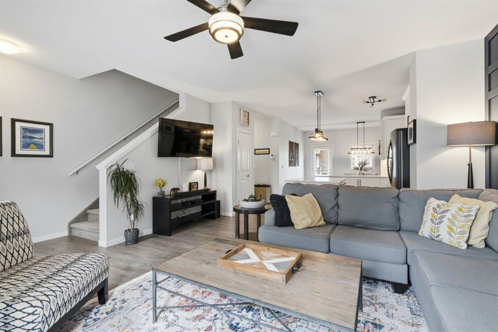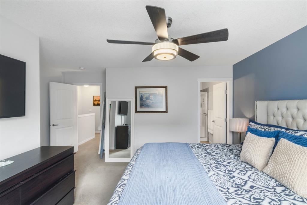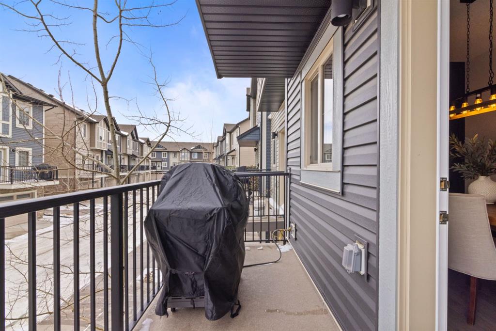 Located in the heart of Legacy, this stylish 3-storey 3 BED/2.5 BATH townhome in Legends of Legacy offers over 1700 sq ft of thoughtfully designed living space, a double attached garage, and the perfect balance of privacy and open-concept living along with Air Conditioning for year round comfort. The ground level welcomes you with a bright front den ideal for a home office, gym, or flex space, along with direct access to the insulated and drywalled garage. Upstairs, the main living level is the true heart of the home, featuring a spacious open concept kitchen, dining, and family room anchored by quartz countertops, stainless steel appliances, generous cabinetry, and a separate pantry. Two private balconies extend your living space, one complete with a gas line for effortless summer BBQs, while a convenient tucked away 2-piece bath and in-suite laundry add everyday functionality. The top floor is warm and inviting with brand new carpet throughout, a spacious primary retreat with walk-in closet and private 3-piece ensuite, plus two additional good sized bedrooms bedrooms and a full 4-piece bath. Just steps from scenic walking paths, green space, schools, shopping, and transit, this move-in ready home delivers style, comfort, and low-maintenance living in one of Calgary’s most desirable south communities.