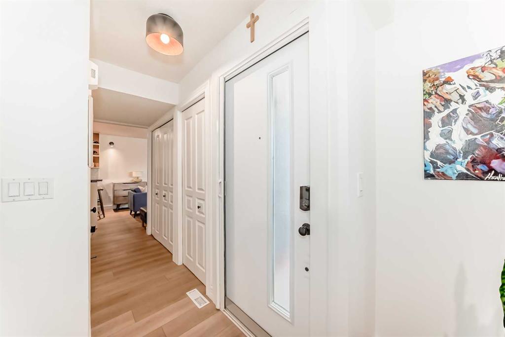 Don’t miss this beautifully upgraded 2-bedroom + bonus room, 1.5-bath, ground-level corner unit townhouse—a rare opportunity offering style, space, and exceptional value in the heart of Glamorgan. Thoughtfully updated throughout and finished in a modern, neutral palette, this home immediately stands out. The fully renovated kitchen features professionally painted Benjamin Moore cabinetry extended to the ceiling, sleek black hardware, and newer stainless steel appliances, including a Samsung over-the-range microwave, French-door refrigerator, and slide-in convection stove—creating a clean, contemporary space that’s as functional as it is inviting. New luxury vinyl plank flooring flows seamlessly throughout, complemented by hexagon tile accents, French-inspired subway tile, fresh Benjamin Moore paint, and three stunning feature walls that add warmth and personality. A cozy gas fireplace anchors the main living area, making it the perfect space to relax or entertain. Upstairs, you’ll find two generously sized bedrooms, convenient upper-level laundry hookups, and a beautifully renovated bathroom showcasing modern finishes and quality craftsmanship. Step out from the second bedroom onto your private upper deck—an ideal retreat for morning coffee or evening unwinding. Outside, the fully fenced and decked yard is designed for easy outdoor living, with room for both dining and lounging, plus a touch of green space with turf—perfect for pet owners. This unit also features one of the most desirable garages in the complex—a rare oversized 2.5-car heated garage, offering incredible flexibility for parking, storage, or even a workspace. Major exterior updates—including roof, siding, hot water tank, and patio doors—have already been completed, providing peace of mind. The well-managed complex offers a healthy reserve fund, and condo fees conveniently include water, sewer, and garbage removal. Perfectly positioned across from a quiet park, this location offers both tranquility and accessibility, with quick connections to Glenmore, Sarcee, Stoney, and Crowchild Trails. You’re just 5 minutes to Westhills Shopping Centre, close to schools, pathways, and amenities, and only 15 minutes to downtown. With proximity to North Glenmore Park and the Weaselhead Natural Area, this home offers the perfect balance of urban convenience and outdoor lifestyle. Stylish, functional, and move-in ready—this is one you don’t want to miss.