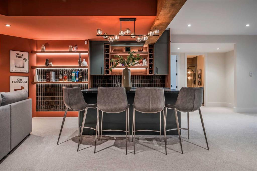 Welcome to a true showstopper—this custom-Two storey Home built by Monogram, is nestled in Altadore’s only cul-de-sac on an expansive 11,905 SqFt southwest-facing pie lot. Offering over 7,233 SqFt of refined living space, this home seamlessly blends architectural elegance with modern functionality. Step inside to soaring ceilings, natural light, and wide-plank white oak hardwood throughout. A spacious foyer leads to a stylish powder room adorned with quartz finishes. The open-concept kitchen and living area is a designer’s dream: 18-foot vaulted ceilings, skylights, and custom chandeliers enhance the airy ambiance. The gourmet kitchen features dual Sub-Zero fridge/freezer units, a Fisher & Paykel built-in espresso machine, custom oak-walnut cabinetry, and a black soapstone island with a farmhouse sink. A Wolf 6-burner gas range, pot filler, and double ovens make this space a chef’s paradise. The adjacent butler’s pantry offers a wine fridge, bar fridge, soapstone counters, and another farmhouse sink—perfect for entertaining. Slide open the glass doors from both the kitchen and living room to access two large decks overlooking the spacious backyard. The main living room features high ceilings adorned with wood beams and is anchored by a stunning wood-burning fireplace with built in walnut ottomans on either side and a built-in bar area—ideal for cozy nights or hosting guests. The south wing includes a formal study finished with beautifully built in walnut cabinetry and with the room wrappe in a gorgeous wallpaper that shouts sophistication. Just adjacent is a designer laundry room with quartz countertops, extensive cabinetry, and an LG steam drying rack. The grand primary suite is a luxurious escape, vaulted ceilings with wood beams, fireplace, a private balcony, spa-style ensuite with steam shower, soaker tub, dual vanities, and a large walk-in closet with solid wood cabinetry, quartz island, built-in coffee bar, and a second balcony. Upstairs, a cozy loft lounge with fireplace and built in cabinetry surrounding the T.V area. Just adjacent are to two generously sized bedrooms, each with walk-through closets and their own stylish full ensuites. The lower level is a sanctuary for relaxation and enjoyment with plush carpeting and zoned in-floor heating throughout. Jaw dropping ambiance as you enter the basement, painted in beautiful Terraccota clay with ambient lighting a feature soapstone bar with elongated walnut back cabinetry, wine room, wine fridge, mini fridge & dishwasher. Just adjacent is gym with vinyl plank flooring and water filtration, another bedroom, and a full 3-piece bathroom. On the other end of the basement two large bedrooms, a 5-piece bath, and a rec room painted in a rich, muted green with slightly cool undertones giving the room a refined lounge style feel with gas fireplace, wet bar and pool table. Prime location & minutes to schools, parks, tennis courts, golf course, many restaurants and shops & 963$ a square foot! Tremendouse value!
