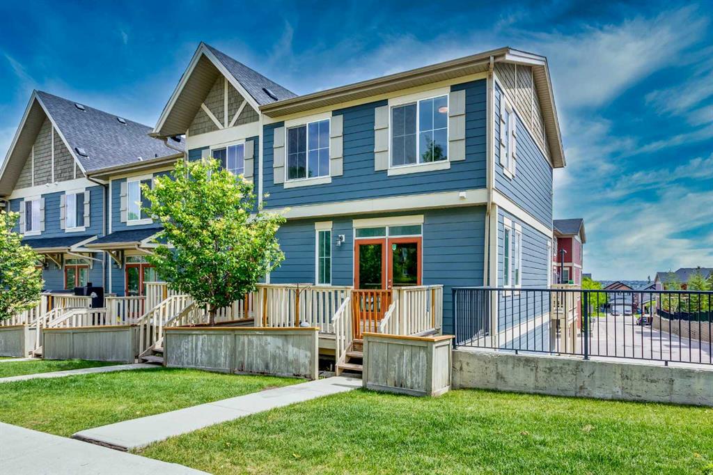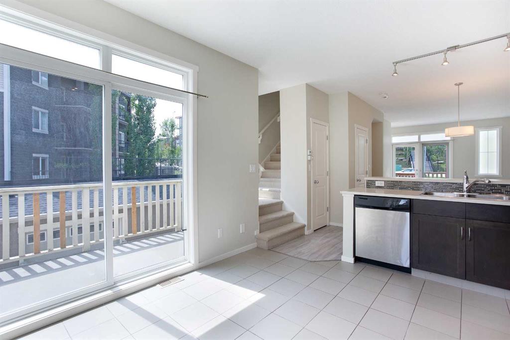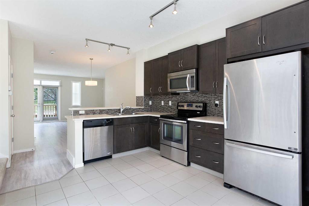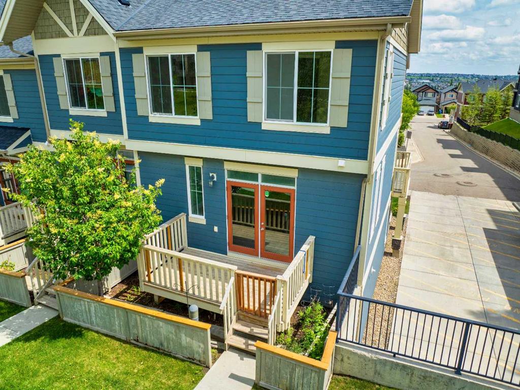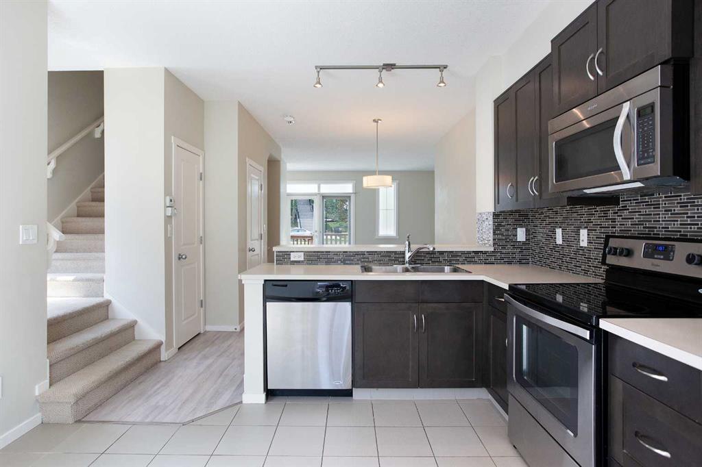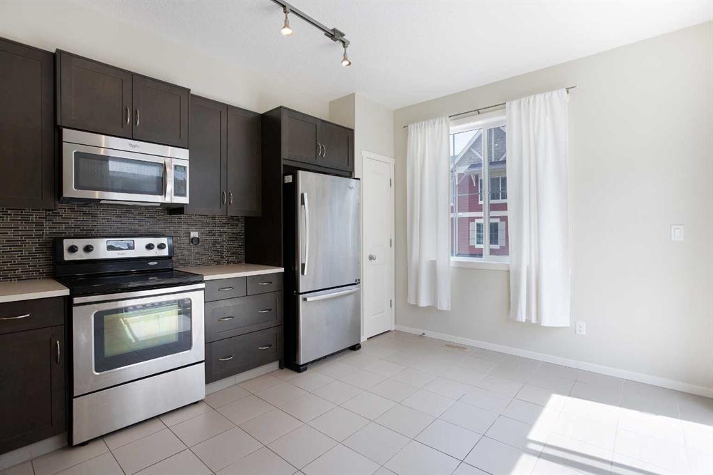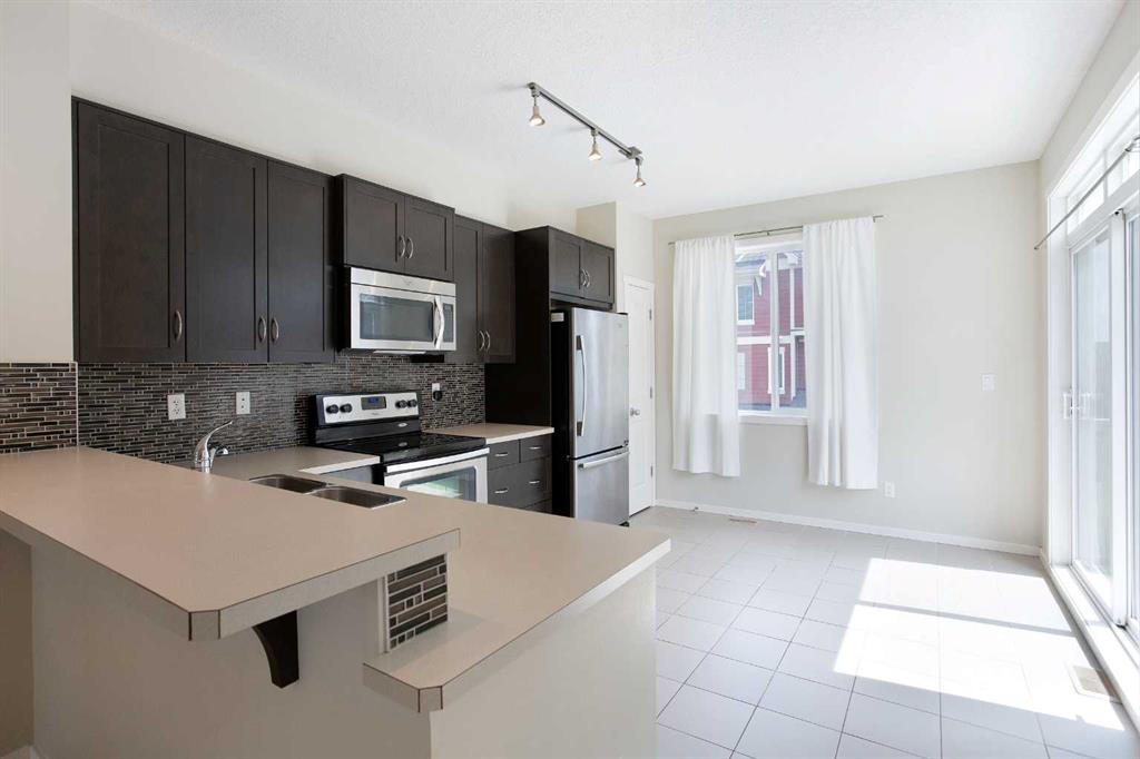 Welcome to this stylish and turnkey end-unit townhouse in the highly sought-after community of Kincora. Built by Homes by Avi Urban, this beautifully designed 3-bedroom home offers over 1,300 sq.ft. of living space with smart functionality, contemporary finishes, and abundant natural light throughout. The main level features 9-foot ceilings and a bright, open-concept layout ideal for modern living. The central kitchen is well-appointed with Whirlpool stainless steel appliances, rich wood cabinetry, a raised eating bar, and a corner pantry for extra storage. Adjacent to the kitchen, the dining area flows into a sunny living room that opens onto your private south-facing balcony—perfect for morning coffee or evening relaxing. A second balcony off the kitchen includes a gas line for BBQ, extending your summer entertaining space. A convenient powder room completes the main floor. Upstairs, you’ll find three spacious bedrooms including a primary retreat with a walk-in closet and private 3-piece ensuite. Two additional bedrooms share a full 4-piece bath, and the upper-level laundry means no more hauling clothes up and down stairs. Downstairs, enjoy direct access to your oversized tandem double garage with plenty of room for two vehicles, bikes, and seasonal storage. There’s also visitor parking right outside, and the beautifully landscaped central courtyard adds a tranquil, park-like feel to the complex. Additional features include durable laminate and carpet flooring, oversized windows, and low-maintenance condo living with fees that cover lawn care and snow removal. Enjoy quick access to Stoney Trail, Shaganappi Trail, Creekside Shopping Centre, parks, pathways, and more. Whether you're a first-time buyer, investor, or downsizer—this property is an ideal fit. Just move in and enjoy!