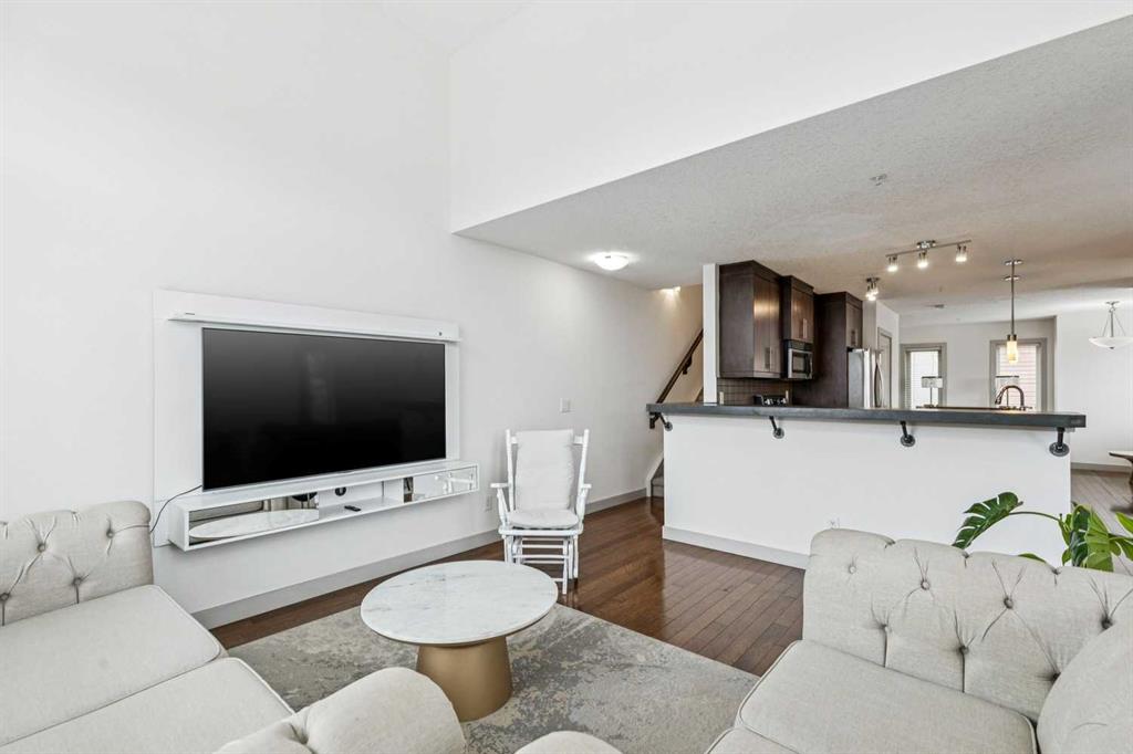 This gorgeous contemporary stacked townhouse delivers over 1050sq ft of impeccably designed highly functional living space. Expansive windows and vaulted ceilings allow incredible light flow throughout the loft-like layout of this home, with gorgeous hardwood floors adding sophistication and warmth. The open concept floor plan can be configured to best suit your lifestyle, with lots of room for a seating/living area, dining space and/or a casual home workspace. The star of the main level is the stunning kitchen that has everything you need for easy everyday living. You’ll love all the storage and counter space, along with the stainless-steel appliances. Sleek granite counters are complemented by rich cabinetry and modern finishings. Bar-style seating is idea for quick meals on the go or chatting with friends over drinks. There is also a balcony/patio for the warmer months – with south and east exposure. It’s great for outdoor dining or enjoying a quiet cup of coffee in the morning. Upstairs you’ll find two well-sized sunny bedrooms and a 4-piece washroom. Both rooms big windows and ample closet space. You’ll enjoy the convenience and security of your assigned underground parking stall. The property’s professionally designed and managed landscaping also adds fantastic curb appeal! This two-bedroom 1.5 bath home is an under 10 min drive to downtown and just steps to the trendy shops, cafes and restaurants of Marda Loop. You’ll be just blocks away from events and activities at the community association as well as the Calgary Public Library. This superb location alongside the design and functionality of this home makes this property ideal for those looking for an elevated urban lifestyle.
