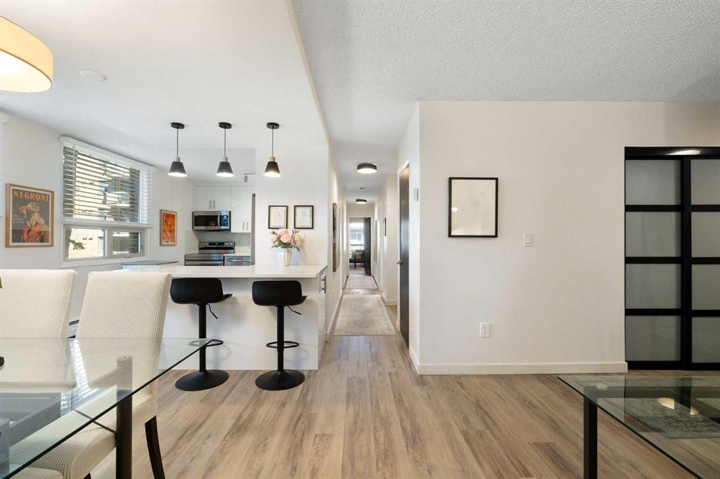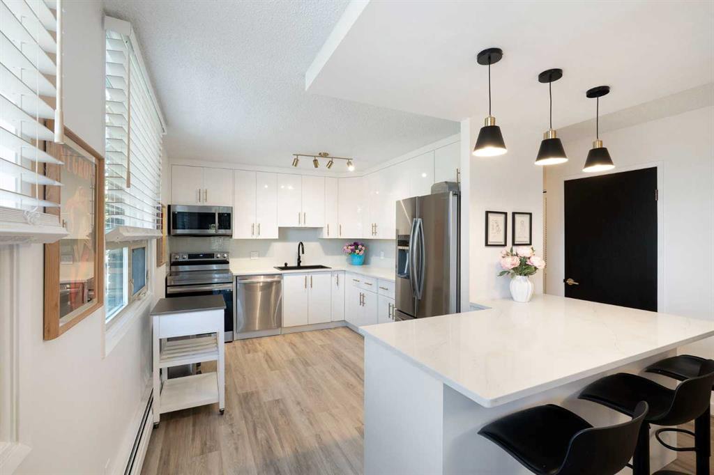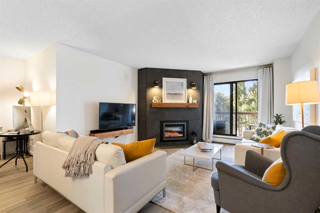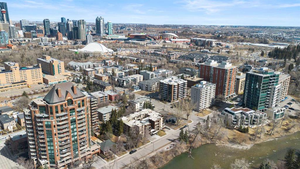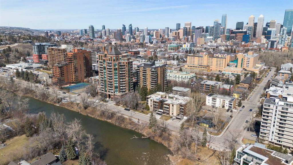 Welcome to RiversEdge—where location and lifestyle meet. This beautifully renovated 2-bedroom, 2-bathroom + den condo offers over 1,220 sq ft of bright, open living space with windows on three sides, flooding the home with natural light from the south, west, and north. Enjoy two large, private balconies—perfect for morning coffee or evening unwinding. The thoughtfully designed open-concept layout features a crisp white kitchen with quartz countertops, island seating, and a generous dining area ideal for entertaining. The versatile den works beautifully as a home office, library, or can easily be enclosed for a cozy guest space. Storage is abundant with a spacious pantry, ample closets, and additional parkade storage. Warm luxury vinyl plank floors, a cozy fireplace, and a large heated underground parking stall (fits a full-size vehicle) complete the package. South balcony over looks river and walking and bike pathways while West windows over look a beautiful quiet park area and heritage building. Central courtyard offers a visit with neighbours. Set just steps from the Elbow River pathways, this home offers an unmatched lifestyle—walk, bike, or relax along the water while still being moments from the restaurants, cafés, shops, and energy of 4th Street. Opportunities like this are rare—this is riverfront living at its finest.