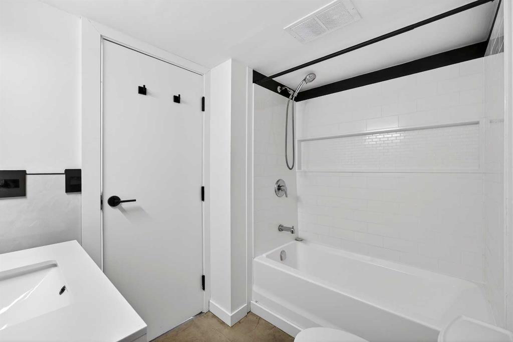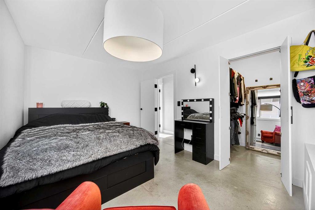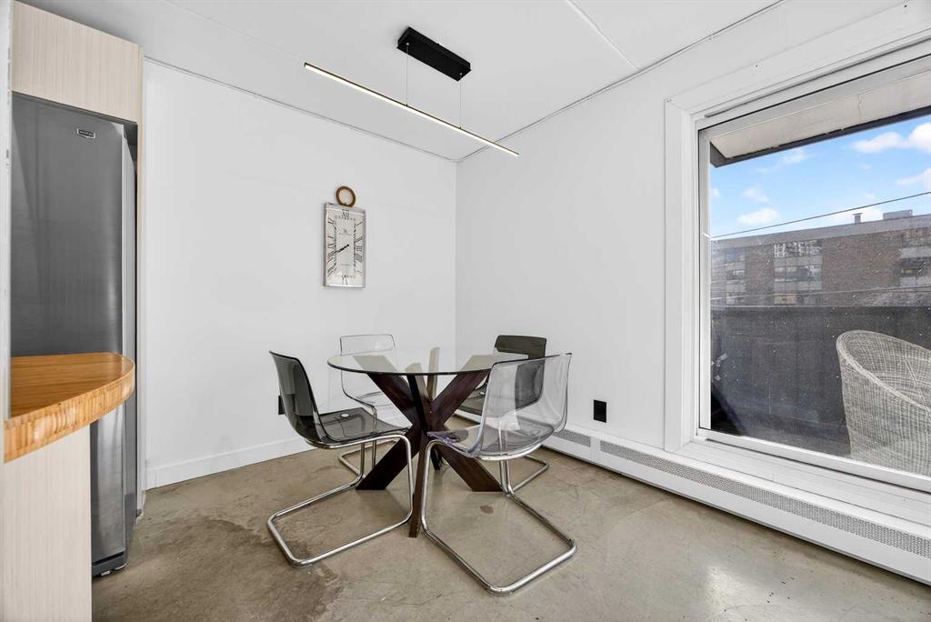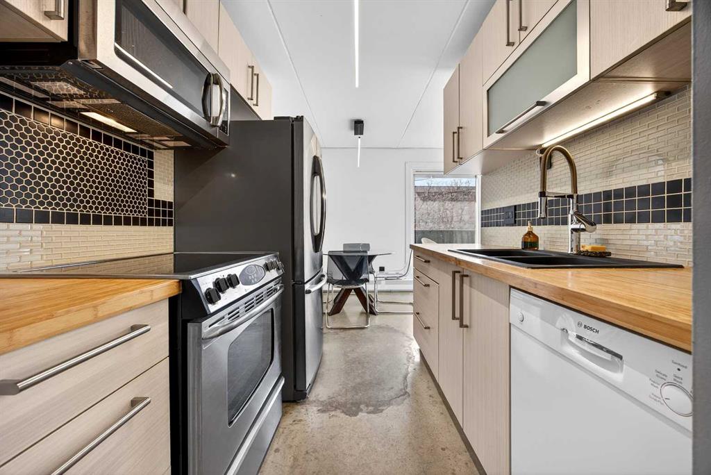 Welcome to this stylish corner unit showcasing a chic modern-industrial aesthetic and an abundance of natural light thanks to desirable south and east exposures. Thoughtfully designed, the open-concept kitchen impresses with stainless steel and coordinating white appliances, refreshed cabinetry, LED rope lighting, butcher block countertops, classic subway tile backsplash, an under-mount double sink, and generous drawer and cabinet storage. The spacious primary bedroom features a full walk-in closet, while the second bedroom—ideal as a home office or guest room—is bright, versatile, and well proportioned. The beautifully finished bathroom offers a contemporary floating vanity with drawer storage, a sleek tub/shower surround, and excellent lighting. A welcoming entry includes a full closet for coats and guests, along with an oversized storage closet that offers potential for in-suite laundry. Step outside to the oversized balcony and enjoy sunshine throughout the day—perfect for morning coffee or evening relaxation. The unbeatable location places you steps from trendy shops, cafés, micro-breweries, pubs, cocktail lounges, and a wide variety of restaurants, along with nearby parks, recreation facilities, river pathways, and vibrant inner-city amenities. Additional highlights include assigned parking, a dedicated storage locker, and a pet-friendly building (puppies up to 40 lbs with board approval). This is an outstanding opportunity to own a stylish, well-located home in the heart of the city.