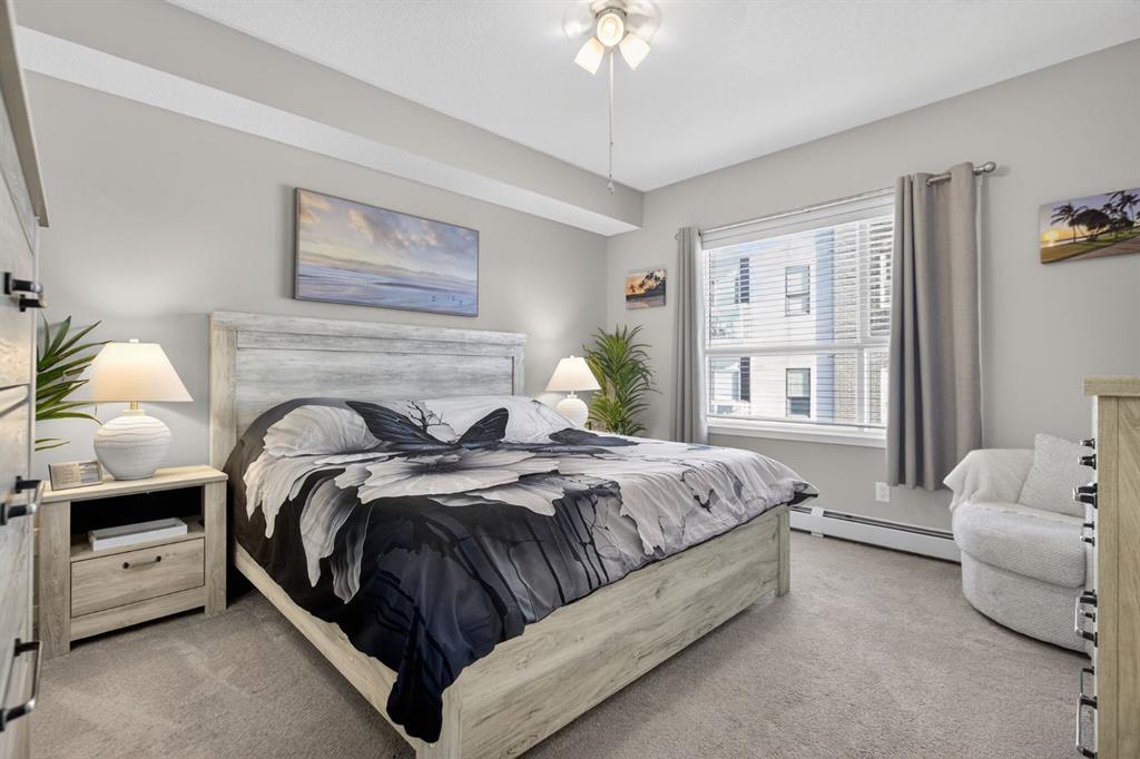 Welcome home to Seton Park Place II! This bright second-floor CORNER UNIT faces south and east, flooding the space with natural sunlight throughout the day — perfect for boosting both your mood and overall well-being. Offering 1,068 sq ft, this beautifully appointed condo features 2 bedrooms and 2 full bathrooms, along with one titled heated UNDERGROUND PARKING stall and TWO storage lockers — a rare and valuable bonus. Inside, you’ll love the abundance of windows, 9’ ceilings, luxury VINYL PLANK flooring, and the comfort of AIR CONDITIONING. The modern kitchen is designed for both style and function, complete with an extended island, QUARTZ countertops, and STAINLESS STEEL appliances — ideal for entertaining or everyday living. Step out from the dining area onto the wrap-around balcony and take in the open views. The spacious primary suite includes a 4-piece ensuite and a generous walk-in closet. A second bedroom and full bath provide flexibility for guests, family, or a home office. You’ll also appreciate the convenience of full-size in-suite laundry and ample in-unit storage. This well-maintained, professionally managed complex offers reasonable condo fees and is pet-friendly (with board approval). The location truly is unbeatable. Situated in the heart of Seton, you’re within a 10–15 minute walk to the YMCA, Cineplex, Superstore, restaurants, shops, walking paths, playgrounds, and more exciting amenities still to come. Enjoy a quick commute to the South Health Campus and easy access to Deerfoot and Stoney Trail. Urban convenience meets lifestyle living — all in one exceptional home.