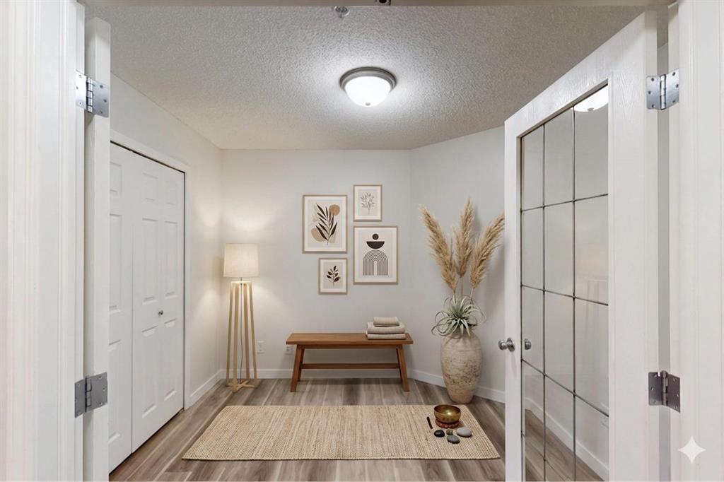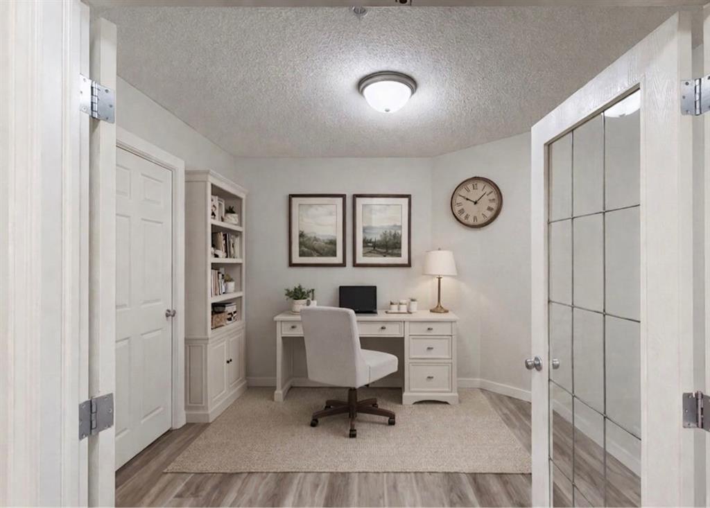 Welcome to this beautifully maintained main floor corner unit in the desirable community of Panorama! Offering 2 bedrooms plus a versatile den, this spacious open-concept layout is perfect for comfortable everyday living and entertaining alike. The modern interior features durable luxury vinyl plank flooring throughout, creating a seamless and stylish flow. The bright kitchen and living area open onto a rare wrap-around balcony, ideal for enjoying your morning coffee or unwinding in the evening. The well-appointed den provides flexible space for a home office, play room, or hobby area. Enjoy the convenience of in-unit laundry, titled underground parking, and an additional storage unit. Condo fees include all utilities, offering exceptional value and peace of mind. Located in a quiet, well-managed building just minutes from shopping, dining, parks, and transit, this home combines comfort, convenience, and lifestyle. A fantastic opportunity for first-time buyers, downsizers, or investors!
