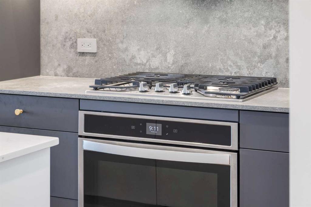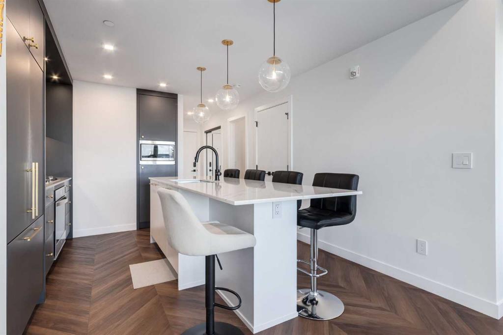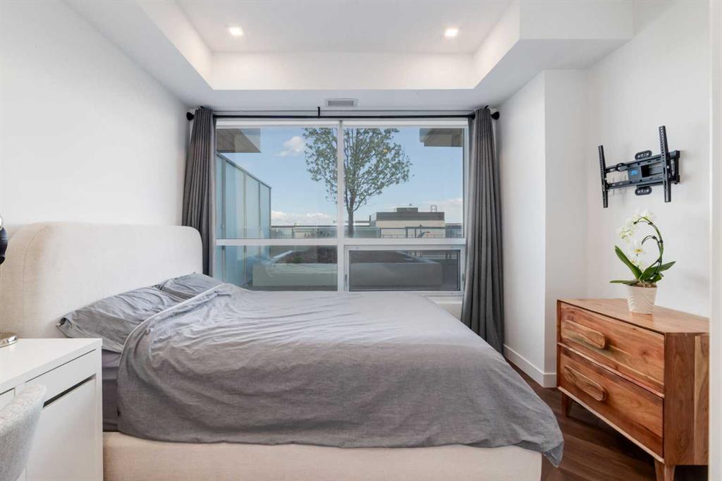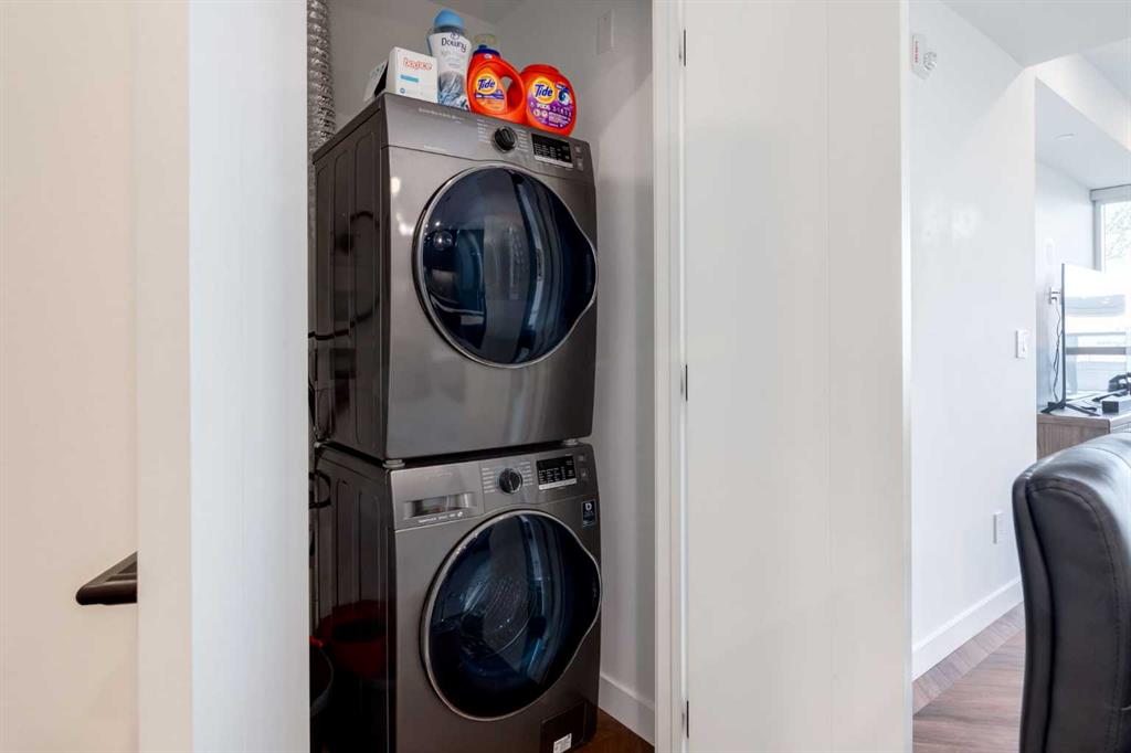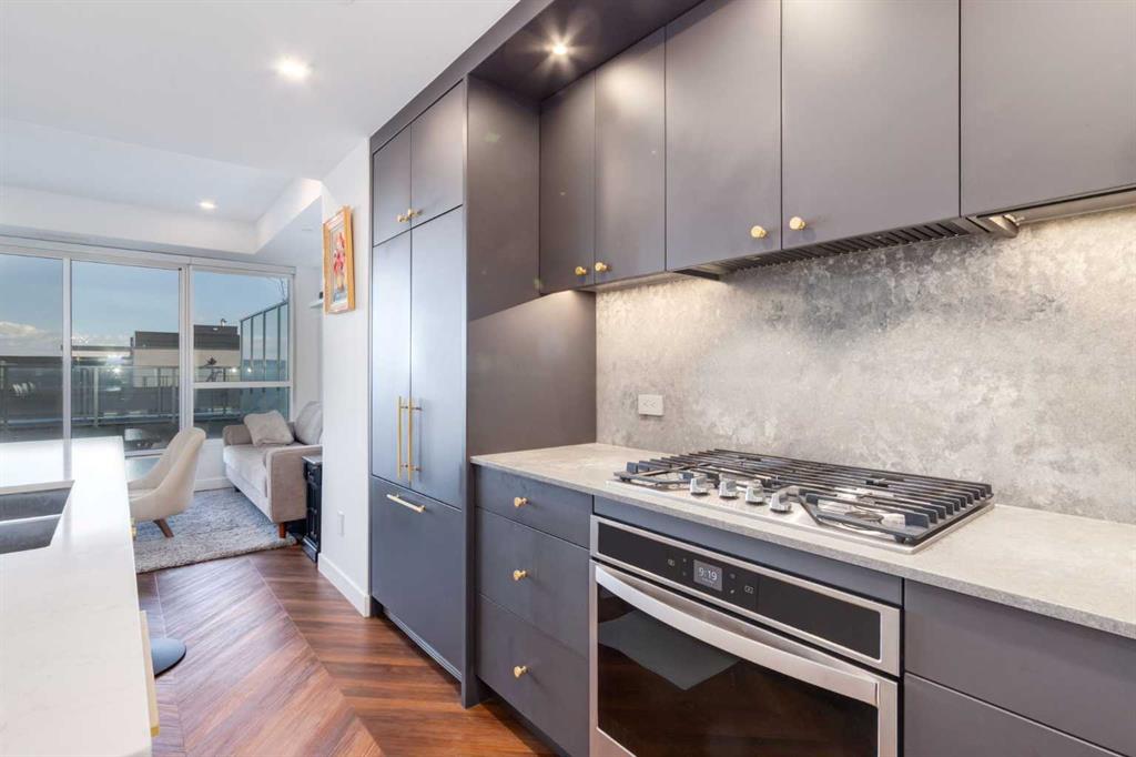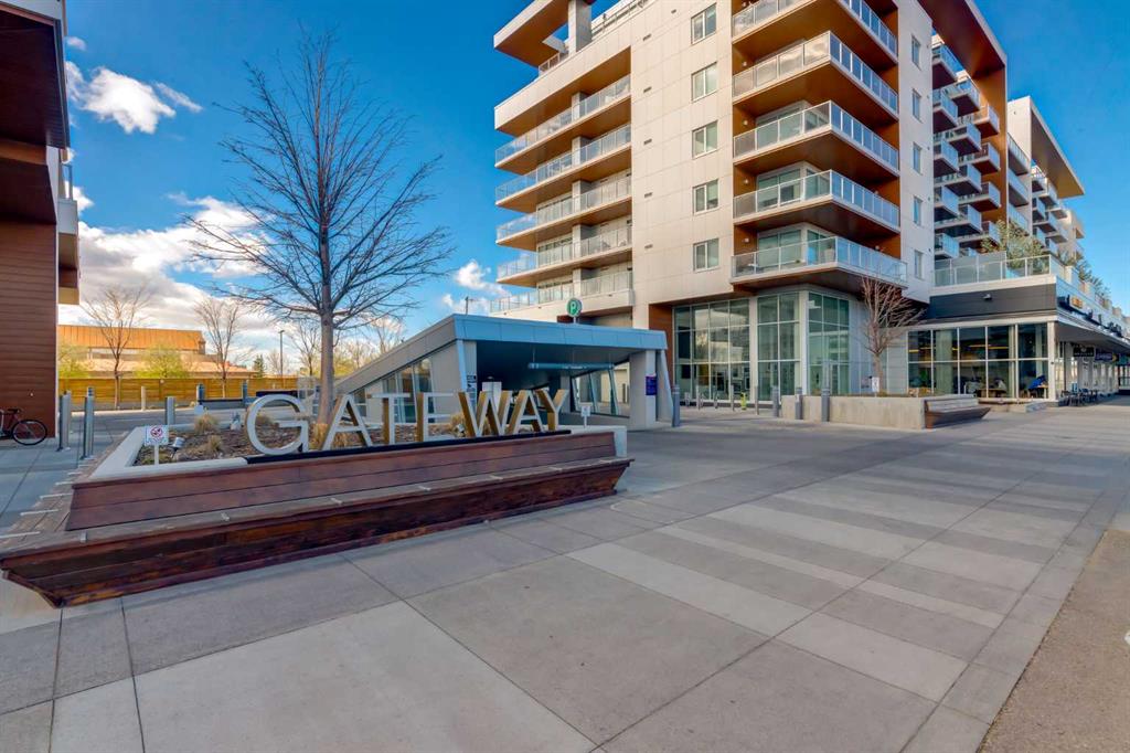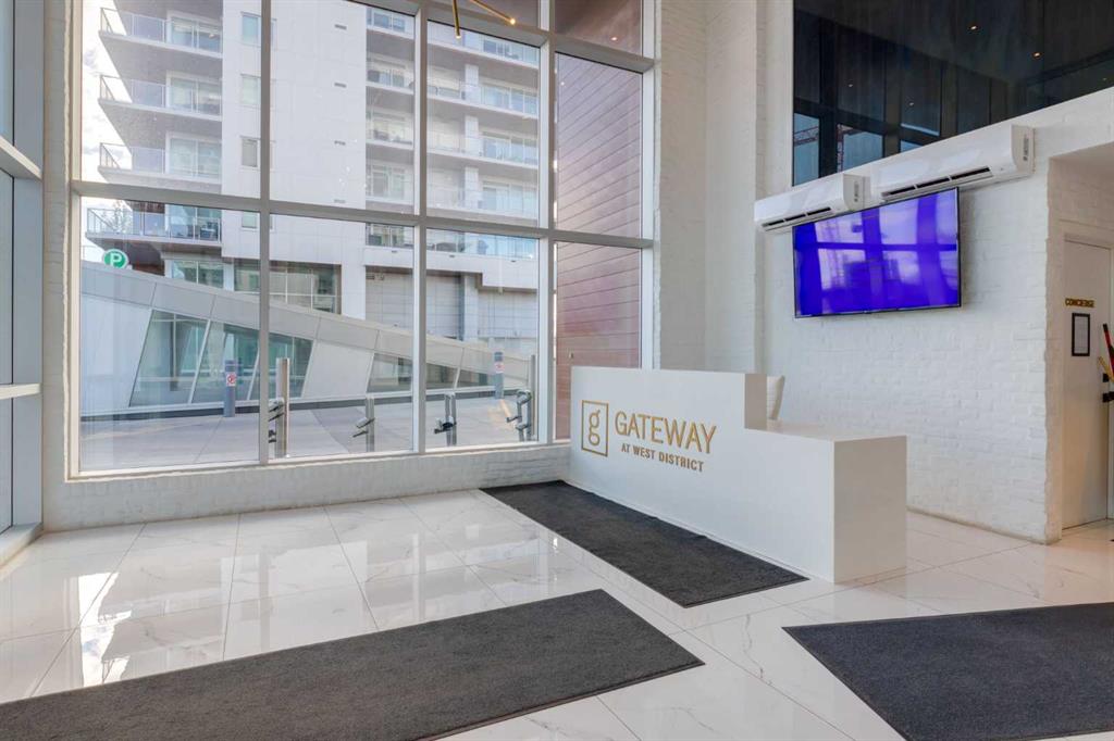 Priced to Sell! Welcome to Gateway by TRUMAN, nestled in the heart of the Master Planned community of West District. This concrete-constructed 2-bedroom, 2-bathroom home includes 1 titled underground parking stall and a spacious patio. Enjoy the pinnacle of craftsmanship and luxury with features like air conditioning, Chevron Luxury Wide plank flooring, and custom penny round mosaic tiles in all baths. LED pot lights illuminate the 9-foot+/- painted ceilings, enhancing the ambiance of the custom Chef-inspired kitchen. Finished in a luxurious Super Matte texture with brushed gold hardware, the kitchen boasts a high-end gas cooktop and wall oven, an integrated 36" Fisher & Paykel fridge, panelled dishwasher, and soft-close custom cabinetry with under-cabinet lighting. Quartz countertops and backsplash add a touch of sophistication. Additional features include a washer & dryer and window coverings for the floor-to-ceiling glass doors that lead to the expansive private patio. Located mere steps away from popular spots such as Hot Shop Yoga, Deville Coffee House, Hankki, La Diperie Ice Cream, Una, Blanco, and more! Gateway by TRUMAN offers a lifestyle of convenience and luxury in West District's thriving community.