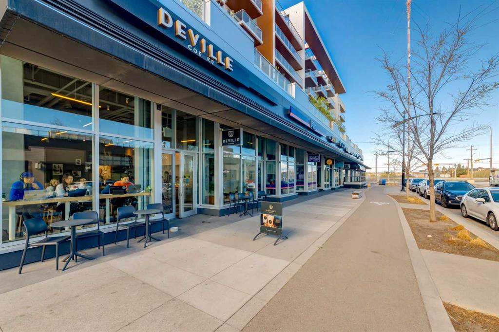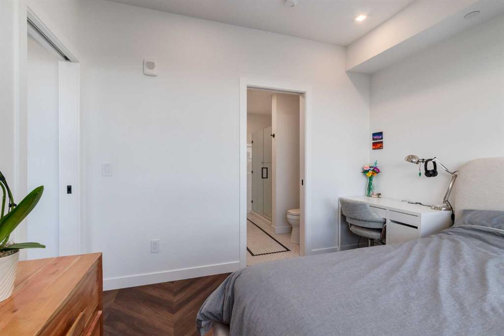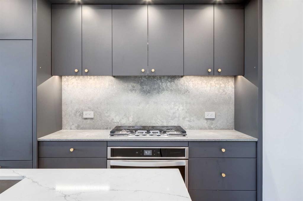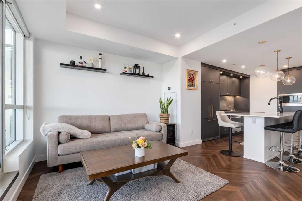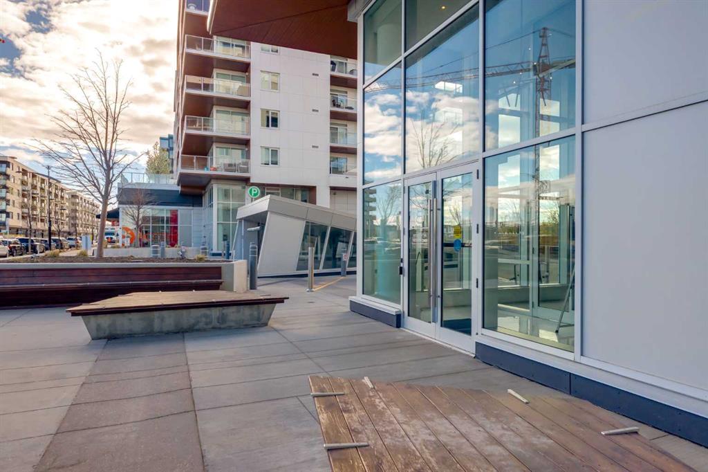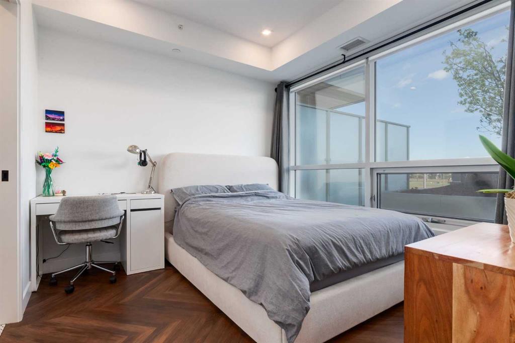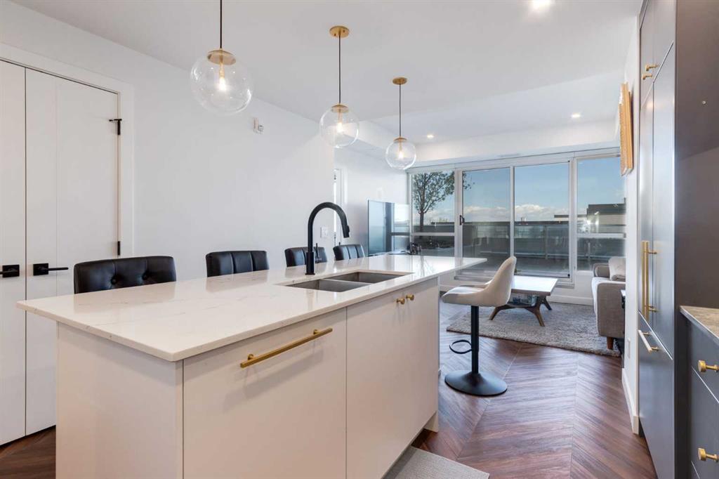 Priced to Sell! Welcome to Gateway by TRUMAN, nestled in the heart of the Master Planned community of West District. This concrete-constructed 2-bedroom, 2-bathroom home includes 1 titled underground parking stall and a spacious patio. Enjoy the pinnacle of craftsmanship and luxury with features like air conditioning, Chevron Luxury Wide plank flooring, and custom penny round mosaic tiles in all baths. LED pot lights illuminate the 9-foot+/- painted ceilings, enhancing the ambiance of the custom Chef-inspired kitchen. Finished in a luxurious Super Matte texture with brushed gold hardware, the kitchen boasts a high-end gas cooktop and wall oven, an integrated 36" Fisher & Paykel fridge, panelled dishwasher, and soft-close custom cabinetry with under-cabinet lighting. Quartz countertops and backsplash add a touch of sophistication. Additional features include a washer & dryer and window coverings for the floor-to-ceiling glass doors that lead to the expansive private patio. Located mere steps away from popular spots such as Hot Shop Yoga, Deville Coffee House, Hankki, La Diperie Ice Cream, Una, Blanco, and more! Gateway by TRUMAN offers a lifestyle of convenience and luxury in West District's thriving community.