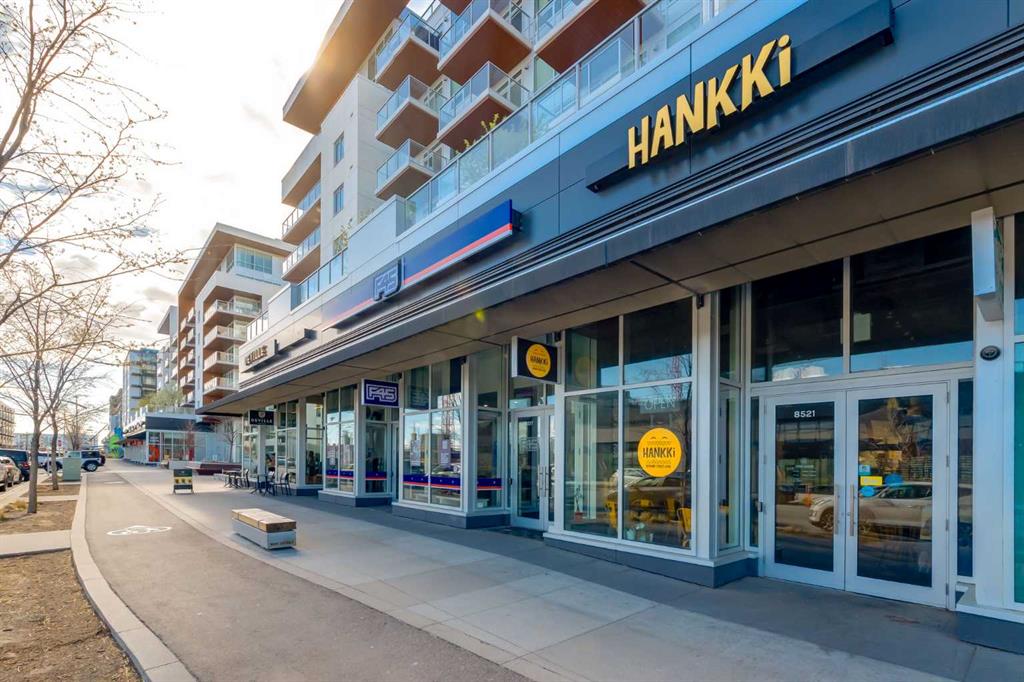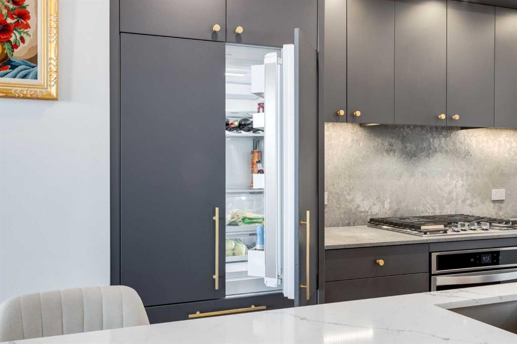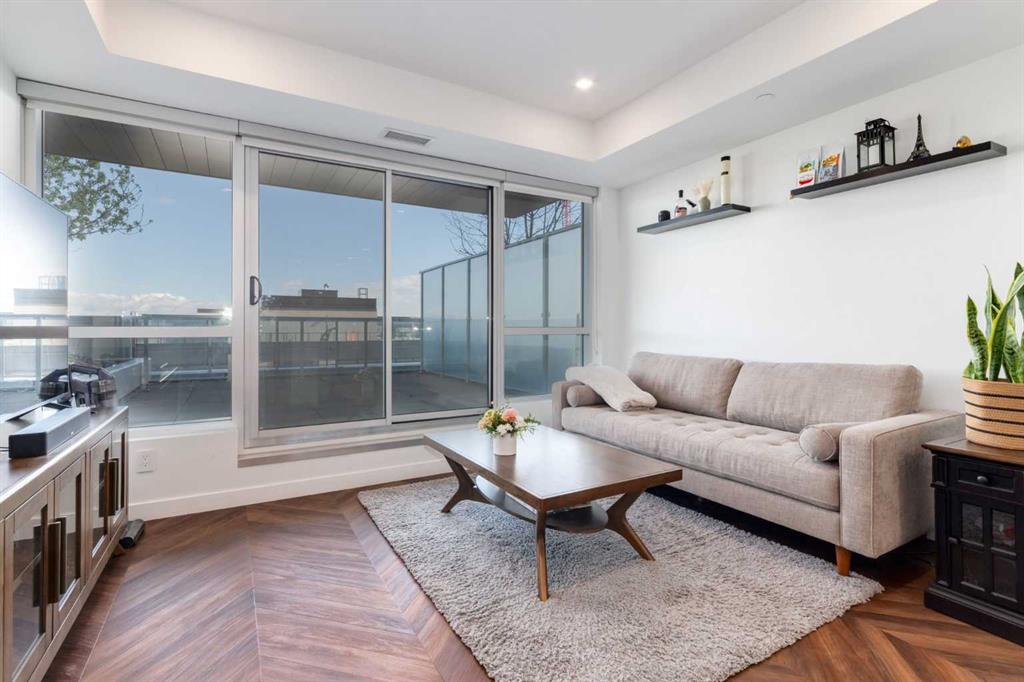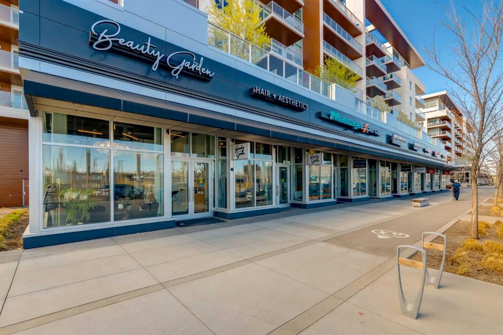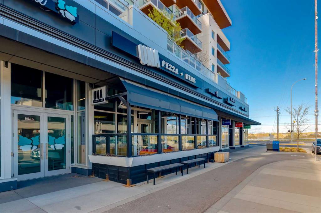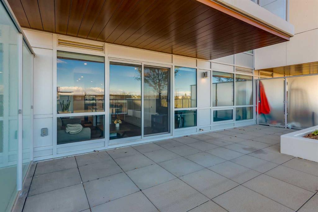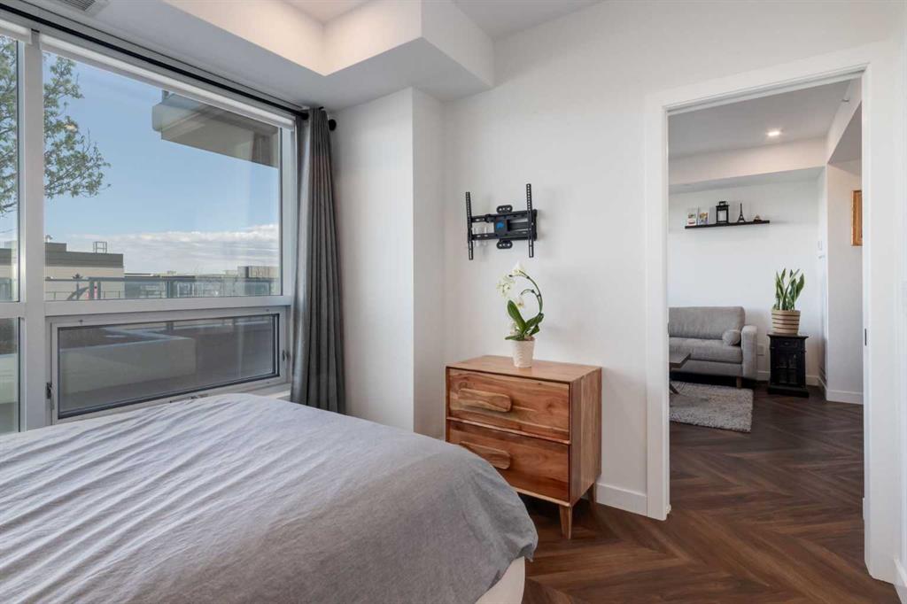 Priced to Sell! Welcome to Gateway by TRUMAN, nestled in the heart of the Master Planned community of West District. This concrete-constructed 2-bedroom, 2-bathroom home includes 1 titled underground parking stall and a spacious patio. Enjoy the pinnacle of craftsmanship and luxury with features like air conditioning, Chevron Luxury Wide plank flooring, and custom penny round mosaic tiles in all baths. LED pot lights illuminate the 9-foot+/- painted ceilings, enhancing the ambiance of the custom Chef-inspired kitchen. Finished in a luxurious Super Matte texture with brushed gold hardware, the kitchen boasts a high-end gas cooktop and wall oven, an integrated 36" Fisher & Paykel fridge, panelled dishwasher, and soft-close custom cabinetry with under-cabinet lighting. Quartz countertops and backsplash add a touch of sophistication. Additional features include a washer & dryer and window coverings for the floor-to-ceiling glass doors that lead to the expansive private patio. Located mere steps away from popular spots such as Hot Shop Yoga, Deville Coffee House, Hankki, La Diperie Ice Cream, Una, Blanco, and more! Gateway by TRUMAN offers a lifestyle of convenience and luxury in West District's thriving community.
