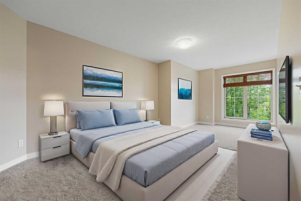 Immaculate 2 bedroom, 2 bath condo offering over 1,100 sq ft of modern living space in the desirable Evergreen SW community. This bright and well-maintained home features dark laminate floors, a spacious Master suite with a walk-in-closet and 4-piece ensuite bath. The second bedroom is ideal as a guest room or home office, with an additional 4-piece bathroom nearby. Enjoy the sun-filled living room with large windows and access to a private balcony to enjoy BBQ with friends or just relaxing evening coffee. . The dining area boasts vaulted ceilings, while the kitchen offers a center breakfast island, corner pantry and stainless steel appliances. Additional highlights include in-suite laundry, two parking stalls, and condo fees that include heat, water and sewer. Conveniently located with shops adjacent to the complex, and close to shopping, schools, parks and the scenic Stoney Trail. You will not be disappointed!